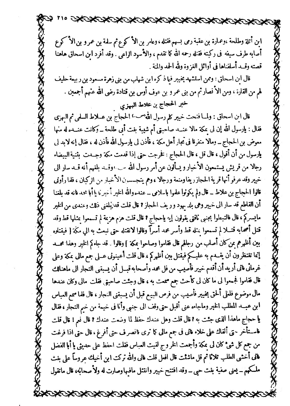 قَالَ ابْنُ إِسْحَاقَ: وَلَمَّا فُتِحَتْ خَيْبَرُ كَلَّمَ رَسُولُ اللَّهِ صَلَّى اللَّهُ عَلَيْهِ وَسَلَّمَ الْحَجَّاجُ بْنُ عِلَاطٍ السُّلَمِيُّ ثُمَّ الْبَهْزِيُّ فَقَالَ: يَا رَسُولَ اللَّهِ إِنَّ لِي بِمَكَّةَ مَالًا عِنْدَ صَاحِبَتِي أُمِّ شَيْبَةَ بِنْتِ أبى طلحة- وكانت عنده له منها معوض بْنُ الْحَجَّاجِ- وَمَالًا مُتَفَرِّقًا فِي تُجَّارِ أَهْلِ مَكَّةَ، فَأْذَنْ لِي يَا رَسُولَ اللَّهِ فَأَذِنَ لَهُ، فَقَالَ إِنَّهُ لَا بُدَّ لِي يَا رسول من أَنْ أَقُولَ، قَالَ قُلْ، قَالَ الْحَجَّاجُ: فَخَرَجْتُ حَتَّى إِذَا قَدِمْتُ مَكَّةَ وَجَدْتُ بِثَنِيَّةِ الْبَيْضَاءِ رِجَالًا مِنْ قُرَيْشٍ يَسْتَمِعُونَ الْأَخْبَارَ وَيَسْأَلُونَ عَنْ أَمْرِ رَسُولِ اللَّهِ صَلَّى اللَّهُ عَلَيْهِ وَسَلَّمَ وَقَدْ بَلَغَهُمْ أَنَّهُ قَدْ سَارَ إِلَى خَيْبَرَ وَقَدْ عَرَفُوا أَنَّهَا قَرْيَةُ الْحِجَازِ رِيفًا وَمَنَعَةً وَرِجَالًا، وَهُمْ يَتَجَسَّسُونَ الْأَخْبَارَ مِنَ الرُّكْبَانِ، فَلَمَّا رَأَوْنِي قَالُوا الْحَجَّاجُ بْنُ عِلَاطٍ- قَالَ وَلَمْ يَكُونُوا عَلِمُوا بِإِسْلَامِي- عِنْدَهُ وَاللَّهِ الْخَبَرُ أَخْبِرْنَا يَا أَبَا مُحَمَّدٍ فَإِنَّهُ قَدْ بَلَغَنَا أَنَّ الْقَاطِعَ قَدْ سَارَ إِلَى خَيْبَرَ وَهِيَ بَلَدُ يَهُودَ وَرِيفُ الْحِجَازِ؟ قَالَ قُلْتُ قَدْ بَلَغَنِي ذَلِكَ وَعِنْدِي مِنَ الْخَبَرِ مَا يَسُرُّكُمْ، قَالَ فَالْتَبَطُوا بِجَنْبَيْ نَاقَتِي يَقُولُونَ إِيهٍ يَا حَجَّاجُ؟ قَالَ قُلْتُ هُزِمَ هَزِيمَةً لَمْ تَسْمَعُوا بِمِثْلِهَا قَطُّ وَقَدْ قُتِلَ أَصْحَابُهُ قَتْلًا لَمْ تَسْمَعُوا بِمِثْلِهِ قَطُّ وَأُسِرَ مُحَمَّدٌ أَسْرًا وَقَالُوا لَا نَقْتُلُهُ حَتَّى نَبْعَثَ بِهِ إِلَى مَكَّةَ [فَيَقْتُلُوهُ بَيْنَ أَظْهُرِهِمْ بِمَنْ كَانَ أَصَابَ مِنْ رِجَالِهِمْ قَالَ فَقَامُوا وَصَاحُوا بِمَكَّةَ] وَقَالُوا: قَدْ جَاءَكُمُ الْخَبَرُ وَهَذَا مُحَمَّدٌ إِنَّمَا تَنْتَظِرُونَ أَنْ يُقْدَمَ بِهِ عَلَيْكُمْ فَيُقْتَلَ بَيْنَ أَظْهُرِكُمْ، قَالَ قُلْتُ أَعِينُونِي عَلَى جَمْعِ مَالِي بِمَكَّةَ وَعَلَى غُرَمَائِي فَإِنِّي أُرِيدُ أَنْ أَقْدِمَ خَيْبَرَ فَأُصِيبَ مِنْ فَلِّ مُحَمَّدٍ وَأَصْحَابِهِ قَبْلَ أَنْ يَسْبِقَنِي التُّجَّارُ إِلَى مَا هُنَالِكَ قَالَ فَقَامُوا فَجَمَعُوا لِي مَا كَانَ لِي كَأَحَثِّ جَمْعٍ سَمِعْتُ بِهِ، قَالَ وَجِئْتُ صَاحِبَتِي فَقُلْتُ مَالِي وَكَانَ عِنْدَهَا مَالٌ مَوْضُوعٌ فَلَعَلِّي أَلْحَقُ بِخَيْبَرَ فَأُصِيبَ مِنْ فُرَصِ الْبَيْعِ قَبْلَ أَنْ يَسْبِقَنِي التُّجَّارُ، قَالَ فلما سمع العباس ابن عبد المطلب الخبر وما جاءه عَنِّي أَقْبَلَ حَتَّى وَقَفَ إِلَى جَنْبِي وَأَنَا في خيمة من خيم التُّجَّارِ، فَقَالَ يَا حَجَّاجُ مَا هَذَا الَّذِي جِئْتَ بِهِ؟ قَالَ قُلْتُ وَهَلْ عِنْدَكَ حِفْظٌ لِمَا وَضَعْتُ عِنْدَكَ؟ قَالَ نَعَمْ! قَالَ قُلْتُ فاستأخر حَتَّى أَلْقَاكَ عَلَى خَلَاءٍ فَإِنِّي فِي جَمْعِ مالي كما ترى فانصرف حَتَّى أَفْرُغَ، قَالَ حَتَّى إِذَا فَرَغْتُ مِنْ جَمْعِ كَلِّ شَيْءٍ كَانَ لِي بِمَكَّةَ وَأَجْمَعْتُ الْخُرُوجَ لَقِيتُ الْعَبَّاسَ فَقُلْتُ احْفَظْ عَلَيَّ حَدِيثِي يَا أَبَا الْفَضْلِ فَإِنِّي أَخْشَى الطَّلَبَ ثَلَاثًا ثُمَّ قُلْ مَا شِئْتَ قَالَ أَفْعَلُ قُلْتُ فانى والله تَرَكْتُ ابْنَ أَخِيكَ عَرُوسًا عَلَى بِنْتِ مَلِكِهِمْ- يَعْنِي صَفِيَّةَ بِنْتَ حُيَيٍّ- وَقَدِ افْتَتَحَ خَيْبَرَ وَانْتَثَلَ مَا فِيهَا وَصَارَتْ لَهُ وَلِأَصْحَابِهِ، قَالَ ما تقول