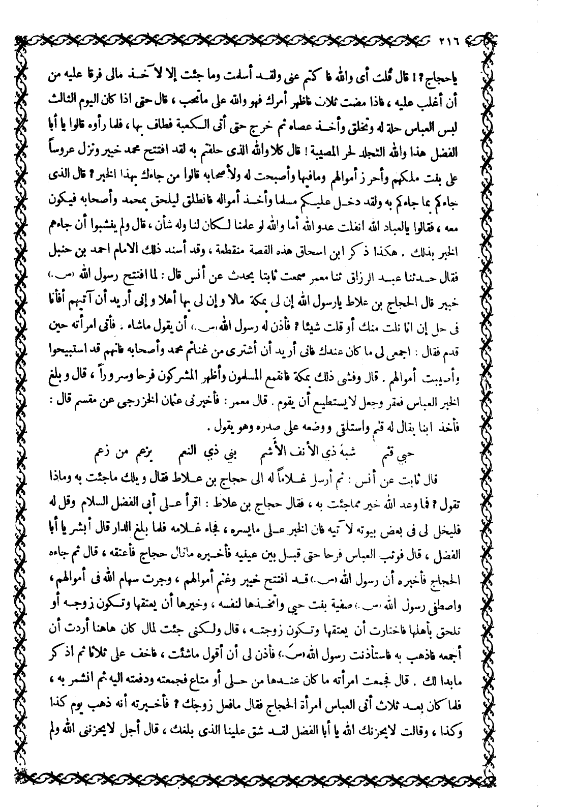 يَا حَجَّاجُ؟! قَالَ قُلْتُ إِي وَاللَّهِ فَاكْتُمْ عَنِّي وَلَقَدْ أَسْلَمْتُ وَمَا جِئْتُ إِلَّا لِآخُذَ مالي فرقا عليه مِنْ أَنْ أُغْلَبَ عَلَيْهِ، فَإِذَا مَضَتْ ثَلَاثٌ فَأَظْهِرْ أَمْرَكَ فَهُوَ وَاللَّهِ عَلَى مَا تُحِبُ، قَالَ حَتَّى إِذَا كَانَ الْيَوْمُ الثَّالِثُ لَبِسَ الْعَبَّاسُ حُلَّةً لَهُ وَتَخَلَّقَ وَأَخْذَ عَصَاهُ ثُمَّ خَرَجَ حَتَّى أَتَى الْكَعْبَةَ فَطَافَ بِهَا، فَلَمَّا رَأَوْهُ قَالُوا يَا أَبَا الْفَضْلِ هَذَا وَاللَّهِ التَّجَلُّدُ لِحَرِّ الْمُصِيبَةِ! قَالَ كَلَّا وَاللَّهِ الَّذِي حلفتم به لقد افتتح محمد خيبر ونزل عَرُوسًا عَلَى بِنْتِ مَلِكِهِمْ وَأَحْرَزَ أَمْوَالَهُمْ وَمَا فِيهَا وَأَصْبَحَتْ لَهُ وَلِأَصْحَابِهِ قَالُوا مَنْ جَاءَكَ بهذا الخير؟ قَالَ الَّذِي جَاءَكُمْ بِمَا جَاءَكُمْ بِهِ وَلَقَدْ دخل عليكم مسلما وأخذ أمواله فَانْطَلَقَ لِيَلْحَقَ بِمُحَمَّدٍ وَأَصْحَابِهِ فَيَكُونُ مَعَهُ، فَقَالُوا يَا لِعِبَادِ اللَّهِ انْفَلَتَ عَدُوُّ اللَّهِ أَمَا وَاللَّهِ لَوْ عَلِمْنَا لَكَانَ لَنَا وَلَهُ شَأْنٌ، قَالَ وَلَمْ يَنْشَبُوا أَنْ جَاءَهُمُ الْخَبَرُ بِذَلِكَ. هَكَذَا ذَكَرَ ابْنُ إِسْحَاقَ هَذِهِ الْقِصَّةَ مُنْقَطِعَةً، وَقَدْ أَسْنَدَ ذَلِكَ الْإِمَامُ أَحْمَدُ بْنُ حَنْبَلٍ فَقَالَ حَدَّثَنَا عَبْدُ الرَّزَّاقِ ثَنَا مَعْمَرٌ سَمِعْتُ ثَابِتًا يُحَدِّثُ عَنْ أَنَسٍ قَالَ: لَمَّا افْتَتَحَ رَسُولُ اللَّهِ صَلَّى اللَّهُ عَلَيْهِ وسلم خيبر قَالَ الْحَجَّاجُ بْنُ عِلَاطٍ يَا رَسُولَ اللَّهِ إِنَّ لِي بِمَكَّةَ مَالًا وَإِنَّ لِي بِهَا أَهْلًا وَإِنِّي أُرِيدُ أَنْ آتِيَهُمْ أَفَأَنَا فِي حِلٍّ إِنْ أَنَا نِلْتُ مِنْكَ أَوْ قُلْتُ شَيْئًا؟ فَأَذِنَ لَهُ رَسُولُ اللَّهِ صَلَّى اللَّهُ عَلَيْهِ وَسَلَّمَ أَنْ يَقُولَ مَا شَاءَ. فَأَتَى امْرَأَتَهُ حِينَ قَدِمَ فَقَالَ: اجْمَعِي لِي مَا كَانَ عِنْدَكِ فَإِنِّي أُرِيدُ أَنْ أَشْتَرِيَ مِنْ غَنَائِمِ مُحَمَّدٍ وَأَصْحَابِهِ فَإِنَّهُمْ قَدِ اسْتُبِيحُوا وَأُصِيبَتْ أموالهم. قال وفشا ذَلِكَ بِمَكَّةَ فَانْقَمَعَ الْمُسْلِمُونَ وَأَظْهَرَ الْمُشْرِكُونَ فَرَحًا وَسُرُورًا، قَالَ وَبَلَغَ الْخَبَرُ الْعَبَّاسَ فَعُقِرَ وَجَعَلَ لَا يَسْتَطِيعُ أَنْ يَقُومَ. قَالَ مَعْمَرٌ: فَأَخْبَرَنِي عثمان الخزرجي عن مقسم قال: