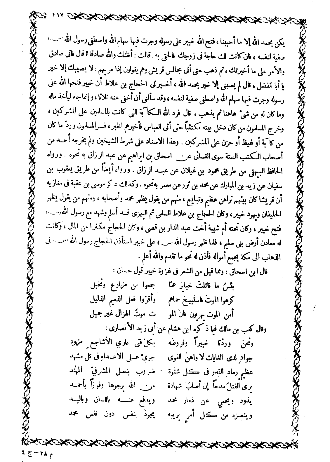 يَكُنْ بِحَمْدِ اللَّهِ إِلَّا مَا أَحْبَبْنَا، فَتَحَ اللَّهُ خَيْبَرَ عَلَى رَسُولِهِ وَجَرَتْ فِيهَا سِهَامُ اللَّهِ وَاصْطَفَى رَسُولُ اللَّهِ صَلَّى اللَّهُ عَلَيْهِ وَسَلَّمَ صَفِيَّةَ لِنَفْسِهِ، فَإِنْ كَانَتْ لَكِ حَاجَةٌ فِي زَوْجِكِ فَالْحَقِي بِهِ. قَالَتْ: أَظُنُّكَ وَاللَّهِ صَادِقًا؟ قَالَ فَإِنِّي صَادِقٌ وَالْأَمْرُ عَلَى مَا أَخْبَرْتُكِ، ثُمَّ ذَهَبَ حَتَّى أَتَى مَجَالِسَ قُرَيْشٍ وَهُمْ يَقُولُونَ إِذَا مَرَّ بِهِمْ: لَا يُصِيبُكَ إِلَّا خَيْرٌ يَا أَبَا الْفَضْلِ، قَالَ لَمْ يصبني إلا خير بحمد للَّه، أَخْبَرَنِي الْحَجَّاجُ بْنُ عِلَاطٍ أَنَّ خَيْبَرَ فَتَحَهَا اللَّهُ عَلَى رَسُولِهِ وَجَرَتْ فِيهَا سِهَامُ اللَّهِ وَاصْطَفَى صَفِيَّةَ لِنَفْسِهِ، وَقَدْ سَأَلَنِي أَنْ أُخْفِيَ عنه ثَلَاثًا، وَإِنَّمَا جَاءَ لِيَأْخُذَ مَالَهُ وَمَا كَانَ لَهُ مِنْ شَيْءٍ هَاهُنَا ثُمَّ يَذْهَبُ، قَالَ فَرَدَّ اللَّهُ الْكَآبَةَ الَّتِي كَانَتْ بِالْمُسْلِمِينَ عَلَى المشركين، وخرج المسلمون من كَانَ دَخَلَ بَيْتَهُ مُكْتَئِبًا حَتَّى أَتَى الْعَبَّاسَ فَأَخْبَرَهُمُ الْخَبَرَ، فَسُرَّ الْمُسْلِمُونَ وَرَدَّ مَا كَانَ مِنْ كَآبَةٍ أَوْ غَيْظٍ أَوْ حُزْنٍ عَلَى الْمُشْرِكِينَ. وَهَذَا الْإِسْنَادُ عَلَى شَرْطِ الشَّيْخَيْنِ وَلَمْ يُخْرِجْهُ أَحَدٌ مِنْ أَصْحَابِ الْكُتُبِ السِّتَّةِ سِوَى النَّسَائِيِّ عَنْ إِسْحَاقَ بْنِ إِبْرَاهِيمَ عَنْ عَبْدِ الرَّزَّاقِ بِهِ نَحْوَهُ. وَرَوَاهُ الْحَافِظُ الْبَيْهَقِيُّ مِنْ طَرِيقِ مَحْمُودِ بْنِ غَيْلَانَ عَنْ عَبْدِ الرَّزَّاقِ. وَرَوَاهُ أَيْضًا مِنْ طَرِيقِ يَعْقُوبَ بْنِ سُفْيَانَ عَنْ زَيْدِ بْنِ الْمُبَارَكِ عَنْ مُحَمَّدِ بْنِ ثَوْرٍ عَنْ مَعْمَرٍ بِهِ نَحْوَهُ. وَكَذَلِكَ ذَكَرَ مُوسَى بْنُ عُقْبَةَ فِي مَغَازِيهِ أَنَّ قُرَيْشًا كَانَ بَيْنَهُمْ تَرَاهُنٌ عَظِيمٌ وَتَبَايُعٌ، مِنْهُمْ مَنْ يَقُولُ يَظْهَرُ مُحَمَّدٌ وَأَصْحَابُهُ، وَمِنْهُمْ مَنْ يَقُولُ يَظْهَرُ الْحَلِيفَانِ وَيَهُودُ خَيْبَرَ، وَكَانَ الْحَجَّاجُ بْنُ عِلَاطٍ السُّلَمِيُّ ثُمَّ الْبَهْزِيُّ قَدْ أَسْلَمَ وَشَهِدَ مَعَ رَسُولِ اللَّهِ صَلَّى اللَّهُ عَلَيْهِ وَسَلَّمَ فَتَحَ خَيْبَرَ، وَكَانَ تَحْتَهُ أُمُّ شَيْبَةَ أُخْتُ عَبْدِ الدَّارِ بْنِ قُصَيٍّ، وَكَانَ الْحَجَّاجُ مُكْثِرًا مِنَ الْمَالِ، وَكَانَتْ لَهُ مَعَادِنُ أَرْضِ بَنِي سُلَيْمٍ، فَلَمَّا ظَهَرَ رَسُولُ اللَّهِ صَلَّى اللَّهُ عَلَيْهِ وَسَلَّمَ عَلَى خَيْبَرَ اسْتَأْذَنَ الْحَجَّاجُ رَسُولَ اللَّهِ صَلَّى اللَّهُ عَلَيْهِ وَسَلَّمَ فِي الذَّهَابِ الى مكة يجمع أمواله فأذن له نَحْوَ مَا تَقَدَّمَ وَاللَّهُ أَعْلَمُ.
