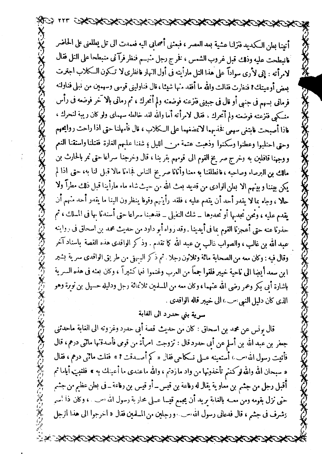 أَتَيْنَا بَطْنَ الْكَدِيدِ فَنَزَلْنَا عَشِيَّةً بَعْدِ الْعَصْرِ، فَبَعَثَنِي أَصْحَابِي إِلَيْهِ فَعَمَدْتُ إِلَى تَلٍّ يُطْلِعُنِي عَلَى الْحَاضِرِ فَانْبَطَحْتُ عَلَيْهِ وَذَلِكَ قَبْلَ غُرُوبِ الشَّمْسِ، فَخَرَجَ رَجُلٌ مِنْهُمْ فَنَظَرَ فَرَآنِي مُنْبَطِحًا عَلَى التَّلِّ فَقَالَ لِامْرَأَتِهِ: إِنِّي لَأَرَى سَوَادًا عَلَى هَذَا التَّلِّ مَا رَأَيْتُهُ فِي أَوَّلِ النَّهَارِ فَانْظُرِي لَا تَكُونُ الْكِلَابُ اجْتَرَّتْ بَعْضَ أَوْعِيَتِكِ؟ فَنَظَرَتْ فَقَالَتْ وَاللَّهِ مَا أَفْقِدُ مِنْهَا شَيْئًا، قَالَ فَنَاوِلِينِي قَوْسِي وَسَهْمَيْنِ مِنْ نَبْلِي فناولته فرماني بسهم في جنبي أو قال في جبيني فَنَزَعْتُهُ فَوَضَعْتُهُ وَلَمْ أَتَحَرَّكْ، ثُمَّ رَمَانِي بِالْآخَرِ فَوَضَعَهُ فِي رَأْسِ مَنْكِبِي فَنَزَعْتُهُ فَوَضَعْتُهُ وَلَمْ أَتَحَرَّكْ، فَقَالَ لِامْرَأَتِهِ أَمَا وَاللَّهِ لَقَدْ خَالَطَهُ سهماي ولو كان ريبة لَتَحَرَّكَ، فَإِذَا أَصْبَحْتِ فَابْتَغِي سَهْمَيَّ فَخُذِيهِمَا لَا تَمْضُغُهُمَا عَلَيَّ الْكِلَابُ، قَالَ فَأَمْهَلْنَا حَتَّى إِذَا راحت روائحهم وَحَتَّى احْتَلَبُوا وَعَطَّنُوا وَسَكَنُوا وَذَهَبَتْ عَتَمَةٌ مِنَ اللَّيْلِ، شَنَنَّا عَلَيْهِمُ الْغَارَةَ فَقَتَلْنَا وَاسْتَقْنَا النَّعَمَ وَوَجَّهْنَا قَافِلِينَ بِهِ وَخَرَجَ صَرِيخُ الْقَوْمِ إِلَى قَوْمِهِمْ بِقُرْبِنَا، قَالَ وَخَرَجْنَا سِرَاعًا حَتَّى نَمُرَّ بِالْحَارِثِ بْنِ مَالِكِ بْنِ الْبَرْصَاءِ وَصَاحِبِهِ، فَانْطَلَقْنَا بِهِ مَعَنَا وَأَتَانَا صَرِيخُ النَّاسِ فَجَاءَنَا مَا لَا قِبَلَ لَنَا بِهِ، حَتَّى إِذَا لَمْ يَكُنْ بَيْنَنَا وَبَيْنَهُمْ إِلَّا بَطْنُ الْوَادِي مِنْ قُدَيْدٍ بَعَثَ اللَّهُ مِنْ حَيْثُ شَاءَ مَاءً مَا رَأَيْنَا قَبْلَ ذَلِكَ مَطَرًا وَلَا حَالًا، وَجَاءَ بِمَا لَا يَقْدِرُ أَحَدٌ أَنْ يُقْدِمَ عَلَيْهِ، فَلَقَدْ رَأَيْتُهُمْ وُقُوفًا يَنْظُرُونَ إِلَيْنَا مَا يَقْدِرُ أَحَدٌ مِنْهُمْ أَنْ يُقْدِمَ عَلَيْهِ، وَنَحْنُ نجدبها أَوْ نَحْدُوهَا- شَكَّ النُّفَيْلِيُّ- فَذَهَبْنَا سِرَاعًا حَتَّى أسندنا بها في المسلك، ثم حذرنا عَنْهُ حَتَّى أَعْجَزْنَا الْقَوْمَ بِمَا فِي أَيْدِينَا. وَقَدْ رَوَاهُ أَبُو دَاوُدَ مِنْ حَدِيثِ مُحَمَّدِ بن إسحاق فِي رِوَايَتِهِ عَبْدُ اللَّهِ بْنُ غَالِبٍ، وَالصَّوَابُ غَالِبُ بْنُ عَبْدِ اللَّهِ كَمَا تَقَدَّمَ. وَذَكَرَ الْوَاقِدِيُّ هَذِهِ الْقِصَّةَ بِإِسْنَادٍ آخَرَ وَقَالَ فِيهِ: وَكَانَ مَعَهُ مِنَ الصَّحَابَةِ مِائَةٌ وَثَلَاثُونَ رَجُلًا. ثُمَّ ذَكَرَ الْبَيْهَقِيُّ مِنْ طَرِيقِ الْوَاقِدِيِّ سَرِيَّةَ بشير ابن سَعْدٍ أَيْضًا إِلَى نَاحِيَةِ خَيْبَرَ فَلَقُوا جَمْعًا مِنَ الْعَرَبِ وَغَنِمُوا نَعَمًا كَثِيرًا، وَكَانَ بَعْثُهُ فِي هَذِهِ السَّرِيَّةِ بِإِشَارَةِ أَبِي بَكْرٍ وَعُمَرَ رَضِيَ اللَّهُ عَنْهُمَا، وَكَانَ مَعَهُ مِنَ الْمُسْلِمِينَ ثَلَاثُمِائَةِ رَجُلٍ وَدَلِيلُهُ حُسَيْلُ بْنُ نُوَيْرَةَ وَهُوَ الَّذِي كَانَ دَلِيلُ النَّبِيِّ صَلَّى اللَّهُ عَلَيْهِ وَسَلَّمَ إِلَى خَيْبَرَ قَالَهُ الْوَاقِدِيُّ.