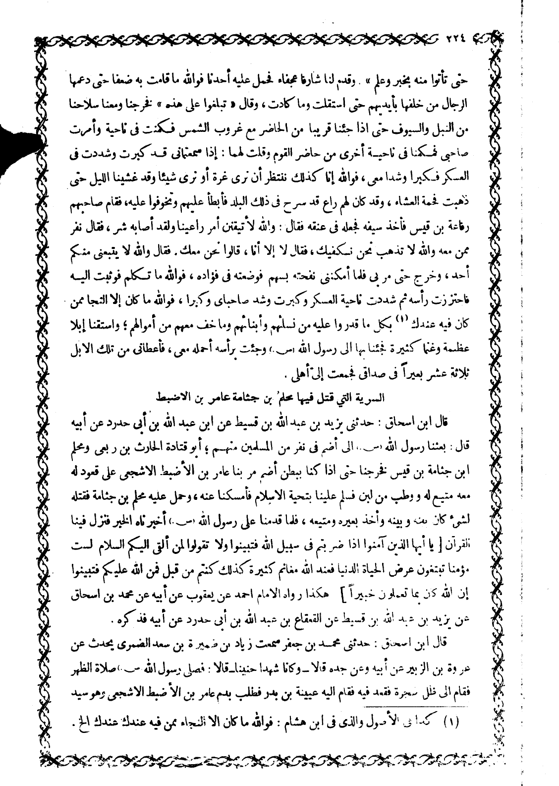 قَالَ ابْنُ إِسْحَاقَ: حَدَّثَنِي يَزِيدَ بْنِ عَبْدِ اللَّهِ بْنِ قُسَيْطٍ عَنْ ابْنِ عَبْدِ اللَّهِ بْنِ أَبِي حَدْرَدٍ عَنْ أَبِيهِ قَالَ: بَعَثَنَا رَسُولُ اللَّهِ صَلَّى اللَّهُ عَلَيْهِ وَسَلَّمَ إِلَى إِضَمٍ فِي نَفَرٍ مِنَ الْمُسْلِمِينَ مِنْهُمْ، أَبُو قتادة الحارث بن ربعي ومحلم ابن جَثَّامَةَ بْنِ قَيْسٍ فَخَرَجْنَا حَتَّى إِذَا كُنَّا بِبَطْنِ إِضَمٍ مَرَّ بِنَا عَامِرُ بْنُ الْأَضْبَطِ الْأَشْجَعِيُّ عَلَى قَعُودٍ لَهُ مَعَهُ مُتَيِّعٌ لَهُ وَوَطْبٌ مِنْ لَبَنٍ فَسَلَّمَ عَلَيْنَا بِتَحِيَّةِ الْإِسْلَامِ فَأَمْسَكْنَا عَنْهُ، وَحَمَلَ عَلَيْهِ مُحَلِّمُ بْنُ جَثَّامَةَ فَقَتَلَهُ لِشَيْءٍ كَانَ بَيْنَهُ وَبَيْنَهُ وَأَخَذَ بِعِيرَهُ وَمُتَيِّعَهُ، فَلَمَّا قَدِمْنَا عَلَى رَسُولِ اللَّهِ صَلَّى اللَّهُ عَلَيْهِ وَسَلَّمَ أخبرناه الخير فَنَزَلَ فِينَا الْقُرْآنُ يَا أَيُّهَا الَّذِينَ آمَنُوا إِذا ضَرَبْتُمْ فِي سَبِيلِ اللَّهِ فَتَبَيَّنُوا وَلا تَقُولُوا لِمَنْ أَلْقى إِلَيْكُمُ السَّلامَ لَسْتَ مُؤْمِناً تَبْتَغُونَ عَرَضَ الْحَياةِ الدُّنْيا فَعِنْدَ اللَّهِ مَغانِمُ كَثِيرَةٌ كَذلِكَ كُنْتُمْ مِنْ قَبْلُ فَمَنَّ اللَّهُ عَلَيْكُمْ فَتَبَيَّنُوا إِنَّ اللَّهَ كانَ بِما تَعْمَلُونَ خَبِيراً 4: 94 هكذا رَوَاهُ الْإِمَامُ أَحْمَدُ عَنْ يَعْقُوبَ عَنْ أَبِيهِ عَنْ مُحَمَّدُ بْنُ إِسْحَاقَ عَنْ يَزِيدَ بْنِ عَبْدِ اللَّهِ بْنِ قُسَيْطٍ عَنِ الْقَعْقَاعِ بْنِ عَبْدِ اللَّهِ بْنِ أَبِي حَدْرَدٍ عَنْ أَبِيهِ فَذَكَرَهُ.