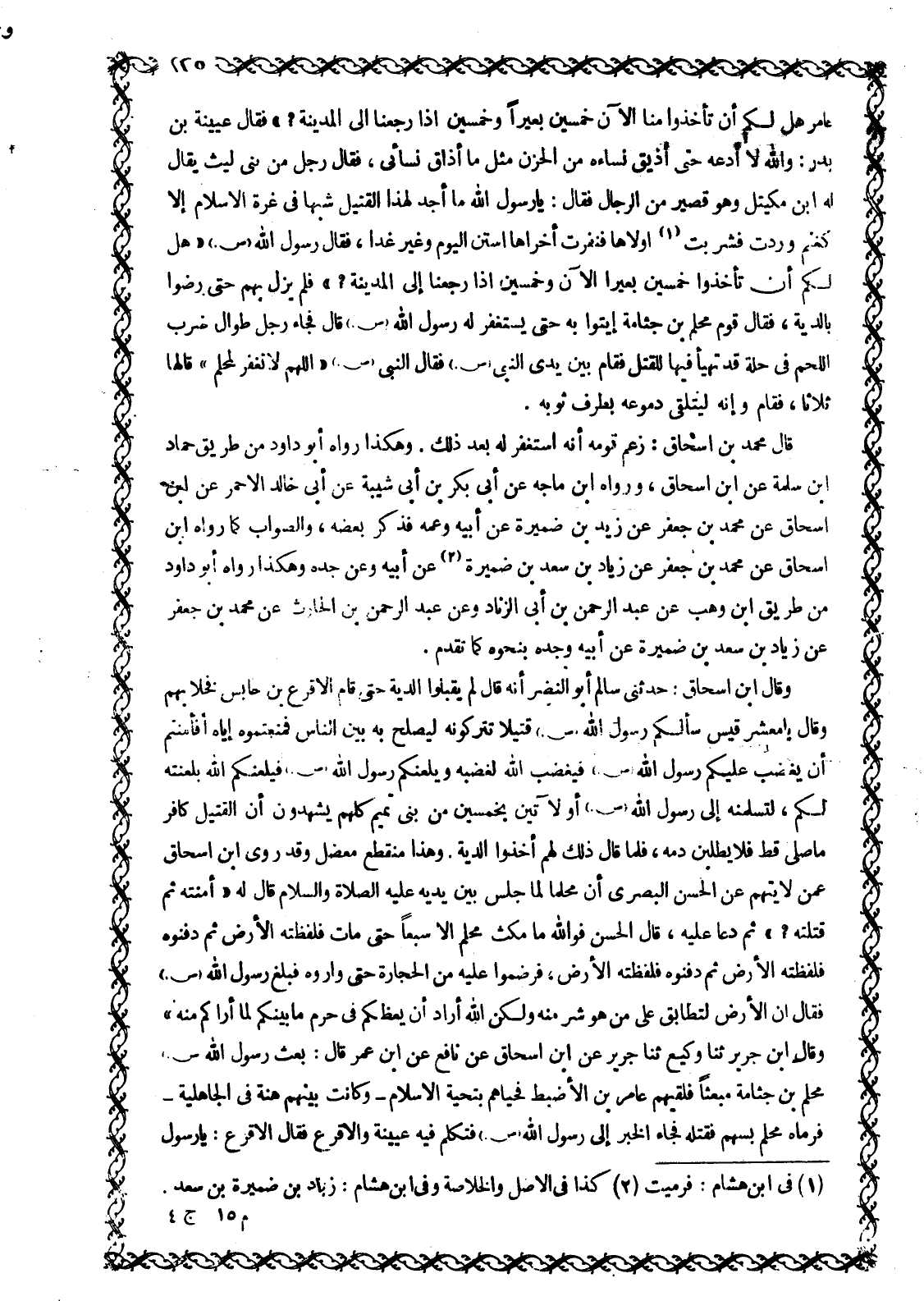 عَامِرٍ هَلْ لَكُمْ أَنْ تَأْخُذُوا مِنَّا الْآنَ خَمْسِينَ بَعِيرًا وَخَمْسِينَ إِذَا رَجَعْنَا إِلَى الْمَدِينَةِ؟» فَقَالَ عُيَيْنَةُ بْنُ بَدْرٍ: وَاللَّهِ لَا أَدَعُهُ حَتَّى أُذِيقَ نِسَاءَهُ مِنَ الْحُزْنِ مِثْلَ مَا أذاق نسائي، فقال رَجُلٌ مِنْ بَنِي لَيْثٍ يُقَالُ لَهُ ابْنُ مكيتل وهو قصير مِنَ الرِّجَالِ فَقَالَ: يَا رَسُولَ اللَّهِ مَا أجد لهذا القتيل شبها في غرة الإسلام إلا كغنم وردت فشربت [1] أولاها فنفرت أخراها استن الْيَوْمَ وَغَيِّرْ غَدًا، فَقَالَ رَسُولُ اللَّهِ صَلَّى اللَّهُ عَلَيْهِ وَسَلَّمَ «هَلْ لَكَمَ أَنْ تَأْخُذُوا خَمْسِينَ بَعِيرًا الْآنَ وَخَمْسِينَ إِذَا رَجَعْنَا إِلَى الْمَدِينَةِ؟» فَلَمْ يَزَلْ بِهِمْ حَتَّى رَضُوا بِالدِّيَةِ، فقال قوم محلم بن جثامة ايتوا بِهِ حَتَّى يَسْتَغْفِرَ لَهُ رَسُولُ اللَّهِ صَلَّى اللَّهُ عَلَيْهِ وَسَلَّمَ قَالَ فَجَاءَ رَجُلٌ طُوَالٌ ضَرْبَ اللَّحْمِ فِي حُلَّةٍ قَدْ تَهَيَّأَ فِيهَا لِلْقَتْلِ فَقَامَ بَيْنَ يَدَيِ النَّبِيِّ صَلَّى اللَّهُ عَلَيْهِ وَسَلَّمَ فَقَالَ النَّبِيُّ صَلَّى اللَّهُ عَلَيْهِ وَسَلَّمَ «اللَّهمّ لَا تَغْفِرْ لِمُحَلِّمٍ» قَالَهَا ثَلَاثًا، فَقَامَ وَإِنَّهُ لَيَتَلَقَّى دُمُوعَهُ بِطَرَفٍ ثَوْبِهِ. قَالَ مُحَمَّدُ بْنُ إِسْحَاقَ: زَعَمَ قَوْمُهُ أَنَّهُ اسْتَغْفَرَ لَهُ بَعْدَ ذَلِكَ. وَهَكَذَا رَوَاهُ أَبُو دَاوُدَ من طريق حماد ابن سَلَمَةَ عَنِ ابْنِ إِسْحَاقَ، وَرَوَاهُ ابْنُ مَاجَهْ عَنْ أَبِي بَكْرِ بْنِ أَبِي شَيْبَةَ عَنْ أَبِي خَالِدٍ الْأَحْمَرِ عَنِ ابْنِ إِسْحَاقَ عَنْ مُحَمَّدِ بْنِ جَعْفَرٍ عَنْ زَيْدِ بْنِ ضُمَيْرَةَ عَنْ أَبِيهِ وَعَمِّهِ فَذَكَرَ بَعْضَهُ، وَالصَّوَابُ كَمَا رَوَاهُ ابْنُ إِسْحَاقَ عَنْ مُحَمَّدِ بْنِ جَعْفَرٍ عَنْ زِيَادِ بْنِ سَعْدِ بْنِ ضُمَيْرَةَ [2] عَنْ أبيه وعن جده وَهَكَذَا رَوَاهُ أَبُو دَاوُدَ مِنْ طَرِيقِ ابْنُ وَهْبٍ عَنْ عَبْدِ الرَّحْمَنِ بْنِ أَبِي الزِّنَادِ وعن عَبْدِ الرَّحْمَنِ بْنِ الْحَارِثِ عَنْ مُحَمَّدِ بْنِ جَعْفَرٍ عَنْ زِيَادِ بْنِ سَعْدِ بْنِ ضُمَيْرَةَ عَنْ أَبِيهِ وَجَدَهُ بِنَحْوِهِ كَمَا تَقَدَّمَ.