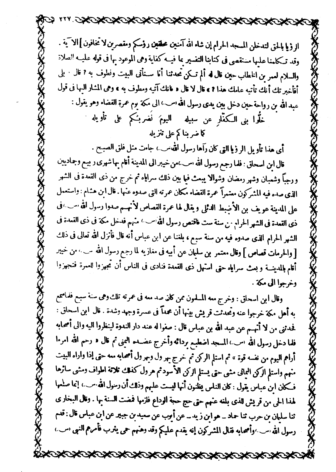 لَقَدْ صَدَقَ اللَّهُ رَسُولَهُ الرُّؤْيا بِالْحَقِّ لَتَدْخُلُنَّ الْمَسْجِدَ الْحَرامَ إِنْ شاءَ اللَّهُ آمِنِينَ مُحَلِّقِينَ رُؤُسَكُمْ وَمُقَصِّرِينَ لا تَخافُونَ 48: 27 الآية وَقَدْ تَكَلَّمْنَا عَلَيْهَا مُسْتَقْصًى فِي كِتَابِنَا التَّفْسِيرِ بِمَا فِيهِ كِفَايَةٌ وَهِيَ الْمَوْعُودُ بِهَا فِي قَوْلِهِ عَلَيْهِ الصَّلَاةُ وَالسَّلَامُ لِعُمَرَ بْنِ الْخَطَّابِ حِينَ قَالَ لَهُ أَلَمْ تَكُنْ تُحَدِّثُنَا أَنَّا سَنَأْتِي الْبَيْتَ وَنَطُوفُ بِهِ؟ قَالَ «بَلَى أَفَأَخْبَرْتُكَ أَنَّكَ تَأْتِيهِ عَامَكَ هَذَا؟» قَالَ لَا قَالَ «فَإِنَّكَ آتِيهِ وَمُطَوِّفٌ بِهِ» وَهِيَ الْمُشَارُ إِلَيْهَا فِي قَوْلِ عَبْدِ اللَّهِ بْنِ رَوَاحَةَ حِينَ دَخَلَ بَيْنَ يَدَيْ رَسُولِ اللَّهِ صَلَّى اللَّهُ عَلَيْهِ وَسَلَّمَ إِلَى مَكَّةَ يَوْمَ عُمْرَةِ الْقَضَاءِ وَهُوَ يَقُولُ: