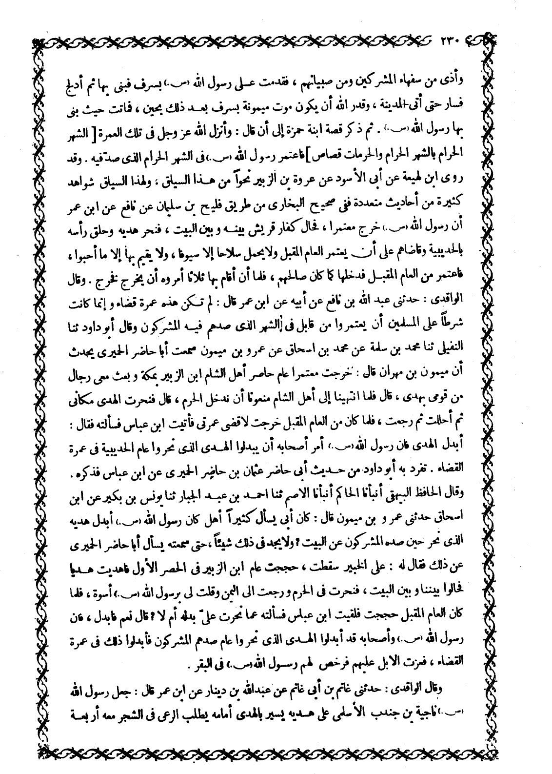 وَأَذًى مِنْ سُفَهَاءِ الْمُشْرِكِينَ وَمِنْ صِبْيَانِهِمْ، فَقَدِمَتْ عَلَى رَسُولِ اللَّهِ صَلَّى اللَّهُ عَلَيْهِ وَسَلَّمَ بِسَرِفٍ فَبَنَى بِهَا ثُمَّ أَدْلَجَ فَسَارَ حَتَّى أتى الْمَدِينَةَ، وَقَدَّرَ اللَّهُ أَنْ يَكُونَ مَوْتُ مَيْمُونَةَ بِسَرَفٍ بَعْدَ ذَلِكَ بِحِينٍ، فَمَاتَتْ حَيْثُ بَنَى بِهَا رَسُولُ اللَّهِ صَلَّى اللَّهُ عَلَيْهِ وَسَلَّمَ. ثُمَّ ذَكَرَ قِصَّةَ ابْنَةِ حَمْزَةَ إِلَى أَنْ قَالَ: وَأَنْزَلَ اللَّهُ عَزَّ وَجَلَّ فِي تِلْكَ الْعُمْرَةِ الشَّهْرُ الْحَرامُ بِالشَّهْرِ الْحَرامِ وَالْحُرُماتُ قِصاصٌ 2: 194 فَاعْتَمَرَ رَسُولُ اللَّهِ صَلَّى اللَّهُ عَلَيْهِ وَسَلَّمَ فِي الشَّهْرِ الْحَرَامِ الَّذِي صُدَّ فِيهِ. وَقَدْ رَوَى ابْنُ لَهِيعَةَ عَنْ أَبِي الْأَسْوَدِ عَنْ عُرْوَةَ بْنِ الزُّبَيْرِ نَحْوًا مِنْ هَذَا السِّيَاقِ، وَلِهَذَا السِّيَاقِ شَوَاهِدُ كَثِيرَةٌ مِنْ أَحَادِيثَ مُتَعَدِّدَةٍ فَفِي صَحِيحِ الْبُخَارِيِّ مِنْ طَرِيقِ فُلَيْحِ بْنِ سُلَيْمَانَ عَنْ نَافِعٍ عَنِ ابْنِ عُمَرَ أَنَّ رَسُولَ اللَّهِ صَلَّى اللَّهُ عَلَيْهِ وَسَلَّمَ خَرَجَ مُعْتَمِرًا، فَحَالَ كُفَّارُ قُرَيْشٍ بَيْنَهُ وَبَيْنَ الْبَيْتِ، فَنَحَرَ هَدْيَهُ وَحَلَقَ رَأَسَهُ بِالْحُدَيْبِيَةِ وَقَاضَاهُمْ عَلَى أَنْ يَعْتَمِرَ الْعَامَ الْمُقْبِلَ وَلَا يَحْمِلَ سِلَاحًا إِلَّا سُيُوفًا، وَلَا يُقِيمَ بِهَا إِلَّا مَا أَحَبُّوا، فَاعْتَمَرَ مِنَ الْعَامِ الْمُقْبِلِ فَدَخَلَهَا كَمَا كَانَ صَالَحَهُمْ، فَلَمَّا أَنْ أَقَامَ بِهَا ثَلَاثًا أَمَرُوهُ أَنْ يَخْرُجَ فَخَرَجَ. وَقَالَ الْوَاقِدِيُّ: حَدَّثَنِي عَبْدُ اللَّهِ بْنُ نَافِعٍ عَنْ أَبِيهِ عَنِ ابْنِ عُمَرَ قَالَ: لَمْ تَكُنْ هَذِهِ عُمْرَةَ قَضَاءٍ وَإِنَّمَا كَانَتْ شَرْطًا عَلَى الْمُسْلِمِينَ أَنْ يَعْتَمِرُوا مِنْ قَابِلٍ فِي الشَّهْرِ الَّذِي صَدَّهُمْ فِيهِ الْمُشْرِكُونَ وَقَالَ أَبُو دَاوُدَ ثَنَا النُّفَيْلِيُّ ثَنَا مُحَمَّدُ بْنُ سَلَمَةَ عَنْ مُحَمَّدِ بْنِ إِسْحَاقَ عَنْ عَمْرِو بْنِ مَيْمُونٍ سَمِعْتُ أَبَا حاضر الحميري يحدث أن مَيْمُونَ بْنَ مِهْرَانَ قَالَ: خَرَجْتُ مُعْتَمِرًا عَامَ حَاصَرَ أَهْلُ الشَّامِ ابْنَ الزُّبَيْرِ بِمَكَّةَ وَبَعَثَ مَعِي رِجَالٌ مِنْ قَوْمِي بِهَدْيٍ، قَالَ فَلَمَّا انْتَهَيْنَا إِلَى أَهْلِ الشَّامِ مَنَعُونَا أَنْ نَدْخُلَ الْحَرَمَ، قَالَ فَنَحَرْتُ الْهَدْيَ مَكَانِي ثُمَّ أَحْلَلْتُ ثُمَّ رَجَعْتُ، فَلَمَّا كَانَ مِنَ الْعَامِ الْمُقْبِلِ خرجت لا قضى عُمْرَتِي فَأَتَيْتُ ابْنَ عَبَّاسٍ فَسَأَلْتُهُ فَقَالَ: