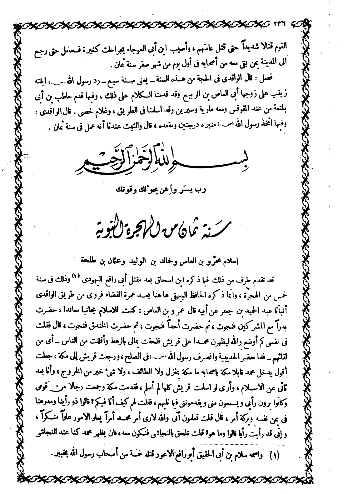 وكان قدومهم في أَوَائِلَ سَنَةِ ثَمَانٍ عَلَى مَا سَيَأْتِي قَدْ تَقَدَّمَ طَرَفٌ مِنْ ذَلِكَ فِيمَا ذَكَرَهُ ابْنُ إِسْحَاقَ بَعْدَ مَقْتَلِ أَبِي رَافِعٍ الْيَهُودِيِّ [1] وَذَلِكَ فِي سَنَةِ خَمْسٍ مِنَ الْهِجْرَةِ، وَإِنَّمَا ذَكَرَهُ الْحَافِظُ الْبَيْهَقِيُّ هَاهُنَا بَعْدَ عُمْرَةِ الْقَضَاءِ فَرَوَى مِنْ طَرِيقِ الْوَاقِدِيِّ أَنْبَأَنَا عَبْدُ الْحَمِيدِ بْنُ جعفر عن أبيه قَالَ عَمْرُو بْنُ الْعَاصِ: كُنْتُ لِلْإِسْلَامِ مُجَانِبًا مُعَانِدًا، حَضَرْتُ بَدْرًا مَعَ الْمُشْرِكِينَ فَنَجَوْتُ، ثُمَّ حَضَرْتُ أُحُدًا فَنَجَوْتُ، ثُمَّ حَضَرْتُ الْخَنْدَقَ فَنَجَوْتُ، قَالَ فَقُلْتُ فِي نَفْسِي كَمْ أُوضِعُ وَاللَّهِ ليظهرن محمدا على قريش فلحقت بمالي بالرهط وَأَقْلَلْتُ مِنَ النَّاسِ- أَيْ مِنْ لِقَائِهِمْ- فَلَمَّا حَضَرَ الْحُدَيْبِيَةُ وَانْصَرَفَ رَسُولُ اللَّهِ صَلَّى اللَّهُ عَلَيْهِ وَسَلَّمَ فِي الصُّلْحِ، وَرَجَعَتْ قُرَيْشٌ إِلَى مَكَّةَ، جَعَلْتُ أَقُولُ يَدْخُلُ مُحَمَّدٌ قَابِلًا مَكَّةَ بِأَصْحَابِهِ مَا مَكَّةُ بِمَنْزِلٍ وَلَا الطَّائِفُ، وَلَا شيء خير من الخروج، وأنا بعد نائى عَنِ الْإِسْلَامِ، وَأَرَى لَوْ أَسْلَمَتْ قُرَيْشٌ كُلُّهَا لَمْ أُسْلِمْ، فَقَدِمْتُ مَكَّةَ وَجَمَعْتُ رِجَالًا مِنْ قَوْمِي وَكَانُوا يَرَوْنَ رَأْيِي وَيَسْمَعُونَ مِنِّي وَيُقَدِّمُونَنِي فِيمَا نَابَهُمْ، فَقُلْتُ لَهُمْ كَيْفَ أَنَا فِيكُمْ؟ قالوا ذو رأينا ومدرهنا في يمن نفسه وبركة أمر، قالت قُلْتُ تَعْلَمُونَ أَنِّي وَاللَّهِ لَأَرَى أَمْرَ مُحَمَّدٍ أَمْرًا يَعْلُو الْأُمُورَ عُلُوًّا مُنْكَرًا، وَإِنِّي قَدْ رَأَيْتُ رَأْيًا قَالُوا وَمَا هُوَ؟ قُلْتُ نَلْحَقُ بِالنَّجَاشِيِّ فَنَكُونُ مَعَهُ، فَإِنْ يَظْهَرْ مُحَمَّدٌ كُنَّا عند النجاشي