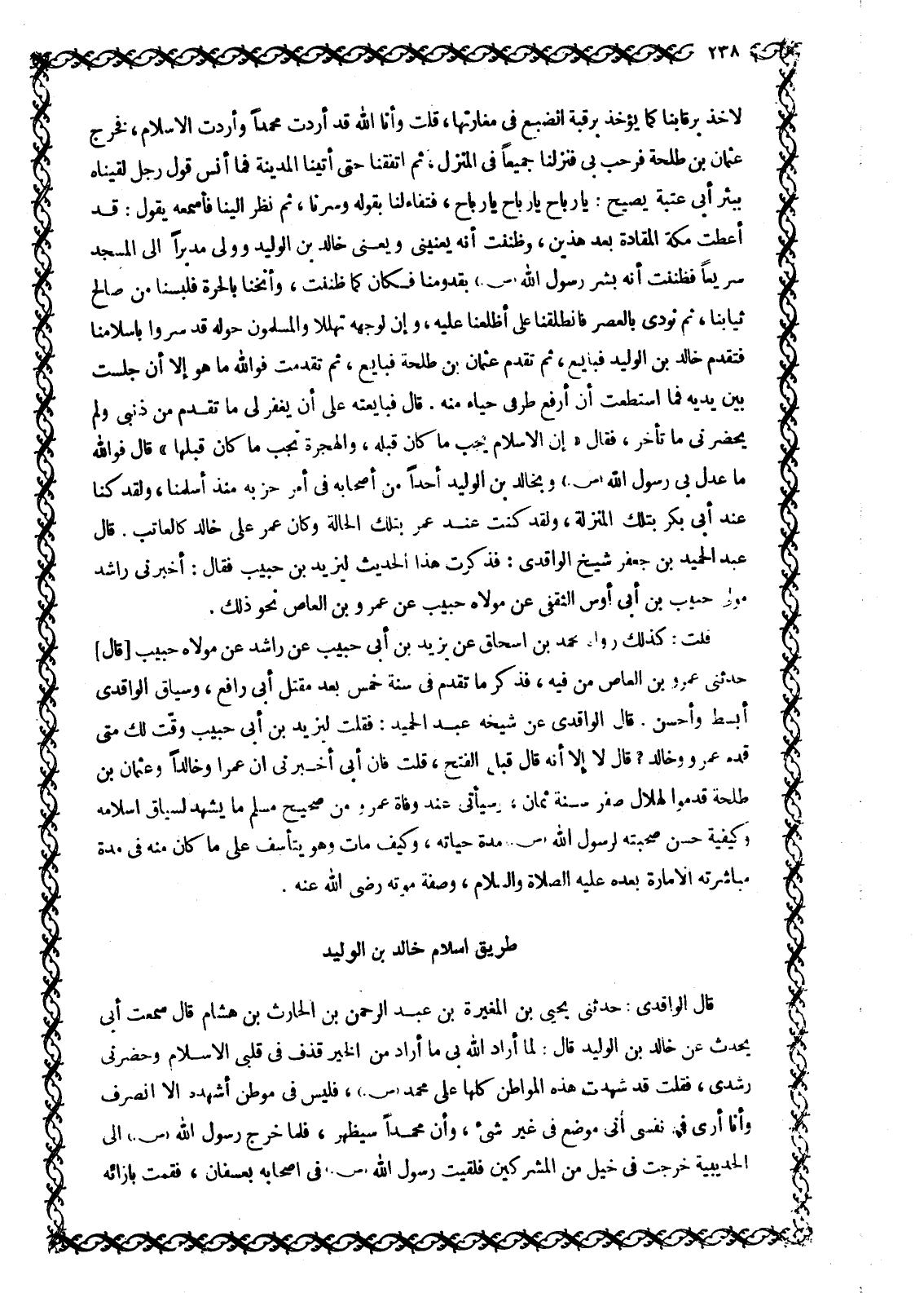 قَالَ الْوَاقِدِيُّ: حَدَّثَنِي يَحْيَى بْنُ الْمُغِيرَةُ بْنُ عَبْدِ الرَّحْمَنِ بْنِ الْحَارِثِ بْنِ هِشَامٍ قَالَ سَمِعْتُ أَبِي يُحَدِّثُ عَنْ خَالِدِ بْنِ الْوَلِيدِ قَالَ: لَمَّا أَرَادَ اللَّهُ بِي مَا أَرَادَ مِنَ الْخَيْرِ قَذَفَ فِي قَلْبِي الْإِسْلَامَ وَحَضَرَنِي رُشْدِي، فَقُلْتُ قَدْ شَهِدْتُ هَذِهِ الْمَوَاطِنَ كُلَّهَا عَلَى مُحَمَّدٍ صَلَّى اللَّهُ عَلَيْهِ وَسَلَّمَ، فَلَيْسَ فِي مَوْطِنٍ أَشْهَدُهُ إِلَّا أَنْصَرِفُ وَأَنَا أَرَى فِي نَفْسِي أَنِّي مَوْضِعٌ فِي غَيْرِ شَيْءٍ، وَأَنَّ مُحَمَّدًا سَيَظْهَرُ، فَلَمَّا خَرَجَ رَسُولُ اللَّهِ صَلَّى اللَّهُ عَلَيْهِ وَسَلَّمَ إِلَى الْحُدَيْبِيَةِ خَرَجْتُ فِي خَيْلٍ مِنَ الْمُشْرِكِينَ فَلَقِيتُ رَسُولَ اللَّهِ صَلَّى اللَّهُ عَلَيْهِ وَسَلَّمَ فِي أَصْحَابِهِ بَعُسْفَانَ، فَقُمْتُ بِإِزَائِهِ