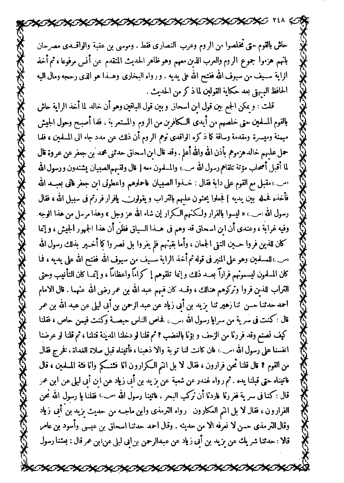 حاش بِالْقَوْمِ حَتَّى تَخَلَّصُوا مِنَ الرُّومِ وَعَرَبِ النَّصَارَى فَقَطْ. وَمُوسَى بْنُ عُقْبَةَ وَالْوَاقِدِيُّ مُصَرِّحَانِ بِأَنَّهُمْ هَزَمُوا جُمُوعَ الرُّومِ وَالْعَرَبِ الَّذِينَ مَعَهُمْ وَهُوَ ظَاهِرُ الْحَدِيثِ الْمُتَقَدِّمِ عَنْ أَنَسٍ مَرْفُوعًا، ثُمَّ أَخَذَ الرَّايَةَ سَيْفٌ مِنْ سُيُوفِ اللَّهِ فَفَتَحَ اللَّهُ عَلَى يديه. ورواه الْبُخَارِيُّ وَهَذَا هُوَ الَّذِي رَجَّحَهُ وَمَالَ إِلَيْهِ الحافظ البيهقي بعد حكاية القولين لما ذكر مِنَ الْحَدِيثِ.