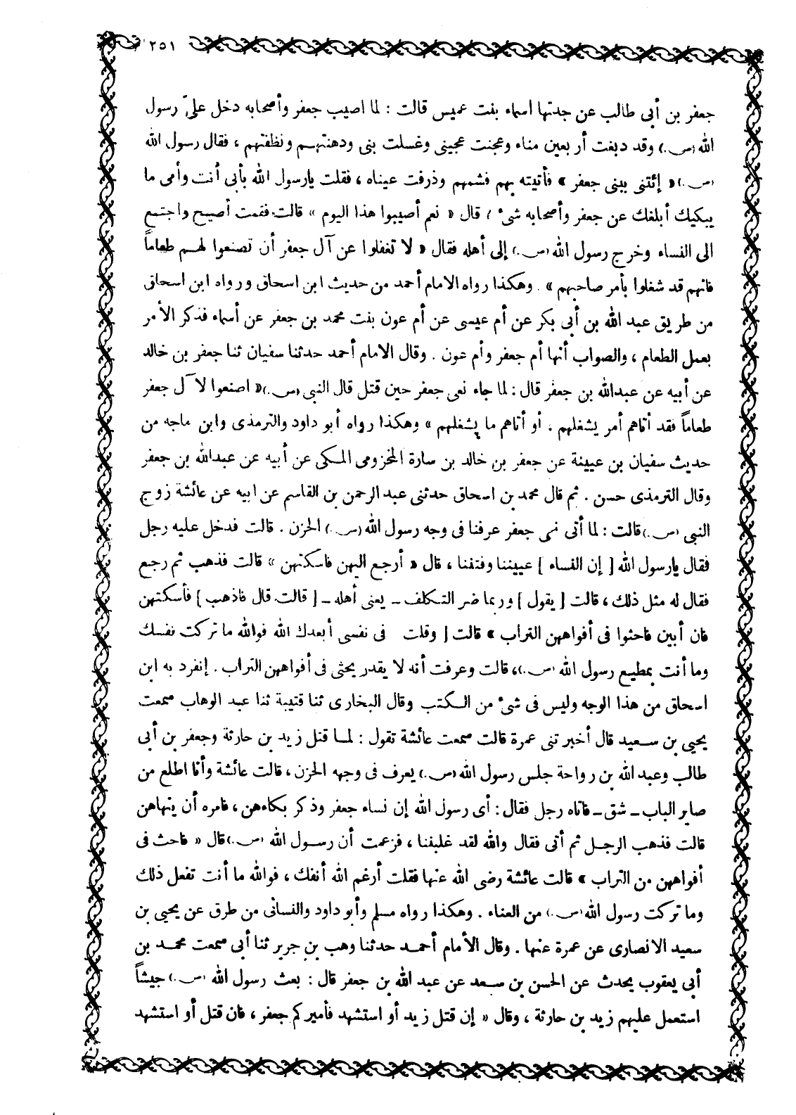 جَعْفَرِ بْنِ أَبِي طَالِبٍ عَنْ جَدَّتِهَا أَسْمَاءَ بِنْتِ عُمَيْسٍ قَالَتْ: لَمَّا أُصِيبَ جَعْفَرٌ وَأَصْحَابُهُ دَخَلَ عَلَى رَسُولِ اللَّهِ صَلَّى اللَّهُ عَلَيْهِ وَسَلَّمَ وقد دبغت أربعين مناء وعجنت عجيني وغسلت بنى ودهنتهم ونظفتهم، فَقَالَ رَسُولُ اللَّهِ صَلَّى اللَّهُ عَلَيْهِ وَسَلَّمَ «ائْتِنِي بِبَنِي جَعْفَرٍ» فَأَتَيْتُهُ بِهِمْ فَشَمَّهُمْ وَذَرَفَتْ عَيْنَاهُ، فَقُلْتُ يَا رَسُولَ اللَّهِ بِأَبِي أَنْتَ وَأُمِّي مَا يُبْكِيكَ أَبَلَغَكَ عَنْ جَعْفَرٍ وَأَصْحَابِهِ شَيْءٌ؟ قَالَ «نَعَمْ أُصِيبُوا هَذَا الْيَوْمَ» قَالَتْ فَقُمْتُ أَصِيحُ وَاجْتَمَعَ إِلَيَّ النِّسَاءُ وَخَرَجَ رَسُولُ اللَّهِ صَلَّى اللَّهُ عَلَيْهِ وَسَلَّمَ إِلَى أَهْلِهِ فَقَالَ «لَا تَغْفُلُوا عَنْ آلِ جَعْفَرٍ أَنْ تَصْنَعُوا لَهُمْ طَعَامًا فَإِنَّهُمْ قَدْ شُغِلُوا بِأَمْرِ صَاحِبِهِمْ» . وَهَكَذَا رَوَاهُ الْإِمَامُ أَحْمَدُ مِنْ حَدِيثِ ابن إسحاق ورواه ابن إسحاق من طريق عبد الله بن أبي بكر عن أم عِيسَى عَنْ أُمِّ عَوْنٍ بِنْتِ مُحَمَّدِ بْنِ جَعْفَرٍ عَنْ أَسْمَاءَ فَذَكَرَ الْأَمْرَ بِعَمَلِ الطَّعَامِ، وَالصَّوَابُ أَنَّهَا أُمُّ جَعْفَرٍ وَأُمُّ عَوْنٍ. وَقَالَ الْإِمَامُ أَحْمَدُ حَدَّثَنَا سُفْيَانُ ثَنَا جَعْفَرُ بْنُ خَالِدٍ عَنْ أَبِيهِ عَنْ عَبْدِ اللَّهِ بْنِ جَعْفَرٍ قَالَ: لَمَّا جَاءَ نَعْيُ جَعْفَرٍ حِينَ قُتِلَ قَالَ النَّبِيُّ صَلَّى اللَّهُ عَلَيْهِ وَسَلَّمَ «اصْنَعُوا لِآلِ جَعْفَرٍ طَعَامًا فَقَدْ أَتَاهُمْ أَمْرٌ يَشْغَلُهُمْ، أَوْ أَتَاهُمْ مَا يَشْغَلُهُمْ» وَهَكَذَا رَوَاهُ أَبُو دَاوُدَ وَالتِّرْمِذِيُّ وَابْنُ مَاجَهْ مِنْ حَدِيثِ سُفْيَانَ بْنِ عُيَيْنَةَ عَنْ جَعْفَرِ بْنِ خَالِدِ بْنِ سَارَةَ الْمَخْزُومِيِّ الْمَكِّيِّ عَنْ أَبِيهِ عَنْ عَبْدِ اللَّهِ بْنِ جَعْفَرٍ وَقَالَ التِّرْمِذِيُّ حَسَنٌ. ثُمَّ قَالَ مُحَمَّدُ بْنُ إِسْحَاقَ حَدَّثَنِي عَبْدُ الرَّحْمَنِ بْنُ الْقَاسِمِ عَنْ أَبِيهِ عَنْ عَائِشَةَ زَوْجَ النَّبِيِّ صَلَّى اللَّهُ عَلَيْهِ وَسَلَّمَ قالت: لَمَّا أَتَى نَعْيُ جَعْفَرٍ عَرَفْنَا فِي وَجْهِ رَسُولِ اللَّهِ صَلَّى اللَّهُ عَلَيْهِ وَسَلَّمَ الْحُزْنَ، قَالَتْ فَدَخَلَ عَلَيْهِ رَجُلٌ فَقَالَ يَا رَسُولَ الله [إن النساء] عييننا وَفَتَنَّنَا، قَالَ «ارْجِعْ إِلَيْهِنَّ فَأَسْكِتْهُنَّ» قَالَتْ فَذَهَبَ ثُمَّ رَجَعَ فَقَالَ لَهُ مِثْلَ ذَلِكَ، قَالَتْ [يقول] وربما ضر التكلف- يعنى أهله-[قالت قال فاذهب] فأسكتهن فان أبين فاحثوا فِي أَفْوَاهِهِنَّ التُّرَابَ» قَالَتْ [وَقُلْتُ فِي نَفْسِي أبعدك الله فو الله مَا تَرَكْتَ نَفْسَكَ وَمَا أَنْتَ بِمُطِيعٍ رَسُولُ اللَّهِ صَلَّى اللَّهُ عَلَيْهِ وَسَلَّمَ، قَالَتْ وَعَرَفْتُ أنه لا يقدر يَحْثِيَ فِي أَفْوَاهِهِنَّ التُّرَابَ. انْفَرَدَ بِهِ ابْنُ إِسْحَاقَ مِنْ هَذَا الْوَجْهِ وَلَيْسَ فِي شَيْءٍ مِنَ الْكُتُبِ وَقَالَ الْبُخَارِيُّ ثَنَا قُتَيْبَةُ ثَنَا عَبْدُ الْوَهَّابِ سَمِعْتُ يَحْيَى بْنَ سَعِيدٍ قَالَ أَخْبَرَتْنِي عَمْرَةُ قَالَتْ سَمِعْتُ عَائِشَةَ تَقُولُ: لَمَّا قُتِلَ زَيْدُ بْنُ حَارِثَةَ وَجَعْفَرُ بْنُ أَبِي طَالِبٍ وَعَبْدُ اللَّهِ بْنُ رَوَاحَةَ جَلَسَ رَسُولُ اللَّهِ صَلَّى اللَّهُ عَلَيْهِ وَسَلَّمَ يُعْرَفُ فِي وَجْهِهِ الْحُزْنُ، قَالَتْ عَائِشَةُ وَأَنَا أَطَّلِعُ مِنْ صَائِرِ الْبَابِ- شَقٍّ- فَأَتَاهُ رَجُلٌ فَقَالَ: أَيْ رَسُولَ اللَّهِ إِنَّ نِسَاءَ جَعْفَرٍ وَذَكَرَ بُكَاءَهُنَّ، فَأَمَرَهُ أَنْ يَنْهَاهُنَّ قَالَتْ فَذَهَبَ الرَّجُلُ ثُمَّ أَتَى فَقَالَ وَاللَّهِ لَقَدْ غَلَبْنَنَا، فَزَعَمَتْ أَنَّ رَسُولَ اللَّهِ صَلَّى اللَّهُ عَلَيْهِ وَسَلَّمَ