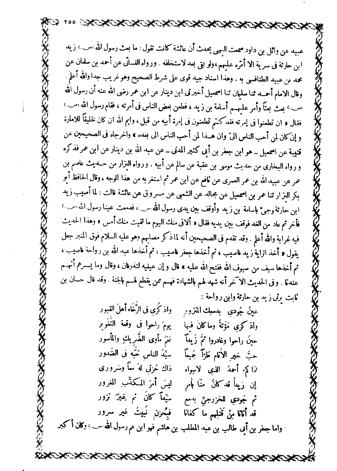 وَقَالَ الْإِمَامُ أَحْمَدُ ثَنَا سُلَيْمَانُ ثَنَا إِسْمَاعِيلُ أَخْبَرَنِي ابْنُ دِينَارٍ عَنِ ابْنِ عُمَرَ رَضِيَ اللَّهُ عَنْهُ أَنَّ رَسُولَ اللَّهِ صَلَّى اللَّهُ عَلَيْهِ وَسَلَّمَ بَعَثَ بَعْثًا وَأَمَّرَ عَلَيْهِمْ أُسَامَةَ بْنَ زَيْدٍ، فَطَعَنَ بَعْضُ النَّاسِ فِي إِمْرَتِهِ، فَقَامَ رَسُولُ اللَّهِ صَلَّى اللَّهُ عَلَيْهِ وَسَلَّمَ فَقَالَ «إِنْ تَطْعَنُوا فِي إِمْرَتِهِ فَقَدْ كُنْتُمْ تَطْعَنُونَ فِي إِمْرَةِ أَبِيهِ مِنْ قَبْلُ، وَايْمُ اللَّهِ إِنْ كَانَ لَخَلِيقًا لِلْإِمَارَةِ وَإِنْ كَانَ لَمِنْ أَحَبِّ النَّاسِ إِلَيَّ وَإِنَّ هَذَا لَمِنْ أَحَبِّ النَّاسِ إِلَيَّ بَعْدَهُ» وَأَخْرَجَاهُ فِي الصَّحِيحَيْنِ عَنْ قُتَيْبَةَ عَنْ إِسْمَاعِيلَ- هُوَ ابْنُ جَعْفَرِ بْنِ أَبِي كَثِيرٍ الْمَدَنِيُّ- عَنْ عَبْدِ اللَّهِ بْنِ دِينَارٍ عَنِ ابْنِ عُمَرَ فَذَكَرَهُ وَرَوَاهُ الْبُخَارِيُّ مِنْ حَدِيثِ مُوسَى بْنِ عُقْبَةَ عَنْ سَالِمٍ عَنْ أَبِيهِ. وَرَوَاهُ الْبَزَّارُ مِنْ حَدِيثِ عَاصِمِ بْنِ عُمَرَ عَنْ عُبَيْدِ اللَّهِ بْنِ عُمَرَ الْعُمَرِيِّ عَنْ نَافِعٍ عَنِ ابْنِ عُمَرَ ثُمَّ اسْتَغْرَبَهُ مِنْ هَذَا الْوَجْهِ، وَقَالَ الْحَافِظُ أَبُو بَكْرٍ الْبَزَّارُ ثنا عمر بن إسماعيل عَنْ مُجَالِدٌ عَنِ الشَّعْبِيِّ عَنْ مَسْرُوقٍ عَنْ عَائِشَةَ قَالَتْ: لما أصيب زيد ابن حارثة وجيء بأسامة بن زيد وأوقف بَيْنَ يَدَيْ رَسُولِ اللَّهِ صَلَّى اللَّهُ عَلَيْهِ وَسَلَّمَ فَدَمَعَتْ عَيْنَا رَسُولِ اللَّهِ صَلَّى اللَّهُ عَلَيْهِ وَسَلَّمَ فَأُخِّرَ ثُمَّ عَادَ مِنَ الْغَدِ فَوَقَفَ بَيْنَ يَدَيْهِ فَقَالَ «أُلَاقِي مِنْكَ الْيَوْمَ مَا لَقِيتُ مِنْكَ أَمْسِ» وَهَذَا الْحَدِيثُ فِيهِ غَرَابَةٌ وَاللَّهُ أَعْلَمُ. وَقَدْ تَقَدَّمَ فِي الصَّحِيحَيْنِ أنه لما ذكر مصابهم وهو عليه السلام فَوْقَ الْمِنْبَرِ جَعَلَ يَقُولُ «أَخَذَ الرَّايَةَ زَيْدٌ فَأُصِيبَ، ثُمَّ أَخَذَهَا جَعْفَرٌ فَأُصِيبَ، ثُمَّ أَخَذَهَا عَبْدُ اللَّهِ بْنُ رَوَاحَةَ فَأُصِيبَ، ثُمَّ أَخَذَهَا سَيْفٌ مِنْ سُيُوفِ اللَّهِ ففتح الله عليه» قَالَ وَإِنَّ عَيْنَيْهِ لَتَذْرِفَانِ، وَقَالَ وَمَا يَسُرُّهُمْ أَنَّهُمْ عِنْدَنَا. وَفِي الْحَدِيثِ الْآخَرِ أَنَّهُ شَهِدَ لَهُمْ بِالشَّهَادَةِ فَهُمْ مِمَنْ يُقْطَعُ لَهُمْ بِالْجَنَّةِ. وَقَدْ قَالَ حَسَّانُ بْنُ ثَابِتٍ يَرْثِي زَيْدَ بْنَ حَارِثَةَ وَابْنَ رَوَاحَةَ: