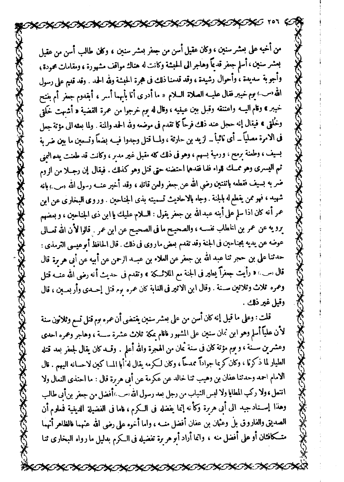 مِنْ أَخِيهِ عَلِيٍّ بِعَشْرِ سِنِينَ، وَكَانَ عَقِيلٌ أَسَنَّ مِنْ جَعْفَرٍ بِعَشْرِ سِنِينَ، وَكَانَ طَالِبٌ أَسَنَّ مِنْ عَقِيلٍ بِعَشْرِ سِنِينَ، أَسْلَمَ جَعْفَرٌ قديما وهاجر إلى الحبشة وكانت له هناك مَوَاقِفُ مَشْهُورَةٌ، وَمَقَامَاتٌ مَحْمُودَةٌ، وَأَجْوِبَةٌ سَدِيدَةٌ، وَأَحْوَالٌ رَشِيدَةٌ، وَقَدْ قَدَّمْنَا ذَلِكَ فِي هِجْرَةِ الْحَبَشَةِ وللَّه الْحَمْدُ. وَقَدْ قَدِمَ عَلَى رَسُولِ اللَّهِ صَلَّى اللَّهُ عَلَيْهِ وَسَلَّمَ يَوْمَ خَيْبَرَ فَقَالَ عليه الصلاة السلام «ما أدرى أنا بأيهما أُسَرُّ، أَبِقُدُومِ جَعْفَرٍ أَمْ بِفَتْحِ خَيْبَرَ» وَقَامَ إِلَيْهِ وَاعْتَنَقَهُ وَقَبَّلَ بَيْنِ عَيْنَيْهِ، وَقَالَ لَهُ يَوْمَ خَرَجُوا مِنْ عُمْرَةِ الْقَضِيَّةِ «أَشْبَهْتَ خَلْقِي وَخُلُقِي» فَيُقَالُ إِنَّهُ حَجَلَ عِنْدَ ذَلِكَ فَرَحًا كما تقدم فِي مَوْضِعِهِ وللَّه الْحَمْدُ وَالْمِنَّةُ. وَلَمَّا بَعَثَهُ الى مؤتة جعل في الامرة مصليا- أي نائبا- لِزَيْدِ بْنِ حَارِثَةَ، وَلَمَّا قُتِلَ وَجَدُوا فِيهِ بِضْعًا وَتِسْعِينَ مَا بَيْنَ ضَرْبَةٍ بِسَيْفٍ، وَطَعْنَةٍ بِرُمْحٍ، وَرَمْيَةٍ بِسَهْمٍ، وَهُوَ فِي ذَلِكَ كُلِّهِ مقبل غير مدبر، وكانت قد طعنت يده اليمنى ثم اليسرى وهو ممسك للواء فَلَمَّا فَقَدَهُمَا احْتَضَنَهُ حَتَّى قُتِلَ وَهُوَ كَذَلِكَ. فَيُقَالُ إِنْ رَجُلًا مِنَ الرُّومِ ضَرَبَهُ بِسَيْفٍ فَقَطَعَهُ بِاثْنَتَيْنِ رَضِيَ اللَّهُ عَنْ جَعْفَرٍ وَلَعَنَ قَاتِلَهُ، وَقَدْ أَخْبَرَ عَنْهُ رَسُولُ اللَّهِ صَلَّى اللَّهُ عَلَيْهِ وَسَلَّمَ بِأَنَّهُ شَهِيدٌ، فَهُوَ مِمَّنْ يقطع له بالجنة. وجاء بالأحاديث تَسْمِيَتُهُ بِذِي الْجَنَاحَيْنِ. وَرَوَى الْبُخَارِيُّ عَنِ ابْنِ عُمَرَ أَنَّهُ كَانَ إِذَا سَلَّمَ عَلَى ابْنِهِ عَبْدِ اللَّهِ بْنِ جَعْفَرٍ يَقُولُ: السَّلَامُ عَلَيْكَ يَا ابْنَ ذِي الْجَنَاحَيْنِ، وَبَعْضُهُمْ يَرْوِيهِ عَنْ عُمَرَ بْنِ الْخَطَّابِ نَفْسِهِ، وَالصَّحِيحُ مَا فِي الصَّحِيحِ عَنِ ابْنِ عُمَرَ. قَالُوا لِأَنَّ اللَّهَ تَعَالَى عَوَّضَهُ عَنْ يَدَيْهِ بِجَنَاحَيْنِ فِي الْجَنَّةِ وَقَدْ تَقَدَّمَ بَعْضُ مَا رُوِيَ فِي ذَلِكَ. قَالَ الْحَافِظُ أَبُو عِيسَى التِّرْمِذِيُّ: