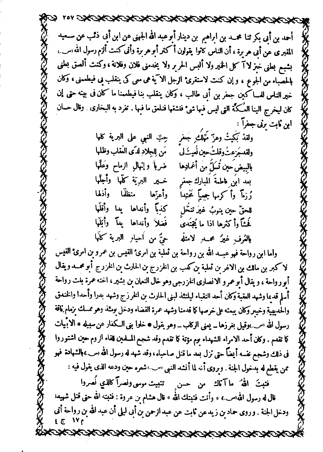 أَحْمَدُ بْنُ أَبِي بَكْرٍ ثَنَا مُحَمَّدُ بْنُ إِبْرَاهِيمَ بْنِ دِينَارٍ أَبُو عَبْدِ اللَّهِ الْجُهَنِيُّ عَنِ ابْنِ أَبِي ذِئْبٍ عَنْ سَعِيدٍ الْمَقْبُرِيِّ عَنْ أَبِي هُرَيْرَةَ، أَنَّ النَّاسَ كَانُوا يَقُولُونَ أَكْثَرَ أَبُو هُرَيْرَةَ وَإِنِّي كُنْتُ أَلْزَمُ رَسُولَ اللَّهِ صَلَّى اللَّهُ عَلَيْهِ وَسَلَّمَ بِشِبَعِ بَطْنِي خبز لَا آكُلُ الْخَمِيرَ وَلَا أَلْبَسُ الْحَرِيرَ وَلَا يَخْدُمُنِي فُلَانٌ وَفُلَانَةُ، وَكُنْتُ أُلْصِقُ بَطْنِي بِالْحَصْبَاءِ من الجوع، وإن كُنْتُ لَأَسْتَقْرِئُ الرَّجُلَ الْآيَةَ هِيَ مَعِي كَيْ يَنْقَلِبَ بِي فَيُطْعِمَنِي، وَكَانَ خَيْرَ النَّاسِ لِلْمَسَاكِينِ جَعْفَرُ بْنُ أَبِي طَالِبٍ، وَكَانَ يَنْقَلِبُ بِنَا فَيُطْعِمُنَا مَا كَانَ فِي بَيْتِهِ حَتَّى إِنْ كَانَ لَيُخْرِجُ إِلَيْنَا الْعُكَّةَ الَّتِي لَيْسَ فِيهَا شَيْءٌ فَنَشُقُّهَا فَنَلْعَقُ مَا فِيهَا. تَفَرَّدَ بِهِ البخاري. وقال حسان ابن ثَابِتٍ يَرْثِي جَعْفَرًا: