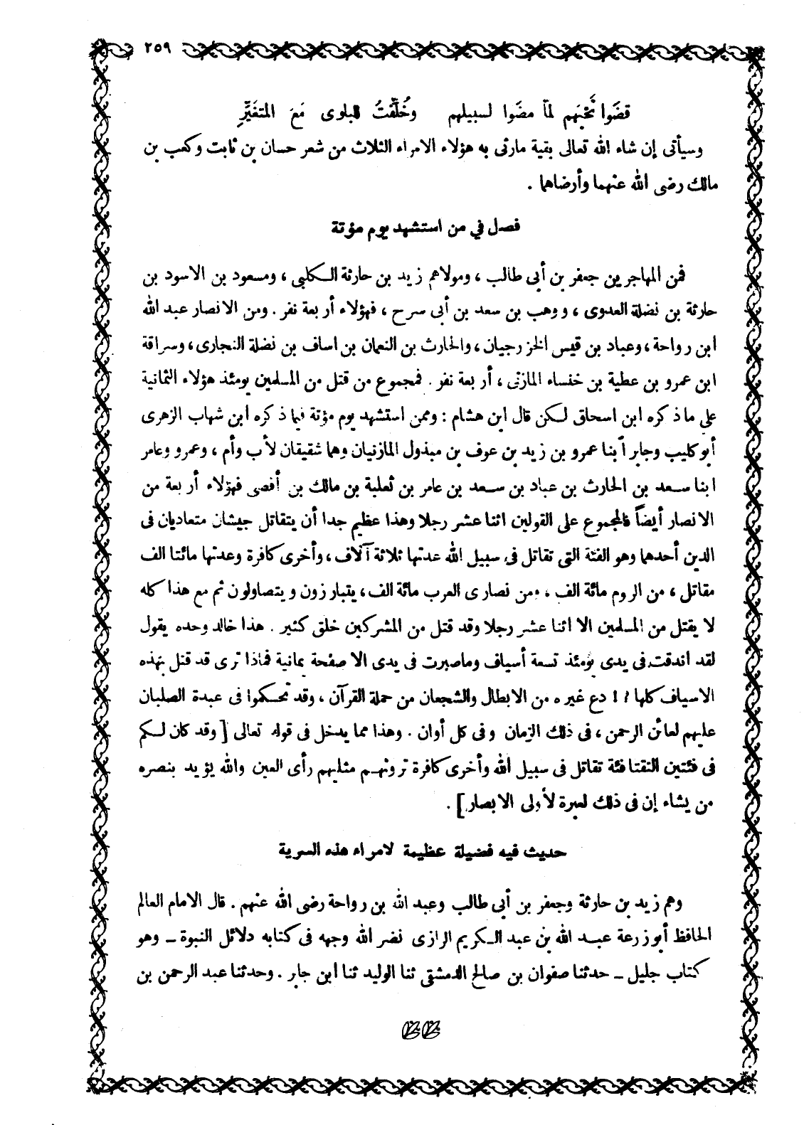 وَهُمْ زَيْدُ بْنُ حَارِثَةَ وَجَعْفَرُ بْنُ أَبِي طَالِبٍ وَعَبْدُ اللَّهِ بْنُ رَوَاحَةَ رَضِيَ اللَّهُ عَنْهُمْ. قَالَ الْإِمَامُ الْعَالِمُ الْحَافِظُ أَبُو زُرْعَةَ عَبْدُ اللَّهِ بْنُ عَبْدِ الْكَرِيمِ الرَّازِيُّ نَضَّرَ اللَّهُ وَجْهَهُ فِي كِتَابِهِ دَلَائِلُ النُّبُوَّةِ- وَهُوَ كِتَابٌ جَلِيلٌ- حَدَّثَنَا صَفْوَانُ بْنُ صَالِحٍ الدِّمَشْقِيُّ ثنا الوليد ثنا ابن جابر. وحدثنا عبد الرحمن بن