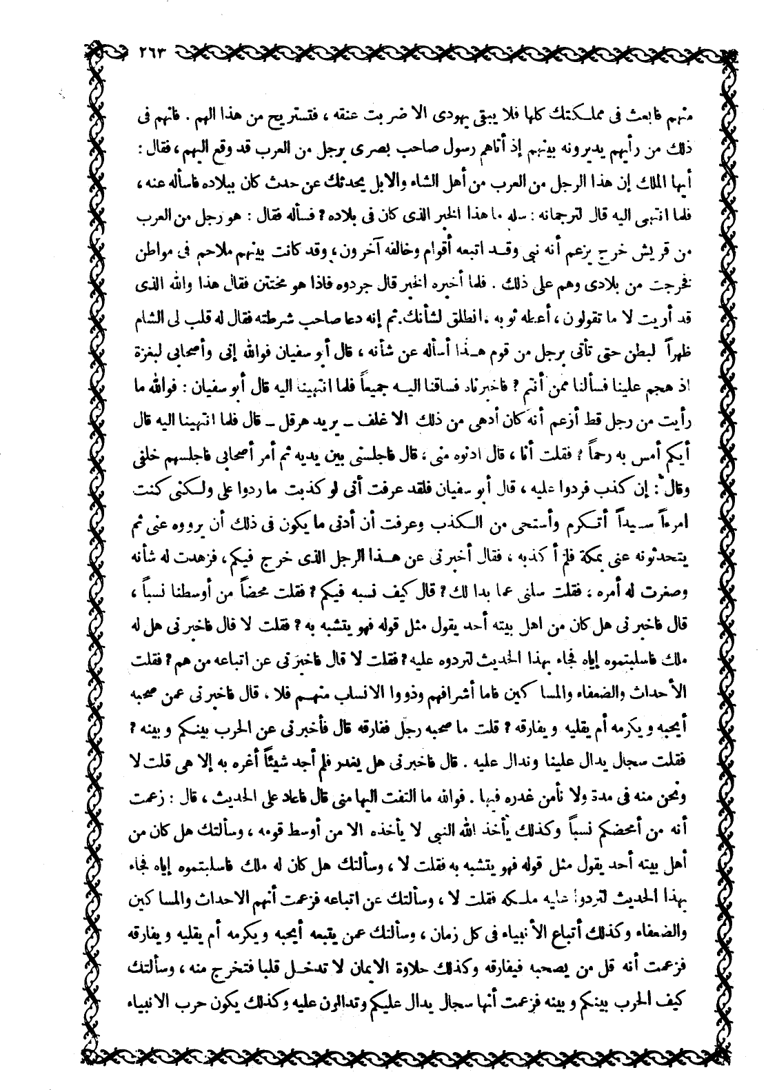 أَيُّهَا الْمَلِكُ إِنَّ هَذَا الرَّجُلَ مِنَ الْعَرَبِ مَنْ أَهْلِ الشَّاءِ وَالْإِبِلِ يُحَدِّثُكَ عَنْ حَدَثٍ كَانَ بِبِلَادِهِ فَاسْأَلْهُ عَنْهُ، فَلَمَّا انْتَهَى إِلَيْهِ قَالَ لِتُرْجُمَانِهِ: سَلْهُ مَا هَذَا الْخَبَرُ الَّذِي كَانَ فِي بلاده؟ فسأله فقال: هو رَجُلٌ مِنَ الْعَرَبِ مِنْ قُرَيْشٍ خَرَجَ يَزْعُمُ أَنَّهُ نَبِيٌّ وَقَدِ اتَّبَعَهُ أَقْوَامٌ وَخَالَفَهُ آخَرُونَ، وَقَدْ كَانَتْ بَيْنَهُمْ مَلَاحِمُ فِي مَوَاطِنَ فَخَرَجْتُ مِنْ بِلَادِي وَهُمْ عَلَى ذَلِكَ. فَلَمَّا أَخْبَرَهُ الخبر قال جردوه فإذا هو مختتن فَقَالَ هَذَا وَاللَّهِ الَّذِي قَدْ أُرِيتُ لَا مَا تَقُولُونَ، أَعْطِهِ ثَوْبَهُ، انْطَلِقْ لِشَأْنِكَ. ثُمَّ إِنَّهُ دَعَا صَاحِبَ شُرْطَتِهِ فَقَالَ لَهُ قَلِّبْ لِيَ الشَّامَ ظَهْرًا لِبَطْنٍ حَتَّى تَأْتِيَ بِرَجُلٍ مِنْ قَوْمِ هَذَا أَسْأَلُهُ عَنْ شَأْنِهِ، قَالَ أبو سفيان فو الله إِنِّي وَأَصْحَابِي لَبِغَزَّةَ إِذْ هَجَمَ عَلَيْنَا فَسَأَلَنَا مِمَّنْ أَنْتُمْ؟ فَأَخْبَرْنَاهُ فَسَاقَنَا إِلَيْهِ جَمِيعًا فَلَمَّا انتهينا اليه قال أبو سفيان: فو الله مَا رَأَيْتُ مِنْ رَجُلٍ قَطُّ أَزْعُمُ أَنَّهُ كَانَ أَدْهَى مِنْ ذَلِكَ الْأَغْلَفِ- يُرِيدُ هِرَقْلَ- قَالَ فَلَمَّا انْتَهَيْنَا إِلَيْهِ قَالَ أَيُّكُمْ أَمَسُّ بِهِ رَحِمًا؟ فَقُلْتُ أَنَا، قَالَ أَدْنُوهُ مِنِّي، قال فأجلسني بين يديه ثم أمر أصحابى فَأَجْلَسَهُمْ خَلَفِي وَقَالَ: إِنْ كَذَبَ فَرُدُّوا عَلَيْهِ، قَالَ أَبُو سُفْيَانَ فَلَقَدْ عَرَفْتُ أَنِّي لَوْ كَذِبْتُ مَا رَدُّوا عَلَيَّ وَلَكِنِّي كُنْتُ امْرَأً سَيِّدًا أَتَكَرَّمُ وَأَسْتَحِي مِنَ الْكَذِبِ وَعَرَفْتُ أَنَّ أَدْنَى مَا يَكُونُ فِي ذَلِكَ أَنْ يَرْوُوهُ عنى ثم يتحدثونه عَنِّي بِمَكَّةَ فَلَمْ أَكْذِبْهُ، فَقَالَ أَخْبِرْنِي عَنْ هَذَا الرَّجُلِ الَّذِي خَرَجَ فِيكُمْ، فَزَهَّدْتُ لَهُ شأنه وصغرت له أمره، فقلت سلني عما بدا لك؟ قال كَيْفَ نَسَبُهُ فِيكُمْ؟ فَقُلْتُ مَحْضًا مِنْ أَوْسَطِنَا نَسَبًا، قَالَ فَأَخْبِرْنِي هَلْ كَانَ مِنْ أَهْلِ بَيْتِهِ أَحَدٌ يَقُولُ مِثْلَ قَوْلِهِ فَهُوَ يَتَشَبَّهُ به؟ فقلت لا قال فأخبرني هل له ملك فاسلبتموه إِيَّاهُ فَجَاءَ بِهَذَا الْحَدِيثِ لِتَرُدُّوهُ عَلَيْهِ؟ فَقُلْتُ لَا قَالَ فَأَخْبِرْنِي عَنْ أَتْبَاعِهِ مَنْ هُمْ؟ فَقُلْتُ الْأَحْدَاثُ وَالضُّعَفَاءُ وَالْمَسَاكِينُ فَأَمَّا أَشْرَافُهُمْ وَذَوُو الأنساب منهم فلا، قال فأخبرني عمن صحبه أيحبه ويكرمه أم يقليه ويفارقه؟ قلت مَا صَحِبَهُ رَجُلٌ فَفَارَقَهُ قَالَ فَأَخْبِرْنِي عَنِ الْحَرْبِ بَيْنَكُمْ وَبَيْنَهُ؟