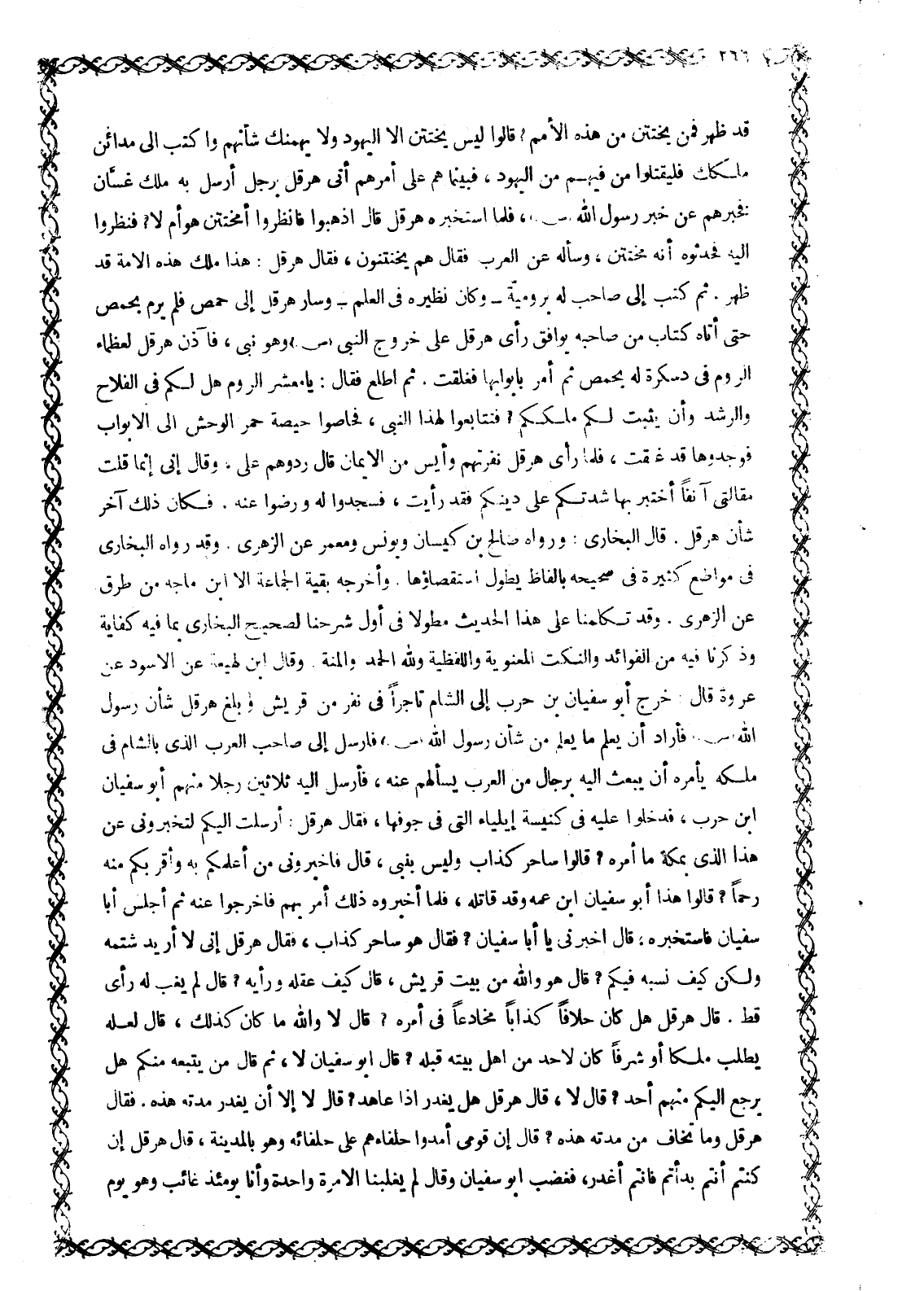 قد ظهر فمن يختتن من هذه الأمم؟ قالوا ليس يختتن الا اليهود ولا يُهِمَّنَّكَ شَأْنُهُمْ وَاكْتُبْ إِلَى مَدَائِنِ مُلْكِكَ فَلْيَقْتُلُوا مَنْ فِيهِمْ مِنَ الْيَهُودِ، فَبَيْنَمَا هُمْ عَلَى أَمْرِهِمْ أَتَى هِرَقْلُ بِرَجُلٍ أَرْسَلَ بِهِ مَلِكُ غسّان فخبرهم عَنْ خَبَرِ رَسُولُ اللَّهِ صَلَّى اللَّهُ عَلَيْهِ وَسَلَّمَ، فَلَمَّا اسْتَخْبَرَهُ هِرَقْلُ قَالَ اذْهَبُوا فَانْظُرُوا أَمُخْتَتِنٌ هُوَ أَمْ لَا؟ فَنَظَرُوا إِلَيْهِ فَحَدَّثُوهُ أَنَّهُ مُخْتَتِنٌ، وَسَأَلَهُ عَنِ الْعَرَبِ فَقَالَ هُمْ يَخْتَتِنُونَ، فَقَالَ هِرَقْلُ: هَذَا مُلْكُ هَذِهِ الْأُمَّةِ قد ظهر. ثم كتب إِلَى صَاحِبٍ لَهُ بِرُومِيَّةَ- وَكَانَ نَظِيرَهُ فِي الْعِلْمِ- وَسَارَ هِرَقْلُ إِلَى حِمْصَ فَلَمْ يَرِمْ بحمص حَتَّى أَتَاهُ كِتَابٌ مِنْ صَاحِبِهِ يُوَافِقُ رَأْيَ هِرَقْلَ عَلَى خُرُوجِ النَّبِيِّ صَلَّى اللَّهُ عَلَيْهِ وسلّم وهو نَبِيٌّ، فَأَذِنَ هِرَقْلُ لِعُظَمَاءِ الرُّومِ فِي دَسْكَرَةٍ لَهُ بِحِمْصَ ثُمَّ أَمَرَ بِأَبْوَابِهَا فَغُلِّقَتْ، ثُمَّ اطَّلَعَ فَقَالَ: يَا مَعْشَرَ الرُّومِ هَلْ لَكُمْ فِي الْفَلَاحِ وَالرُّشْدِ وَأَنْ يَثْبُتَ لَكُمْ مُلْكُكُمْ؟ فتتابعوا لِهَذَا النَّبِيِّ، فَحَاصُوا حَيْصَةَ حُمْرِ الْوَحْشِ إِلَى الأبواب فوجدوها قد غقت، فَلَمَّا رَأَى هِرَقْلُ نَفْرَتَهُمْ وَأَيِسَ مِنَ الْإِيمَانِ قَالَ رُدُّوهُمْ عَلَيَّ، وَقَالَ إِنِّي إِنَّمَا قُلْتُ مَقَالَتِي آنِفًا أَخْتَبِرُ بِهَا شِدَّتَكُمْ عَلَى دِينِكُمْ فَقَدْ رَأَيْتُ، فَسَجَدُوا لَهُ وَرَضُوا عَنْهُ. فَكَانَ ذَلِكَ آخِرَ شَأْنِ هِرَقْلَ. قَالَ الْبُخَارِيُّ: وَرَوَاهُ صَالِحُ بْنُ كَيْسَانَ وَيُونُسُ وَمَعْمَرٌ عَنِ الزُّهْرِيِّ. وَقَدْ رَوَاهُ الْبُخَارِيُّ فِي مَوَاضِعَ كَثِيرَةٍ فِي صَحِيحِهِ بِأَلْفَاظٍ يَطُولُ اسْتِقْصَاؤُهَا. وَأَخْرَجَهُ بَقِيَّةُ الْجَمَاعَةِ إِلَّا ابْنَ مَاجَهْ مِنْ طُرُقٍ عَنِ الزُّهْرِيِّ. وَقَدْ تَكَلَّمْنَا عَلَى هَذَا الْحَدِيثِ مُطَوَّلًا فِي أَوَّلِ شَرْحِنَا لِصَحِيحِ الْبُخَارِيِّ بِمَا فِيهِ كِفَايَةٌ وَذَكَرْنَا فِيهِ مِنَ الْفَوَائِدِ وَالنُّكَتِ الْمَعْنَوِيَّةِ وَاللَّفْظِيَّةِ وللَّه الْحَمْدُ وَالْمِنَّةُ. وَقَالَ ابْنُ لَهِيعَةَ عَنِ الْأَسْوَدِ عَنْ عُرْوَةَ قَالَ: خَرَجَ أَبُو سُفْيَانَ بْنُ حَرْبٍ إِلَى الشَّامِ تَاجِرًا فِي نَفَرٍ مِنْ قُرَيْشٍ وَبَلَغَ هِرَقْلَ شَأْنِ رَسُولِ اللَّهِ صَلَّى اللَّهُ عَلَيْهِ وَسَلَّمَ فَأَرَادَ أَنْ يَعْلَمَ ما يعلم مِنْ شَأْنِ رَسُولِ اللَّهِ صَلَّى اللَّهُ عَلَيْهِ وَسَلَّمَ فَأَرْسَلَ إِلَى صَاحِبِ الْعَرَبِ الَّذِي بِالشَّامِ في ملكه يأمره أَنْ يَبْعَثَ إِلَيْهِ بِرِجَالٍ مِنَ الْعَرَبِ يَسْأَلُهُمْ عَنْهُ، فَأَرْسَلَ إِلَيْهِ ثَلَاثِينَ رَجُلًا مِنْهُمْ أَبُو سفيان ابن حَرْبٍ، فَدَخَلُوا عَلَيْهِ فِي كَنِيسَةِ إِيلِيَاءَ الَّتِي فِي جَوْفِهَا، فَقَالَ هِرَقْلُ: أَرْسَلْتُ إِلَيْكُمْ لِتُخْبِرُونِي عَنْ هَذَا الَّذِي بِمَكَّةَ مَا أَمْرُهُ؟ قَالُوا ساحر كذاب وليس بنبي، قال فأخبروني من أعلمكم بِهِ وَأَقْرَبِكُمْ مِنْهُ رَحِمًا؟ قَالُوا هَذَا أَبُو سُفْيَانَ ابْنُ عَمِّهِ وَقَدْ قَاتَلَهُ، فَلَمَّا أَخْبَرُوهُ ذَلِكَ أَمَرَ بِهِمْ فَأُخْرِجُوا عَنْهُ ثُمَّ أَجْلَسَ أَبَا سُفْيَانَ فَاسْتَخْبَرَهُ، قَالَ أَخْبِرْنِي يَا أَبَا سُفْيَانَ؟ فَقَالَ هُوَ سَاحِرٌ كَذَّابٌ، فَقَالَ هِرَقْلُ إِنِّي لَا أُرِيدُ شَتْمَهُ وَلَكِنْ كَيْفَ نَسَبُهُ فِيكُمْ؟ قَالَ هُوَ وَاللَّهِ مِنْ بَيْتِ قُرَيْشٍ، قال كيف عقله ورأيه؟ قال لم يغب له رأى قَطُّ، قَالَ هِرَقْلُ هَلْ كَانَ حَلَّافًا كَذَّابًا مُخَادِعًا فِي أَمْرِهِ؟ قَال