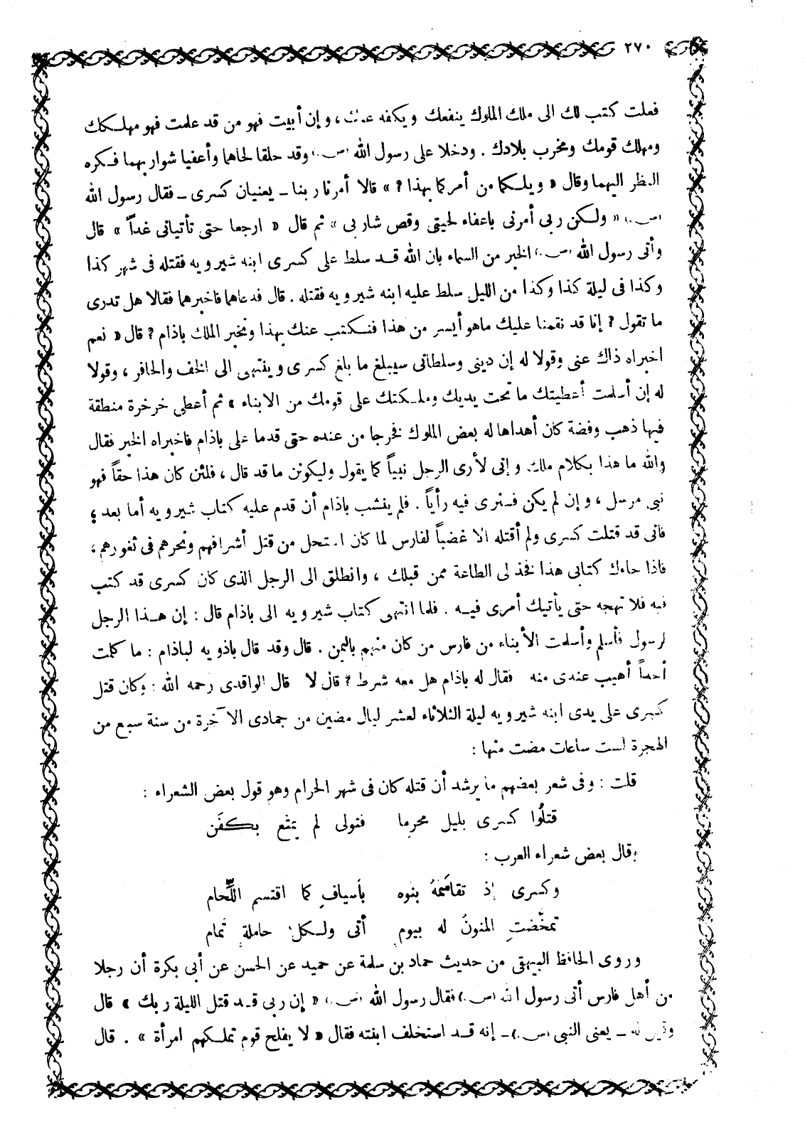 فَعَلْتَ كَتَبَ لَكَ إِلَى مَلِكِ الْمُلُوكِ يَنْفَعُكَ وَيَكُفُّهُ عَنْكَ، وَإِنْ أَبَيْتَ فَهُوَ مَنْ قَدْ عَلِمْتَ فَهُوَ مُهْلِكُكَ وَمُهْلِكُ قَوْمِكَ وَمُخَرِّبُ بِلَادِكَ. وَدَخَلَا عَلَى رَسُولِ اللَّهِ صَلَّى اللَّهُ عَلَيْهِ وَسَلَّمَ وَقَدْ حَلَقَا لِحَاهُمَا وَأَعْفَيَا شَوَارِبَهُمَا فَكَرِهَ النَّظَرَ إِلَيْهِمَا وَقَالَ «وَيْلَكُمَا مَنْ أَمَرَكُمَا بِهَذَا؟» قَالَا أَمَرَنَا رَبُّنَا- يَعْنِيَانِ كِسْرَى- فَقَالَ رَسُولُ اللَّهِ صَلَّى اللَّهُ عَلَيْهِ وَسَلَّمَ «وَلَكِنَّ رَبِّي أَمَرَنِي بِإِعْفَاءِ لِحْيَتِي وَقَصِّ شَارِبِي» ثُمَّ قَالَ «ارْجِعَا حَتَّى تَأْتِيَانِي غَدًا» قَالَ وَأَتَى رَسُولَ اللَّهِ صَلَّى اللَّهُ عَلَيْهِ وَسَلَّمَ الْخَبَرُ مِنَ السَّمَاءِ بِأَنَّ اللَّهَ قَدْ سَلَّطَ عَلَى كِسْرَى ابْنَهُ شِيرَوَيْهِ فَقَتَلَهُ فِي شَهْرِ كَذَا وَكَذَا فِي لَيْلَةِ كَذَا وَكَذَا مِنَ اللَّيْلِ سُلِّطَ عَلَيْهِ ابْنُهُ شِيرَوَيْهِ فَقَتَلَهُ. قَالَ فَدَعَاهُمَا فَأَخْبَرَهُمَا فَقَالَا هَلْ تَدْرِي مَا تَقُولُ؟ إِنَّا قَدْ نَقَمْنَا عَلَيْكَ مَا هُوَ أَيْسَرُ مِنْ هَذَا فَنَكْتُبُ عَنْكَ بِهَذَا وَنُخْبِرُ الْمَلِكَ بَاذَامَ؟ قَالَ «نعم أخبراه ذاك عَنِّي وَقُولَا لَهُ إِنَّ دِينِي وَسُلْطَانِي سَيَبْلُغُ ما بلغ كسرى وينتهى الى الْخُفِّ وَالْحَافِرِ، وَقُولَا لَهُ إِنْ أَسْلَمْتَ أَعْطَيْتُكَ مَا تَحْتَ يَدَيْكَ وَمَلَّكْتُكَ عَلَى قَوْمِكَ مِنَ الْأَبْنَاءِ» ثُمَّ أَعْطَى خُرْخَرَةَ مِنْطَقَةً فِيهَا ذَهَبٌ وَفِضَّةٌ كَانَ أَهْدَاهَا لَهُ بَعْضُ الْمُلُوكِ فَخَرَجَا مِنْ عِنْدِهِ حَتَّى قَدِمَا عَلَى بَاذَامَ فَأَخْبَرَاهُ الْخَبَرَ فَقَالَ وَاللَّهِ مَا هَذَا بِكَلَامِ مَلِكٍ وَإِنِّي لَأَرَى الرَّجُلَ نَبِيًّا كَمَا يَقُولُ وَلَيَكُونَنَّ مَا قَدْ قَالَ، فَلَئِنْ كَانَ هَذَا حَقًّا فهو نَبِيٌّ مُرْسَلٌ، وَإِنْ لَمْ يَكُنْ فَسَنَرَى فِيهِ رأيا. فَلَمْ يَنْشَبْ بَاذَامُ أَنْ قِدِمَ عَلَيْهِ كِتَابُ شِيرَوَيْهِ أَمَّا بَعْدُ، فَإِنِّي قَدْ قَتَلْتُ كِسْرَى وَلَمْ أَقْتُلْهُ إِلَّا غَضَبًا لِفَارِسَ لِمَا كَانَ اسْتَحَلَّ مِنْ قَتْلِ أَشْرَافِهِمْ وَنَحْرِهِمْ فِي ثُغُورِهِمْ، فَإِذَا جَاءَكَ كِتَابِي هَذَا فَخُذْ لِيَ الطَّاعَةَ مِمَنْ قِبَلَكَ، وَانْطَلِقْ إِلَى الرَّجُلِ الَّذِي كَانَ كِسْرَى قَدْ كَتَبَ فِيهِ فَلَا تُهِجْهُ حَتَّى يَأْتِيَكَ أَمْرِي فِيهِ. فَلَمَّا انْتَهَى كِتَابُ شِيرَوَيْهِ إِلَى بَاذَامَ قَالَ: إِنَّ هَذَا الرَّجُلَ لَرَسُولٌ فَأَسْلَمَ وَأَسْلَمَتِ الْأَبْنَاءُ مِنْ فَارِسَ مَنْ كَانَ مِنْهُمْ بِالْيَمَنِ. قَالَ وَقَدْ قَالَ بَاذَوَيْهِ لِبَاذَامَ: مَا كَلَّمْتُ أَحَدًا أَهْيَبَ عِنْدِي مِنْهُ. فَقَالَ لَهُ بَاذَامُ هَلْ مَعَهُ شُرَطٌ؟ قَالَ لَا. قَالَ الْوَاقِدِيُّ رَحِمَهُ اللَّهُ: وَكَانَ قَتْلُ كِسْرَى عَلَى يَدَيِ ابْنِهِ شِيرَوَيْهِ لَيْلَةَ الثُّلَاثَاءِ لِعَشْرِ ليال مضين من جمادى الآخرة مِنْ سَنَةِ سَبْعٍ مِنَ الْهِجْرَةِ لِسِتِّ سَاعَاتٍ مَضَتْ مِنْهَا: