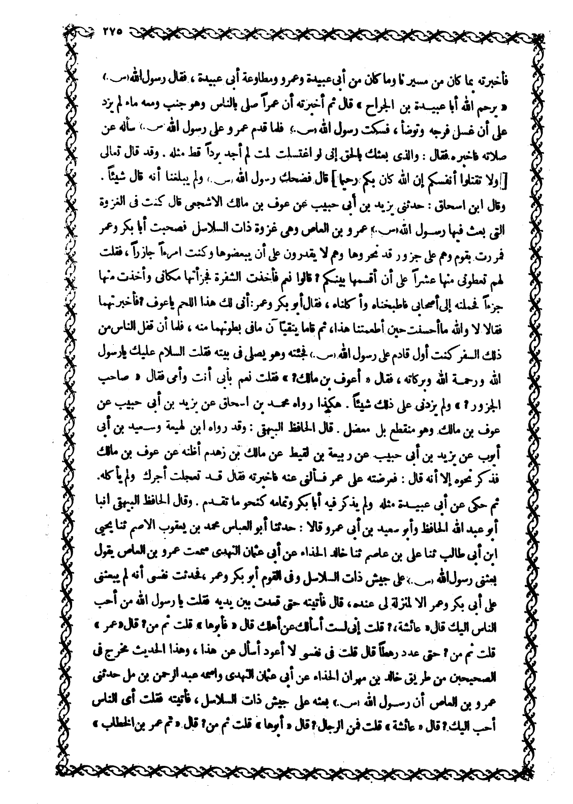 فَأَخْبَرْتُهُ بِمَا كَانَ مِنْ مَسِيرِنَا وَمَا كَانَ مِنْ أَبِي عُبَيْدَةَ وَعَمْرٍو وَمُطَاوَعَةُ أَبِي عُبَيْدَةَ، فَقَالَ رَسُولُ اللَّهِ صَلَّى اللَّهُ عَلَيْهِ وَسَلَّمَ «يَرْحَمُ اللَّهُ أَبَا عُبَيْدَةَ بْنَ الْجَرَّاحِ» قَالَ ثُمَّ أَخْبَرْتُهُ أَنَّ عَمْرًا صَلَّى بِالنَّاسِ وَهُوَ جُنُبٌ وَمَعَهُ مَاءٌ لَمْ يَزِدْ عَلَى أَنْ غَسَلَ فَرْجَهُ وَتَوَضَّأَ، فَسَكَتَ رَسُولُ اللَّهِ صَلَّى اللَّهُ عَلَيْهِ وَسَلَّمَ فَلَمَّا قَدِمَ عَمْرٌو عَلَى رَسُولِ اللَّهِ صَلَّى اللَّهُ عَلَيْهِ وَسَلَّمَ سأله عَنْ صَلَاتِهِ فَأَخْبَرَهُ فَقَالَ: وَالَّذِي بَعَثَكَ بِالْحَقِّ إني لو اغتسلت لمت لم أَجِدْ بَرْدًا قَطُّ مِثْلَهُ. وَقَدْ قَالَ تَعَالَى وَلا تَقْتُلُوا أَنْفُسَكُمْ إِنَّ اللَّهَ كانَ بِكُمْ رَحِيماً 4: 29 قَالَ فَضَحِكَ رَسُولُ اللَّهِ صَلَّى اللَّهُ عَلَيْهِ وَسَلَّمَ وَلَمْ يَبْلُغْنَا أَنَّهُ قَالَ شَيْئًا. وَقَالَ ابْنُ إِسْحَاقَ: حَدَّثَنِي يَزِيدُ بْنُ أَبِي حَبِيبٍ عَنْ عَوْفِ بْنِ مَالِكٍ الْأَشْجَعِيِّ قَالَ كُنْتُ فِي الْغَزْوَةِ الَّتِي بَعَثَ فِيهَا رَسُولُ اللَّهِ صَلَّى اللَّهُ عَلَيْهِ وَسَلَّمَ عَمْرَو بْنَ الْعَاصِ وَهِيَ غَزْوَةُ ذَاتِ السَّلَاسِلِ فَصَحِبْتُ أَبَا بَكْرٍ وَعُمَرَ فَمَرَرْتُ بِقَوْمٍ وَهُمْ عَلَى جَزُورٍ قَدْ نحروها وهم لا يقدرون على أن يبعضوها وَكُنْتُ امْرَأً جَازِرًا، فَقُلْتُ لَهُمْ تُعْطُونِي مِنْهَا عشرا عَلَى أَنْ أُقَسِّمَهَا بَيْنَكُمْ؟ قَالُوا نَعَمْ فَأَخَذْتُ الشَّفْرَةَ فَجَزَّأْتُهَا مَكَانِي وَأَخَذْتُ مِنْهَا جُزْءًا فَحَمَلْتُهُ إِلَى أَصْحَابِي فَاطَّبَخْنَاهُ وَأَكَلْنَاهُ، فَقَالَ أَبُو بَكْرٍ وَعُمَرُ: أَنَّى لَكَ هَذَا اللَّحْمُ يَا عَوْفُ؟ فَأَخْبَرْتُهُمَا فَقَالَا لَا وَاللَّهِ مَا أَحْسَنْتَ حِينَ أطعمتنا هذا، ثم قاما يتقيّئان مَا فِي بُطُونِهِمَا مِنْهُ، فَلَمَّا أَنْ قَفَلَ النَّاسُ مِنْ ذَلِكَ السَّفَرِ كُنْتُ أَوَّلَ قَادِمٍ عَلَى رَسُولِ اللَّهِ صَلَّى اللَّهُ عَلَيْهِ وَسَلَّمَ فَجِئْتُهُ وَهُوَ يُصَلِّي فِي بَيْتِهِ فَقُلْتُ السَّلَامُ عَلَيْكَ يَا رَسُولَ اللَّهِ وَرَحْمَةُ اللَّهِ وَبَرَكَاتُهُ، فَقَالَ «أَعَوْفُ بْنُ مَالِكٍ؟» فَقُلْتُ نَعَمْ بِأَبِي أَنْتَ وَأُمِّي فَقَالَ «صَاحِبُ الْجَزُورِ؟» وَلَمْ يَزِدْنِي عَلَى ذَلِكَ شَيْئًا. هَكَذَا رَوَاهُ مُحَمَّدُ بْنُ إِسْحَاقَ عَنْ يَزِيدَ بْنِ أَبِي حَبِيبٍ عَنْ عَوْفِ بْنِ مَالِكٍ وَهُوَ مُنْقَطِعٌ بَلْ مُعْضَلٌ. قَالَ الْحَافِظُ الْبَيْهَقِيُّ: وَقَدْ رَوَاهُ ابْنُ لَهِيعَةَ وَسَعِيدُ بْنُ أَبِي أَيُّوبَ عَنْ يَزِيدَ بْنِ أَبِي حَبِيبٍ عَنْ رَبِيعَةَ بْنِ لَقِيطٍ عَنْ مالك بن زهدم أَظُنُّهُ عَنْ عَوْفِ بْنِ مَالِكٍ فَذَكَرَ نَحْوَهُ إِلَّا أَنَّهُ قَالَ: فَعَرَضْتُهُ عَلَى عُمَرَ فَسَأَلَنِي عَنْهُ فَأَخْبَرْتُهُ فَقَالَ قَدْ تَعَجَّلْتَ أَجْرَكَ وَلَمْ يَأْكُلْهُ.