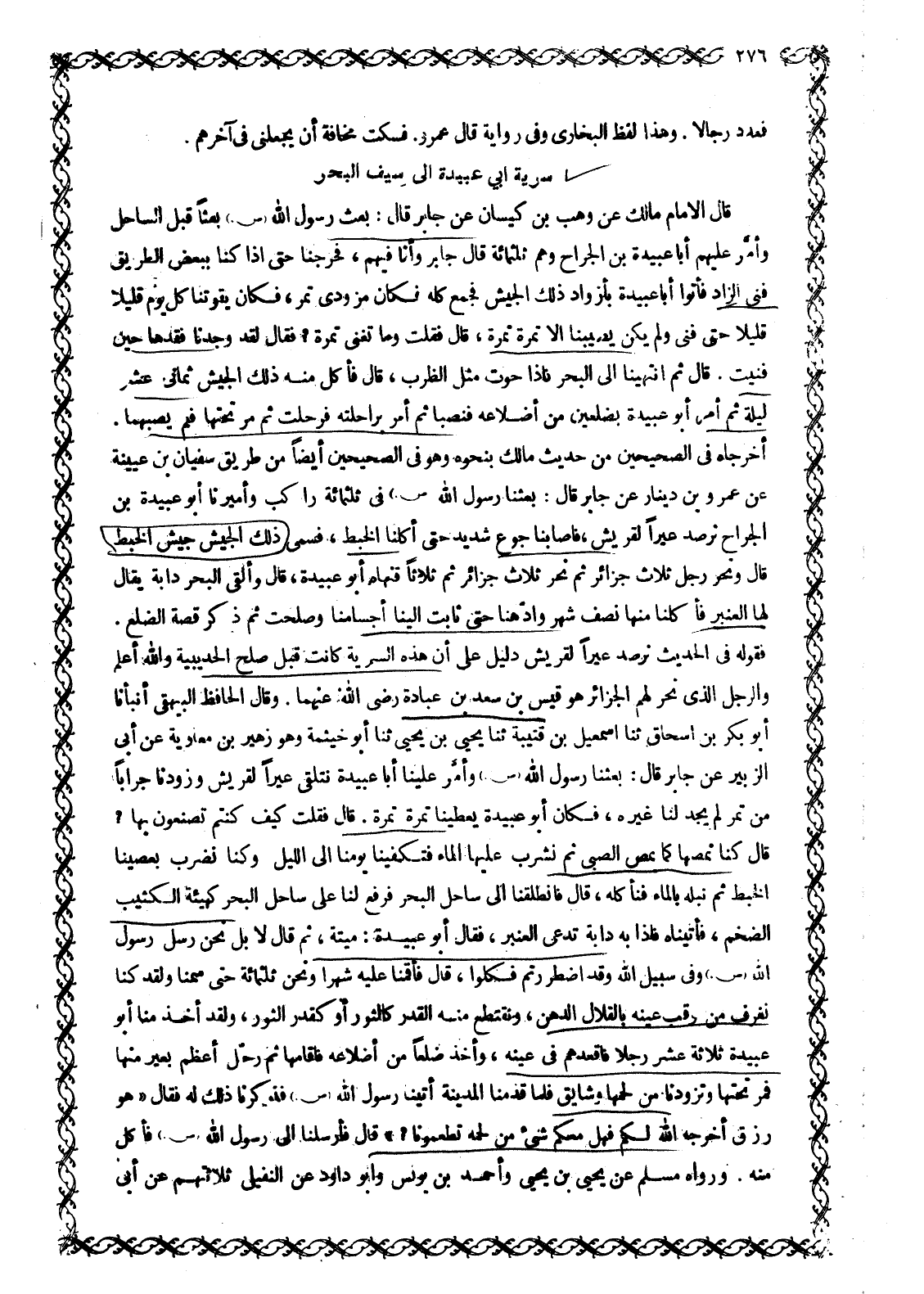 أَخْرَجَاهُ فِي الصَّحِيحَيْنِ مِنْ حَدِيثِ مَالِكٍ بِنَحْوِهِ وَهُوَ فِي الصَّحِيحَيْنِ أَيْضًا مِنْ طَرِيقِ سُفْيَانَ بْنِ عُيَيْنَةَ عَنْ عَمْرِو بْنِ دِينَارٍ عَنْ جَابِرٍ قَالَ: بَعَثَنَا رَسُولُ اللَّهِ صَلَّى اللَّهُ عَلَيْهِ وَسَلَّمَ فِي ثَلَاثِمِائَةِ رَاكِبٍ وَأَمِيرُنَا أَبُو عبيدة بن الجراح ترصد عِيرًا لِقُرَيْشٍ، فَأَصَابَنَا جُوعٌ شَدِيدٌ حَتَّى أَكَلْنَا الْخَبْطَ، فَسُمِّيَ ذَلِكَ الْجَيْشُ جَيْشُ الْخَبْطِ قَالَ وَنَحَرَ رَجُلٌ ثَلَاثَ جَزَائِرَ ثُمَّ نَحَرَ ثَلَاثَ جَزَائِرَ ثُمَّ ثَلَاثًا فَنَهَاهُ أَبُو عُبَيْدَةَ، قَالَ وَأَلْقَى الْبَحْرُ دَابَّةً يُقَالُ لَهَا الْعَنْبَرُ فَأَكَلْنَا مِنْهَا نِصْفَ شَهْرٍ وَادَّهَنَّا حَتَّى ثَابَتْ إِلَيْنَا أَجْسَامُنَا وَصَلَحَتْ ثُمَّ ذَكَرَ قِصَّةَ الضِّلَعِ.