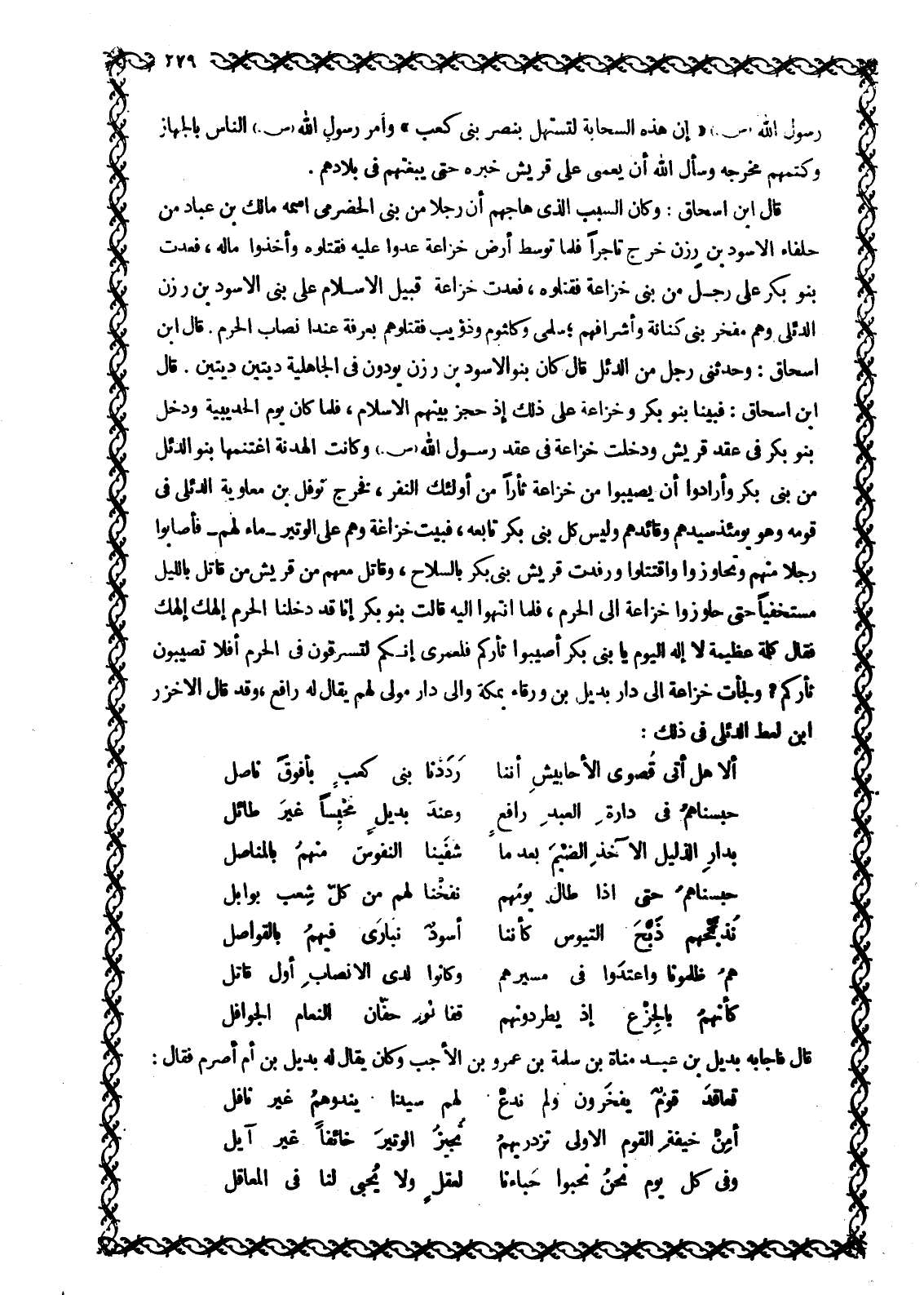 رَسُولُ اللَّهِ صَلَّى اللَّهُ عَلَيْهِ وَسَلَّمَ «إِنَّ هَذِهِ السَّحَابَةَ لَتَسْتَهِلُّ بِنَصْرِ بَنِي كَعْبٍ» وَأَمَرَ رَسُولُ اللَّهِ صَلَّى اللَّهُ عَلَيْهِ وَسَلَّمَ الناس بِالْجِهَازِ وَكَتَمَهُمْ مَخْرَجَهُ وَسَأَلَ اللَّهَ أَنْ يُعَمِّيَ عَلَى قُرَيْشٍ خَبَرَهُ حَتَّى يَبْغَتَهُمْ فِي بِلَادِهِمْ. قَالَ ابْنُ إِسْحَاقَ: وَكَانَ السَّبَبُ الَّذِي هَاجَهُمْ أَنَّ رَجُلًا مِنْ بَنِي الْحَضْرَمِيِّ اسْمُهُ مَالِكُ بْنُ عَبَّادٍ مِنْ حُلَفَاءِ الْأَسْوَدِ بْنِ رَزْنٍ خَرَجَ تَاجِرًا فَلَمَّا تَوَسَّطَ أَرْضَ خُزَاعَةَ عَدَوْا عَلَيْهِ فَقَتَلُوهُ وَأَخَذُوا مَالَهُ، فَعَدَتْ بَنُو بَكْرٍ عَلَى رَجُلٍ مِنْ بَنِي خُزَاعَةَ فَقَتَلُوهُ، فَعَدَتْ خُزَاعَةُ قُبَيْلِ الْإِسْلَامِ عَلَى بَنِي الْأَسْوَدِ بْنِ رزن الدئلي وهم مفخر بَنِي كِنَانَةَ وَأَشْرَافُهُمْ، سَلْمَى وَكُلْثُومٌ وَذُؤَيْبٌ فَقَتَلُوهُمْ بِعَرَفَةَ عِنْدَ أَنْصَابِ الْحَرَمِ. قَالَ ابْنُ إِسْحَاقَ: وَحَدَّثَنِي رَجُلٌ مِنَ الدُّئِلِ قَالَ كَانَ بَنُو الْأَسْوَدِ بْنِ رَزْنٍ يُودَوْنَ فِي الْجَاهِلِيَّةِ دِيَتَيْنِ دِيَتَيْنِ. قَالَ ابْنُ إِسْحَاقَ: فَبَيْنَا بَنُو بَكْرٍ وَخُزَاعَةُ عَلَى ذَلِكَ إِذْ حَجَزَ بَيْنَهُمُ الْإِسْلَامُ، فَلَمَّا كَانَ يَوْمَ الْحُدَيْبِيَةِ وَدَخَلَ بَنُو بَكْرٍ فِي عَقْدِ قُرَيْشٍ وَدَخَلَتْ خُزَاعَةُ فِي عَقْدِ رَسُولُ اللَّهِ صَلَّى اللَّهُ عَلَيْهِ وَسَلَّمَ وَكَانَتِ الْهُدْنَةُ اغْتَنَمَهَا بَنُو الدُّئِلِ مِنْ بَنِي بَكْرٍ وأرادوا أن يصيبوا من خزاعة ثأرا من أولئك النَّفَرِ، فَخَرَجَ نَوْفَلُ بْنُ مُعَاوِيَةَ الدُّئِلِيُّ فِي قَوْمِهِ وَهُوَ يَوْمَئِذٍ سَيِّدُهُمْ وَقَائِدُهُمْ وَلَيْسَ كُلُّ بَنِي بَكْرٍ تَابَعَهُ، فَبَيَّتَ خُزَاعَةَ وَهُمْ عَلَى الْوَتِيرِ- مَاءٍ لَهُمْ- فَأَصَابُوا رَجُلًا مِنْهُمْ وَتَحَاوَزُوا وَاقْتَتَلُوا وَرَفَدَتْ قُرَيْشٌ بَنِي بَكْرٍ بِالسِّلَاحِ، وَقَاتَلَ مَعَهُمْ مِنْ قُرَيْشٍ مَنْ قَاتَلَ بِاللَّيْلِ مُسْتَخْفِيًا حتى حاوزوا خُزَاعَةَ إِلَى الْحَرَمِ، فَلَمَّا انْتَهَوْا إِلَيْهِ قَالَتْ بنو بكر إِنَّا قَدْ دَخَلْنَا الْحَرَمَ إِلَهَكَ إِلَهَكَ فَقَالَ كَلِمَةً عَظِيمَةً لَا إِلَهَ الْيَوْمَ يَا بَنِي بَكْرٍ أَصِيبُوا ثَأْرَكُمْ فَلَعَمْرِي إِنَّكُمْ لَتَسْرِقُونِ فِي الحرم أفلا تصيبون ثأركم؟ وَلَجَأَتْ خُزَاعَةُ إِلَى دَارِ بُدَيْلِ بْنِ وَرْقَاءَ بِمَكَّةَ وَإِلَى دَارِ مَوْلًى لَهُمْ يُقَالُ لَهُ رافع، وقد قال الأخزر ابن لُعْطٍ الدُّئِلِيُّ فِي ذَلِكَ: