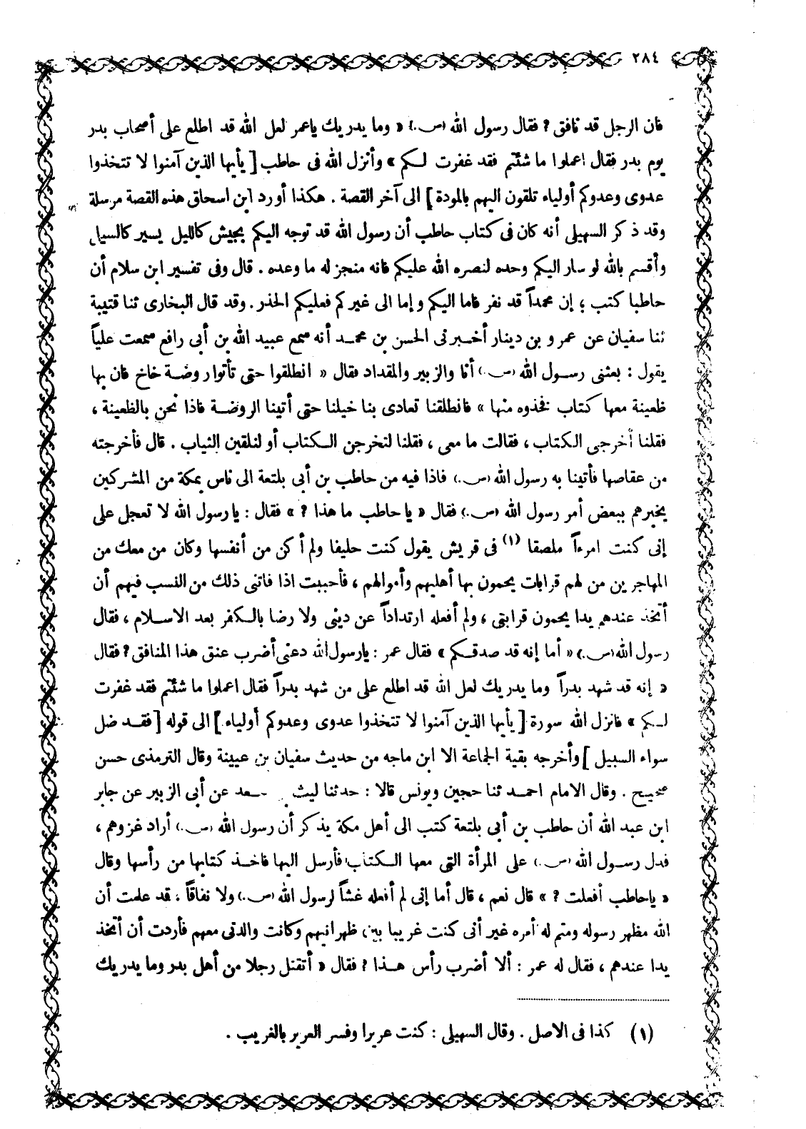 فَإِنَّ الرَّجُلَ قَدْ نَافَقَ؟ فَقَالَ رَسُولُ اللَّهِ صَلَّى اللَّهُ عَلَيْهِ وَسَلَّمَ «وَمَا يُدْرِيكَ يَا عمر لعل الله قد اطلع على أَصْحَابِ بَدْرٍ يَوْمَ بَدْرٍ فَقَالَ اعْمَلُوا مَا شِئْتُمْ فَقَدْ غَفَرْتُ لكم» وأنزل الله فِي حَاطِبٍ يَا أَيُّهَا الَّذِينَ آمَنُوا لَا تَتَّخِذُوا عَدُوِّي وَعَدُوَّكُمْ أَوْلِياءَ تُلْقُونَ إِلَيْهِمْ بِالْمَوَدَّةِ 60: 1 الى آخر القصة. هَكَذَا أَوْرَدَ ابْنُ إِسْحَاقَ هَذِهِ الْقِصَّةَ مُرْسَلَةً وَقَدْ ذَكَرَ السُّهَيْلِيُّ أَنَّهُ كَانَ فِي كِتَابِ حاطب أن رسول الله قَدْ تَوَجَّهَ إِلَيْكُمْ بِجَيْشٍ كَاللَّيْلِ يَسِيرُ كَالسَّيْلِ وَأُقْسِمُ باللَّه لَوْ سَارَ إِلَيْكُمْ وَحْدَهُ لَنَصَرَهُ اللَّهُ عَلَيْكُمْ فَإِنَّهُ مُنْجِزٌ لَهُ مَا وَعَدَهُ. قَالَ وَفِي تَفْسِيرِ ابْنِ سَلَّامٍ أَنَّ حَاطِبًا كَتَبَ، إِنَّ مُحَمَّدًا قَدْ نَفَرَ فَإِمَّا إِلَيْكُمْ وَإِمَّا إِلَى غَيْرِكُمْ فَعَلَيْكُمُ الْحَذَرَ. وَقَدْ قَالَ الْبُخَارِيُّ ثَنَا قُتَيْبَةُ ثَنَا سُفْيَانُ عَنْ عَمْرِو بْنِ دِينَارٍ أَخْبَرَنِي الْحَسَنُ بْنُ مُحَمَّدٍ أَنَّهُ سَمِعَ عُبَيْدَ اللَّهِ بْنَ أَبِي رَافِعٍ سَمِعْتُ عَلِيًّا يَقُولُ: بَعَثَنِي رَسُولُ اللَّهِ صَلَّى اللَّهُ عَلَيْهِ وَسَلَّمَ أَنَا وَالزُّبَيْرُ وَالْمِقْدَادُ فَقَالَ «انْطَلِقُوا حَتَّى تَأْتُوا رَوْضَةَ خَاخٍ فَإِنَّ بِهَا ظَعِينَةً مَعَهَا كِتَابٌ فَخُذُوهُ مِنْهَا» فَانْطَلَقْنَا تَعَادَى بِنَا خَيْلُنَا حَتَّى أَتَيْنَا الرَّوْضَةَ فَإِذَا نَحْنُ بِالظَّعِينَةِ، فقلنا أخرجى الكتاب، فقالت ما معى، فَقُلْنَا لَتُخْرِجِنَّ الْكِتَابَ أَوْ لَنُلْقِيَنَّ الثِّيَابَ. قَالَ فَأَخْرَجَتْهُ مِنْ عِقَاصِهَا فَأَتَيْنَا بِهِ رَسُولُ اللَّهِ صَلَّى اللَّهُ عَلَيْهِ وَسَلَّمَ فَإِذَا فِيهِ مِنْ حَاطِبِ بْنِ أَبِي بَلْتَعَةَ إِلَى نَاسٍ بِمَكَّةَ مِنَ الْمُشْرِكِينَ يُخْبِرُهُمْ بِبَعْضِ أَمْرِ رَسُولِ اللَّهِ صَلَّى اللَّهُ عَلَيْهِ وَسَلَّمَ فَقَالَ «يَا حَاطِبُ مَا هَذَا؟» فَقَالَ: يَا رَسُولَ اللَّهِ لَا تَعْجَلْ عَلَيَّ إِنِّي كُنْتُ امْرَأً مُلْصَقًا [1] فِي قُرَيْشٍ يَقُولُ كُنْتُ حَلِيفًا وَلَمْ أَكُنْ مِنْ أَنْفُسِهَا وَكَانَ مَنْ مَعَكَ مِنَ الْمُهَاجِرِينَ مَنْ لَهُمْ قَرَابَاتٌ يَحْمُونَ بِهَا أَهْلِيهِمْ وَأَمْوَالَهُمْ، فَأَحْبَبْتُ إذا فَاتَنِي ذَلِكَ مِنَ النَّسَبِ فِيهِمْ أَنْ أَتَّخِذَ عِنْدَهُمْ يَدًا يَحْمُونَ قَرَابَتِي، وَلَمْ أَفْعَلْهُ ارْتِدَادًا عَنْ دِينِي وَلَا رِضًا بِالْكُفْرِ بَعْدَ الْإِسْلَامِ، فَقَالَ رَسُولُ اللَّهِ صَلَّى اللَّهُ عَلَيْهِ وَسَلَّمَ «أَمَا إِنَّهُ قَدْ صَدَقَكُمْ» فَقَالَ عُمَرُ: يَا رَسُولَ اللَّهِ دَعْنِي أَضْرِبْ عُنُقَ هَذَا الْمُنَافِقِ؟ فَقَالَ «إِنَّهُ قَدْ شَهِدَ بَدْرًا وَمَا يُدْرِيكَ لَعَلَّ اللَّهَ قَدِ اطَّلَعَ عَلَى مَنْ شَهِدَ بَدْرًا فَقَالَ اعْمَلُوا مَا شِئْتُمْ فَقَدْ غَفَرْتُ لَكُمْ» فانزل الله سورة يَا أَيُّهَا الَّذِينَ آمَنُوا لَا تَتَّخِذُوا عَدُوِّي وَعَدُوَّكُمْ أَوْلِياءَ 60: 1 الى قوله فَقَدْ ضَلَّ سَواءَ السَّبِيلِ 60: 1 وَأَخْرَجَهُ بَقِيَّةُ الْجَمَاعَةِ إِلَّا ابْنَ مَاجَهْ مِنْ حَدِيثِ سُفْيَانَ بْنِ عُيَيْنَةَ وَقَالَ التِّرْمِذِيُّ حَسَنٌ صَحِيحٌ. وَقَالَ الْإِمَامُ أَحْمَدُ ثَنَا حُجَيْنٌ وَيُونُسُ قَالَا: حَدَّثَنَا لَيْثُ بْنُ سَعْدٍ عَنْ أَبِي الزبير عن جابر ابن عَبْدِ اللَّهِ أَنَّ حَاطِبَ بْنَ أَبِي بَلْتَعَةَ كَتَبَ إِلَى أَهْلِ مَكَّةَ يَذْكُرُ أَنَّ رَسُولَ اللَّهِ صَلَّى اللَّهُ عَلَيْهِ وَسَلَّمَ أَرَادَ غَزْوَهُمْ، فَدُلَّ رَسُولُ اللَّهِ صَلَّى اللَّهُ عَلَيْهِ وَسَلَّمَ عَلَى الْمَرْأَةِ