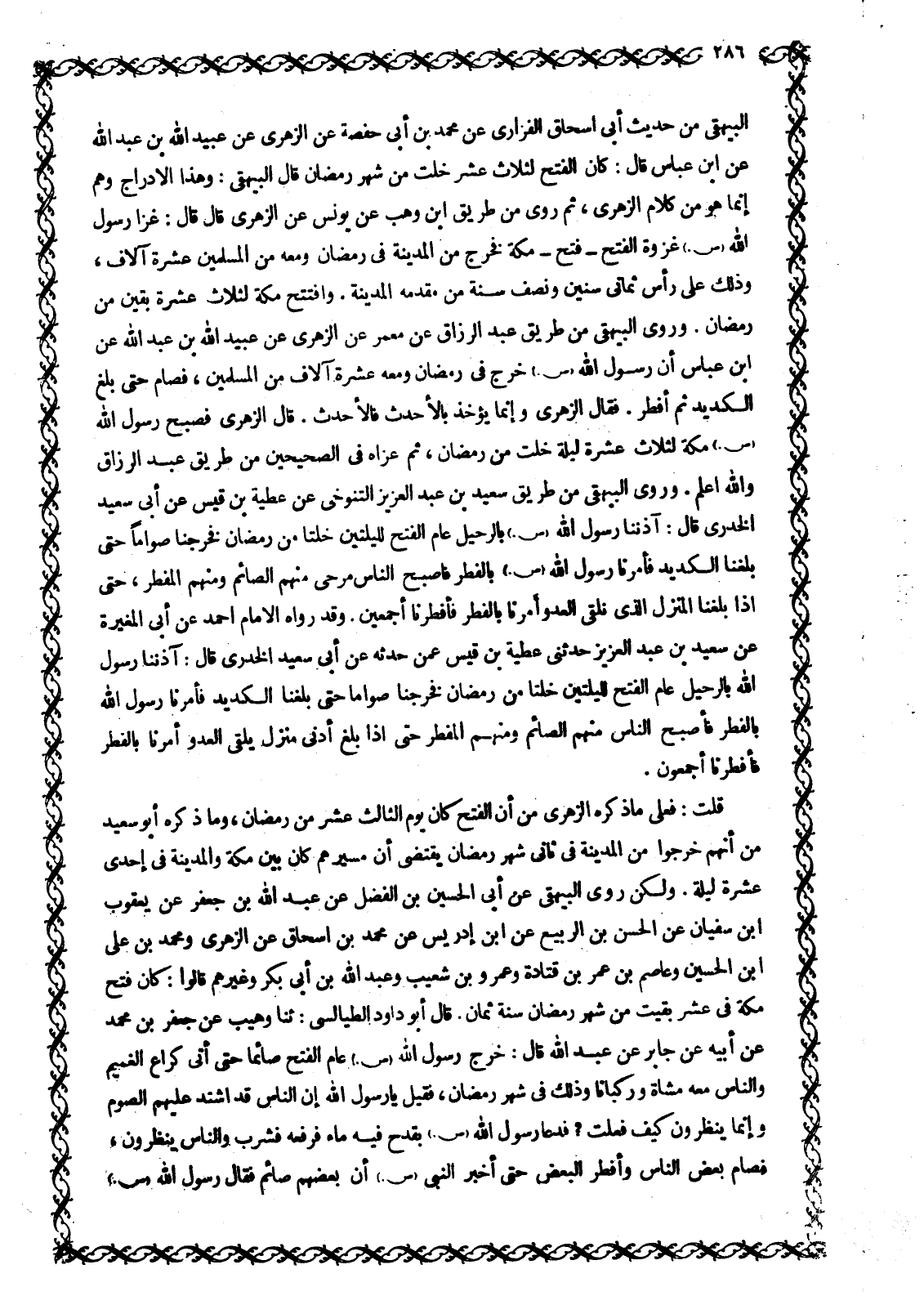 الْبَيْهَقِيُّ مِنْ حَدِيثِ أَبِي إِسْحَاقَ الْفَزَارِيِّ عَنْ مُحَمَّدِ بْنِ أَبِي حَفْصَةَ عَنِ الزُّهْرِيِّ عَنْ عُبَيْدِ اللَّهِ بْنِ عَبْدِ الله عن ابن عباس قال: كان الفتح لثلاث عشر خَلَتْ مِنْ شَهْرِ رَمَضَانَ قَالَ الْبَيْهَقِيُّ: وَهَذَا الْإِدْرَاجُ وَهْمٌ إِنَّمَا هُوَ مِنْ كَلَامِ الزُّهْرِيِّ، ثُمَّ رَوَى مِنْ طَرِيقِ ابْنِ وَهْبٍ عَنْ يُونُسَ عَنِ الزُّهْرِيِّ قَالَ قَالَ: غَزَا رَسُولُ اللَّهِ صَلَّى اللَّهُ عَلَيْهِ وَسَلَّمَ غَزْوَةَ الْفَتْحِ- فَتْحِ- مَكَّةَ فَخَرَجَ مِنَ الْمَدِينَةِ فِي رَمَضَانَ وَمَعَهُ مِنَ الْمُسْلِمِينَ عَشَرَةُ آلَافٍ، وَذَلِكَ عَلَى رَأْسِ ثَمَانِي سِنِينَ وَنِصْفِ سَنَةٍ مِنْ مَقْدَمِهِ الْمَدِينَةَ. وَافْتَتَحَ مَكَّةَ لِثَلَاثَ عَشْرَةَ بَقِينَ مِنْ رَمَضَانَ. وَرَوَى الْبَيْهَقِيُّ مِنْ طَرِيقِ عَبْدِ الرَّزَّاقِ عَنْ مَعْمَرٍ عَنْ الزُّهْرِيِّ عَنْ عُبَيْدِ اللَّهِ بْنِ عَبْدِ اللَّهِ عَنِ ابْنِ عَبَّاسٍ أَنَّ رَسُولَ اللَّهِ صَلَّى اللَّهُ عَلَيْهِ وَسَلَّمَ خَرَجَ فِي رَمَضَانَ وَمَعَهُ عَشَرَةُ آلَافٍ مِنَ الْمُسْلِمِينَ، فَصَامَ حَتَّى بَلَغَ الْكَدِيدَ ثُمَّ أَفْطَرَ. فَقَالَ الزُّهْرِيُّ وَإِنَّمَا يُؤْخَذُ بِالْأَحْدَثِ فَالْأَحْدَثِ. قَالَ الزُّهْرِيُّ فَصَبَّحَ رَسُولُ اللَّهِ صَلَّى اللَّهُ عَلَيْهِ وَسَلَّمَ مَكَّةَ لِثَلَاثَ عَشْرَةَ لَيْلَةً خلت من رمضان، ثم عزاه في الصَّحِيحَيْنِ مِنْ طَرِيقِ عَبْدِ الرَّزَّاقِ وَاللَّهُ أَعْلَمُ. وَرَوَى الْبَيْهَقِيُّ مِنْ طَرِيقِ سَعِيدِ بْنِ عَبْدِ الْعَزِيزِ التَّنُوخِيِّ عَنْ عَطِيَّةَ بْنِ قَيْسٍ عَنْ أَبِي سَعِيدٍ الْخُدْرِيِّ قَالَ: آذَنَنَا رَسُولُ اللَّهِ صَلَّى اللَّهُ عَلَيْهِ وَسَلَّمَ بِالرَّحِيلِ عَامَ الْفَتْحِ لِلَيْلَتَيْنِ خَلَتَا مِنْ رَمَضَانَ فَخَرَجْنَا صُوَّامًا حَتَّى بَلَغْنَا الْكَدِيدَ فَأَمَرَنَا رَسُولُ اللَّهِ صَلَّى اللَّهُ عَلَيْهِ وَسَلَّمَ بالفطر فأصبح الناس مرحى مِنْهُمُ الصَّائِمُ وَمِنْهُمُ الْمُفْطِرُ، حَتَّى إِذَا بَلَغْنَا المنزل الّذي نلقى العدو أمرنا بالفطر فأفطرنا أجمعين. وَقَدْ رَوَاهُ الْإِمَامُ أَحْمَدُ عَنْ أَبِي الْمُغِيرَةِ عَنْ سَعِيدِ بْنِ عَبْدِ الْعَزِيزِ حَدَّثَنِي عَطِيَّةُ بْنُ قَيْسٍ عَمَّنْ حَدَّثَهُ عَنْ أَبِي سَعِيدٍ الخدريّ قال: آذننا رسول الله بِالرَّحِيلِ عَامَ الْفَتْحِ لِلَيْلَتَيْنِ خَلَتَا مِنْ رَمَضَانَ فَخَرَجْنَا صُوَّامًا حَتَّى بَلَغْنَا الْكَدِيدَ فَأَمَرَنَا رَسُولُ الله بِالْفِطْرِ فَأَصْبَحَ النَّاسُ مِنْهُمُ الصَّائِمُ وَمِنْهُمُ الْمُفْطِرُ حتى إذا بلغ أدنى منزل يلقى الْعَدُوِّ أَمَرَنَا بِالْفِطْرِ فَأَفْطَرْنَا أَجْمَعُونَ.