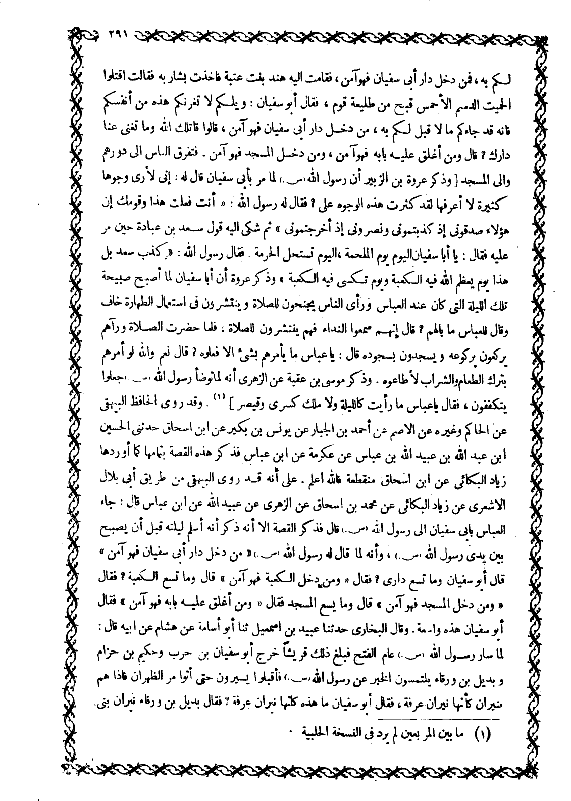 لَكُمْ بِهِ، فَمَنْ دَخَلَ دَارَ أَبِي سُفْيَانَ فَهُوَ آمِنٌ، فَقَامْتُ إِلَيْهِ هِنْدُ بِنْتُ عُتْبَةَ فأخذت بشار به فَقَالَتْ اقْتُلُوا الْحَمِيتَ الدَّسِمَ الْأَحْمَسَ قُبِّحَ مِنْ طَلِيعَةِ قَوْمٍ، فَقَالَ أَبُو سُفْيَانَ: وَيْلَكُمْ لَا تَغُرَّنَّكُمْ هَذِهِ مِنْ أَنْفُسِكُمْ فَإِنَّهُ قَدْ جَاءَكُمْ مَا لَا قِبَلَ لَكُمْ بِهِ، مَنْ دَخَلَ دَارَ أَبِي سُفْيَانَ فَهُوَ آمِنٌ، قَالُوا قَاتَلَكَ اللَّهُ وَمَا تُغْنِي عَنَّا دَارُكَ؟ قَالَ وَمَنْ أَغْلَقَ عَلَيْهِ بَابَهُ فَهُوَ آمِنٌ، وَمَنْ دَخَلَ الْمَسْجِدَ فَهُوَ آمِنٌ. فَتَفَرَّقَ النَّاسُ إِلَى دَوْرِهِمْ وَإِلَى الْمَسْجِدِ [وَذَكَرَ عُرْوَةُ بْنُ الزُّبَيْرِ أَنَّ رَسُولَ اللَّهِ صَلَّى اللَّهُ عَلَيْهِ وَسَلَّمَ لما مَرَّ بِأَبِي سُفْيَانَ قَالَ لَهُ: إِنِّي لَأَرَى وُجُوهًا كَثِيرَةً لَا أَعْرِفُهَا لَقَدْ كَثُرَتْ هَذِهِ الوجوه على؟ فقال له رسول الله: «أَنْتَ فَعَلْتَ هَذَا وَقَوْمُكَ إِنَّ هَؤُلَاءِ صَدَّقُونِي إِذْ كَذَّبْتُمُونِي وَنَصَرُونِي إِذْ أَخْرَجْتُمُونِي» ثُمَّ شَكَى إِلَيْهِ قَوْلَ سَعْدِ بْنِ عُبَادَةَ حِينَ مَرَّ عَلَيْهِ فَقَالَ: يَا أَبَا سُفْيَانَ الْيَوْمُ يَوْمُ الْمَلْحَمَةِ، الْيَوْمُ تُسْتَحَلُّ الْحُرْمَةُ. فَقَالَ رَسُولُ اللَّهِ: «كَذِبَ سَعْدٌ بَلْ هَذَا يَوْمٌ يُعَظِّمُ اللَّهُ فِيهِ الْكَعْبَةَ وَيَوْمٌ تُكْسَى فِيهِ الْكَعْبَةُ» وَذَكَرَ عُرْوَةُ أَنَّ أَبَا سُفْيَانَ لَمَّا أَصْبَحَ صَبِيحَةَ تِلْكَ اللَّيْلَةِ الَّتِي كَانَ عِنْدَ الْعَبَّاسِ وَرَأَى الناس يجنحون لِلصَّلَاةِ وَيَنْتَشِرُونَ فِي اسْتِعْمَالِ الطَّهَارَةِ خَافَ وَقَالَ لِلْعَبَّاسِ مَا بَالُهُمْ؟ قَالَ إِنَّهُمْ سَمِعُوا النِّدَاءَ فَهُمْ يَنْتَشِرُونَ لِلصَّلَاةِ، فَلَمَّا حَضَرَتِ الصَّلَاةُ وَرَآهُمْ يَرْكَعُونَ بِرُكُوعِهِ وَيَسْجُدُونَ بِسُجُودِهِ قَالَ: يَا عَبَّاسُ مَا يَأْمُرُهُمْ بِشَيْءٍ إِلَّا فَعَلُوهُ؟ قَالَ نَعَمْ وَاللَّهِ لَوْ أَمَرَهُمْ بِتَرْكِ الطَّعَامِ وَالشَّرَابِ لَأَطَاعُوهُ. وَذَكَرَ مُوسَى بْنُ عُقْبَةَ عَنِ الزُّهْرِيِّ أَنَّهُ لَمَّا تَوَضَّأَ رَسُولُ اللَّهِ صَلَّى اللَّهُ عَلَيْهِ وَسَلَّمَ جَعَلُوا يَتَكَفَّفُونَ، فَقَالَ يَا عَبَّاسُ مَا رَأَيْتُ كَاللَّيْلَةِ وَلَا مُلْكَ كِسْرَى وَقَيْصَرَ] [1] . وَقَدْ رَوَى الْحَافِظُ الْبَيْهَقِيُّ عَنِ الْحَاكِمِ وَغَيْرِهِ عَنِ الْأَصَمِّ عَنْ أَحْمَدَ بْنِ الْجَبَّارِ عَنْ يُونُسَ بْنِ بُكَيْرٍ عَنِ ابْنِ إِسْحَاقَ حَدَّثَنِي الْحُسَيْنُ ابن عَبْدِ اللَّهِ بْنِ عُبَيْدِ اللَّهِ بْنِ عَبَّاسٍ عَنْ عِكْرِمَةَ عَنِ ابْنِ عَبَّاسٍ فَذَكَرَ هَذِهِ الْقِصَّةَ بِتَمَامِهَا كَمَا أَوْرَدَهَا زِيَادٌ الْبَكَّائِيُّ عَنِ ابْنِ إِسْحَاقَ مُنْقَطِعَةً فاللَّه أَعْلَمُ. عَلَى أَنَّهُ قَدْ رَوَى الْبَيْهَقِيُّ مِنْ طَرِيقِ أَبِي بِلَالٍ الْأَشْعَرِيِّ عَنْ زِيَادٌ الْبَكَّائِيُّ عَنْ مُحَمَّدِ بْنِ إِسْحَاقَ عَنْ الزُّهْرِيِّ عَنْ عُبَيْدِ اللَّهِ عَنِ ابْنِ عَبَّاسٍ قَالَ: جَاءَ الْعَبَّاسُ بِأَبِي سُفْيَانَ إِلَى رَسُولِ اللَّهِ صَلَّى اللَّهُ عَلَيْهِ وَسَلَّمَ قَالَ فَذَكَرَ الْقِصَّةَ إِلَّا أَنَّهُ ذَكَرَ أَنَّهُ أسلم لَيْلَتِهِ قَبْلَ أَنْ يُصْبِحَ بَيْنَ يَدَيْ رَسُولِ اللَّهِ صَلَّى اللَّهُ عَلَيْهِ وَسَلَّمَ، وَأَنَّهُ لَمَّا قَالَ لَهُ رَسُولُ اللَّهِ صَلَّى اللَّهُ عَلَيْهِ وَسَلَّمَ «مَنْ دَخَلَ دَارَ أَبِي سُفْيَانَ فَهُوَ آمِنٌ» قَالَ أَبُو سُفْيَانَ وَمَا تَسَعُ دَارِي؟ فَقَالَ «وَمَنْ دَخَلَ الْكَعْبَةَ فَهُوَ آمِنٌ» قَالَ وَمَا تَسَعُ الْكَعْبَةُ؟ فَقَالَ «وَمَنْ دَخَلَ الْمَسْجِدَ فَهُوَ آمِنٌ» قَالَ وَمَا 