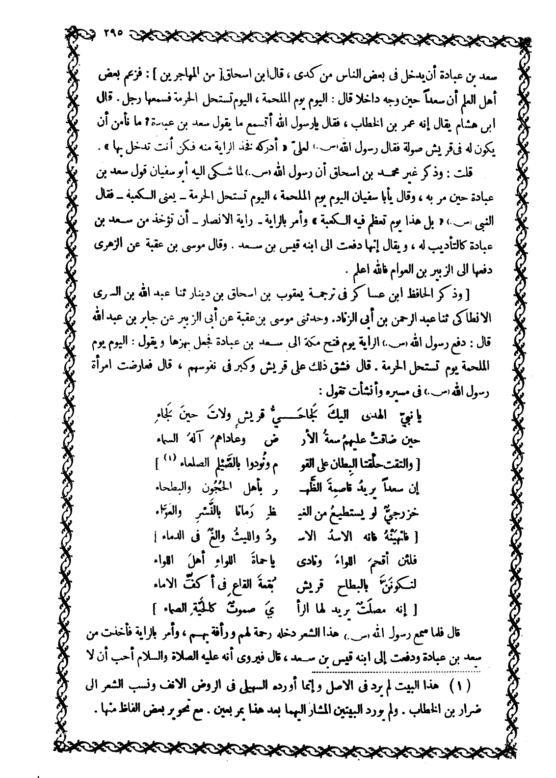 [وَذَكَرَ الْحَافِظُ ابْنُ عَسَاكِرَ فِي تَرْجَمَةِ يَعْقُوبَ بْنِ إِسْحَاقَ بْنِ دِينَارٍ ثَنَا عَبْدُ اللَّهِ بْنُ السَّرِيِّ الْأَنْطَاكِيُّ ثَنَا عَبْدُ الرَّحْمَنِ بْنُ أَبِي الزِّنَادِ. وَحَدَّثَنِي مُوسَى بْنِ عُقْبَةَ عَنْ أَبِي الزُّبَيْرِ عَنْ جَابِرِ بْنِ عَبْدِ اللَّهِ قَالَ: دَفَعَ رَسُولُ اللَّهِ صَلَّى اللَّهُ عَلَيْهِ وَسَلَّمَ الرَّايَةَ يَوْمَ فَتْحِ مَكَّةَ إِلَى سَعْدِ بْنِ عُبَادَةَ فَجَعَلَ يَهُزُّهَا وَيَقُولُ: الْيَوْمُ يَوْمُ الْمَلْحَمَةِ يَوْمٌ تُسْتَحَلُّ الْحُرْمَةُ. قَالَ فَشَقَّ ذَلِكَ عَلَى قُرَيْشٍ وَكَبُرَ فِي نُفُوسِهِمْ، قَالَ فَعَارَضَتِ امْرَأَةٌ رَسُولَ اللَّهِ صَلَّى اللَّهُ عَلَيْهِ وَسَلَّمَ فِي مَسِيرِهِ وأنشأت تقول:
