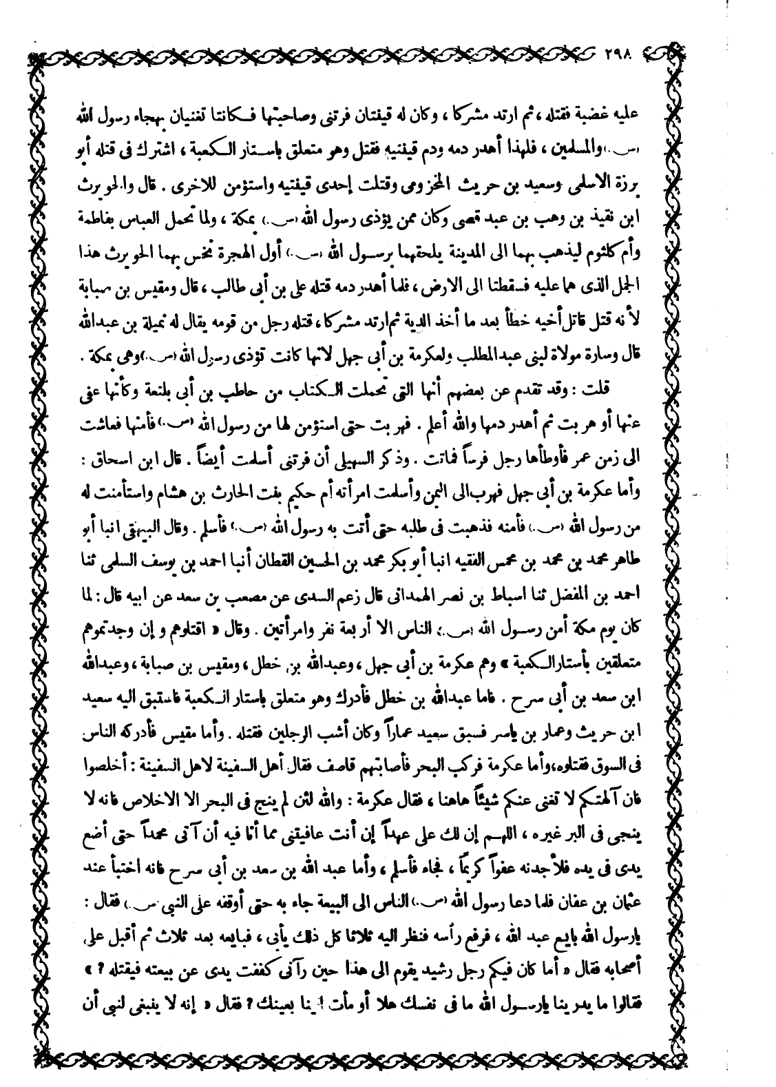 عَلَيْهِ غَضْبَةً فَقَتَلَهُ، ثُمَّ ارْتَدَّ مُشْرِكًا، وَكَانَ لَهُ قَيْنَتَانِ فَرْتَنَى وَصَاحِبَتُهَا فَكَانَتَا تُغَنِّيَانِ بِهِجَاءِ رسول الله صلى الله عليه وسلم والمسلمين، فَلِهَذَا أَهْدَرَ دَمَهُ وَدَمَ قَيْنَتَيْهِ فَقُتِلَ وَهُوَ مُتَعَلِّقٌ بِأَسْتَارِ الْكَعْبَةِ، اشْتَرَكَ فِي قَتْلِهِ أَبُو بَرْزَةَ الْأَسْلَمِيُّ وَسَعِيدُ بْنُ حُرَيْثٍ الْمَخْزُومِيُّ وَقُتِلَتْ إحدى قينتيه واستؤمن للأخرى. قال والحويرث ابن نقيذ بن وهب بن عبد قَصَيٍّ وَكَانَ مِمَنْ يُؤْذِي رَسُولَ اللَّهِ صَلَّى اللَّهُ عَلَيْهِ وَسَلَّمَ بِمَكَّةَ، وَلَمَّا تَحَمَّلَ الْعَبَّاسُ بِفَاطِمَةَ وَأُمِّ كُلْثُومٍ لِيَذْهَبَ بِهِمَا إِلَى الْمَدِينَةِ يُلْحِقُهُمَا بِرَسُولِ اللَّهِ صَلَّى اللَّهُ عَلَيْهِ وَسَلَّمَ أَوَّلَ الْهِجْرَةِ نَخَسَ بِهِمَا الْحُوَيْرِثُ هَذَا الْجَمَلَ الَّذِي هُمَا عَلَيْهِ فَسَقَطَتَا إِلَى الْأَرْضِ، فَلَمَّا أُهْدِرَ دَمُهُ قَتَلَهُ عَلِيُّ بْنُ أَبِي طَالِبٍ، قَالَ وَمِقْيَسُ بْنُ صُبَابَةَ لِأَنَّهُ قَتَلَ قَاتِلَ أخيه خطأ بعد ما أَخَذَ الدِّيَةَ ثُمَّ ارْتَدَّ مُشْرِكًا، قَتَلَهُ رَجُلٌ مِنْ قَوْمِهِ يُقَالُ لَهُ نُمَيْلَةُ بْنُ عَبْدِ اللَّهِ قَالَ وَسَارَةُ مَوْلَاةٌ لِبَنِي عَبْدِ الْمُطَّلِبِ وَلِعِكْرِمَةَ بْنِ أَبِي جَهْلٍ لِأَنَّهَا كَانَتْ تُؤْذِي رَسُولِ اللَّهِ صَلَّى اللَّهُ عَلَيْهِ وَسَلَّمَ وَهِيَ بِمَكَّةَ.