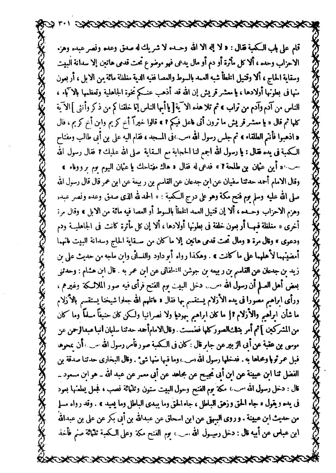 قَامَ عَلَى بَابِ الْكَعْبَةِ فَقَالَ: «لَا إِلَهَ إِلَّا اللَّهُ وَحْدَهُ لَا شَرِيكَ لَهُ صَدَقَ وَعْدَهُ وَنَصَرَ عَبْدَهُ وَهَزَمَ الْأَحْزَابَ وَحْدَهُ، أَلَا كُلُّ مَأْثُرَةٍ أَوْ دَمٍ أَوْ مَالٍ يُدَّعَى فَهُوَ مَوْضُوعٌ تَحْتَ قَدَمَيَّ هَاتَيْنِ إِلَّا سِدَانَةَ الْبَيْتِ وَسِقَايَةَ الْحَاجِّ، أَلَا وَقَتِيلُ الْخَطَأِ شِبْهِ الْعَمْدِ بِالسَّوْطِ وَالْعَصَا فَفِيهِ الدِّيَةُ مُغَلَّظَةً مِائَةٌ مِنَ الْإِبِلِ، أَرْبَعُونَ مِنْهَا فِي بُطُونِهَا أَوْلَادُهَا، يَا مَعْشَرَ قُرَيْشٍ إِنَّ اللَّهَ قَدْ أَذْهَبَ عَنْكُمْ نَخْوَةَ الْجَاهِلِيَّةِ وَتَعَظُّمَهَا بِالْآبَاءِ، النَّاسُ مِنْ آدَمَ وَآدَمُ مِنْ تُرَابٍ» ثُمَّ تَلَا هَذِهِ الْآيَةَ يَا أَيُّهَا النَّاسُ إِنَّا خَلَقْناكُمْ مِنْ ذَكَرٍ وَأُنْثى 49: 13 الآية كلها ثُمَّ قَالَ «يَا مَعْشَرَ قُرَيْشٍ مَا تَرَوْنَ أَنِّي فَاعِلٌ فِيكُمْ؟» قَالُوا خَيْرًا أَخٌ كَرِيمٌ وَابْنُ أَخٍ كَرِيمٍ، قَالَ «اذْهَبُوا فَأَنْتُمُ الطُّلَقَاءُ» ثُمَّ جَلَسَ رَسُولُ اللَّهِ صَلَّى اللَّهُ عَلَيْهِ وَسَلَّمَ فِي الْمَسْجِدِ، فَقَامَ إِلَيْهِ عَلِيُّ بْنُ أَبِي طَالِبٍ وَمِفْتَاحُ الْكَعْبَةِ فِي يَدِهِ فَقَالَ: يَا رَسُولَ اللَّهِ اجْمَعْ لَنَا الْحِجَابَةَ مَعَ السِّقَايَةِ صَلَّى اللَّهُ عَلَيْكَ؟ فَقَالَ رَسُولُ اللَّهِ صَلَّى اللَّهُ عَلَيْهِ وَسَلَّمَ «أَيْنَ عُثْمَانُ بْنُ طَلْحَةَ؟» فَدُعِيَ لَهُ فَقَالَ «هَاكَ مِفْتَاحُكَ يَا عُثْمَانُ الْيَوْمُ يَوْمُ بِرٍّ وَوَفَاءٍ» . وَقَالَ الْإِمَامُ أَحْمَدُ حَدَّثَنَا سُفْيَانُ عَنِ ابْنِ جُدْعَانَ عَنِ الْقَاسِمِ بْنِ رَبِيعَةَ عَنِ ابْنِ عُمَرَ قَالَ قَالَ رَسُولُ اللَّهِ صَلَّى اللَّهُ عَلَيْهِ وَسَلَّمَ يَوْمَ فَتْحِ مَكَّةَ وَهُوَ عَلَى دَرَجِ الْكَعْبَةِ: «الْحَمْدُ للَّه الَّذِي صَدَقَ وَعْدَهُ وَنَصَرَ عَبْدَهُ وَهَزَمَ الْأَحْزَابَ وَحْدَهُ، أَلَا إِنَّ قَتِيلَ الْعَمْدِ الْخَطَأِ بِالسَّوْطِ أَوِ الْعَصَا فِيهِ مِائَةٌ مِنَ الْإِبِلِ» وَقَالَ مَرَّةً أُخْرَى «مُغَلَّظَةً فِيهَا أَرْبَعُونَ خَلِفَةً فِي بُطُونِهَا أَوْلَادُهَا، أَلَا إِنَّ كُلَّ مَأْثُرَةٍ كَانَتْ فِي الْجَاهِلِيَّةِ وَدَمٍ وَدَعْوَى» وَقَالَ مَرَّةً «وَمَالٍ تَحْتَ قَدَمَيَّ هَاتَيْنِ إِلَّا مَا كان من سقاية الحاج وسدانة البيت فإنهما أَمْضَيْتُهُمَا لِأَهْلِهِمَا عَلَى مَا كَانَتْ» . وَهَكَذَا رَوَاهُ أَبُو دَاوُدَ وَالنَّسَائِيُّ وَابْنُ مَاجَهْ مِنْ حَدِيثِ عَلِيِّ بْنِ زَيْدِ بْنِ جُدْعَانَ عَنِ الْقَاسِمِ بْنِ رَبِيعَةَ بْنِ جَوْشَنٍ الْغَطْفَانِيِّ عَنِ ابْنِ عُمَرَ بِهِ. قَالَ ابْنُ هِشَامٍ: وَحَدَّثَنِي بَعْضُ أَهْلِ الْعِلْمِ أَنَّ رَسُولَ اللَّهِ صَلَّى اللَّهُ عَلَيْهِ وَسَلَّمَ دَخَلَ الْبَيْتَ يَوْمَ الْفَتْحِ فَرَأَى فيه صور الملائكة وغيرهم، ورأى إبراهيم مُصَوَّرًا فِي يَدِهِ الْأَزْلَامُ يَسْتَقْسِمُ بِهَا فَقَالَ «قَاتَلَهُمُ اللَّهُ جَعَلُوا شَيْخَنَا يَسْتَقْسِمُ بِالْأَزْلَامِ مَا شَأْنُ إِبْرَاهِيمَ وَالْأَزْلَامِ؟ (مَا كَانَ إِبْرَاهِيمُ يَهُودِيًّا وَلَا نَصْرَانِيًّا وَلَكِنْ كَانَ حَنِيفًا مُسْلِمًا وَمَا كَانَ مِنَ الْمُشْرِكِينَ) ثُمَّ أَمَرَ بِتِلْكَ الصُّوَرِ كُلِّهَا فَطُمِسَتْ. وَقَالَ الامام أحمد حدثنا سليمان أنبأ عَبْدُ الرَّحْمَنِ عَنْ مُوسَى بْنِ عُقْبَةَ عَنْ أَبِي الزُّبَيْرِ عَنْ جَابِرٍ قَالَ: كَانَ فِي الْكَعْبَةِ صُوَرٌ فَأَمَرَ رَسُولُ اللَّهِ صَلَّى اللَّهُ عَلَيْهِ وَسَلَّمَ أَنْ يَمْحُوَهَا فَبَلَّ عُمَرُ ثَوْبًا وَمَحَاهَا بِهِ. فَدَخَلَهَا رَسُولُ اللَّهِ صَلَّى اللَّهُ عَلَيْهِ وَسَلَّمَ وَمَا فِيهَا مِنْهَا شَيْءٌ. وَقَالَ الْبُخَار