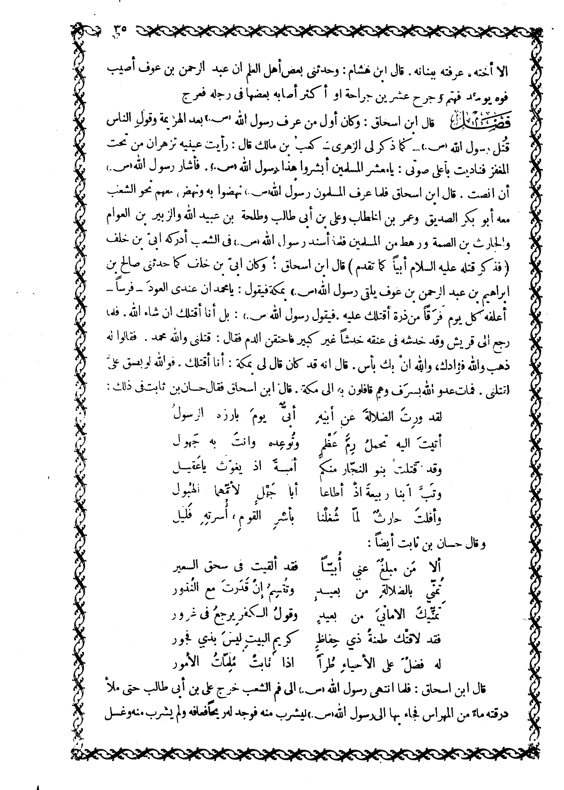 قَالَ ابْنُ إِسْحَاقَ: وَكَانَ أَوَّلَ مَنْ عَرَفَ رَسُولَ اللَّهِ صَلَّى اللَّهُ عَلَيْهِ وَسَلَّمَ بَعْدَ الْهَزِيمَةِ وَقَوْلِ النَّاسِ قُتِلَ رَسُولِ اللَّهِ صَلَّى اللَّهُ عَلَيْهِ وَسَلَّمَ- كَمَا ذَكَرَ لِي الزُّهْرِيُّ- كَعْبُ بْنُ مَالِكٍ قَالَ: رَأَيْتُ عَيْنَيْهِ تُزْهِرَانِ مِنْ تَحْتِ الْمِغْفَرِ فَنَادَيْتُ بِأَعْلَى صَوْتِي: يَا مَعْشَرَ الْمُسْلِمِينَ أَبْشِرُوا هَذَا رَسُولُ اللَّهِ صَلَّى اللَّهُ عَلَيْهِ وَسَلَّمَ. فَأَشَارَ رَسُولُ اللَّهِ صَلَّى اللَّهُ عَلَيْهِ وَسَلَّمَ أَنْ أَنْصِتْ. قَالَ ابْنُ إِسْحَاقَ فَلَمَّا عَرَفَ الْمُسْلِمُونَ رَسُولَ اللَّهِ صَلَّى اللَّهُ عَلَيْهِ وَسَلَّمَ نَهَضُوا بِهِ وَنَهَضَ مَعَهُمْ نَحْوُ الشِّعْبِ مَعَهُ أَبُو بَكْرٍ الصَّدِّيقُ وَعُمَرُ بْنُ الْخَطَّابِ وَعَلِيُّ بْنُ أَبِي طَالِبٍ وَطَلْحَةَ بْنِ عُبَيْدِ اللَّهِ وَالزُّبَيْرِ بْنِ الْعَوَّامِ وَالْحَارِثُ بْنُ الصِّمَّةِ وَرَهْطٌ مِنَ الْمُسْلِمِينَ فَلَمَّا أُسْنِدَ رَسُولُ اللَّهِ صَلَّى اللَّهُ عَلَيْهِ وَسَلَّمَ فِي الشِّعْبِ أَدْرَكَهُ أُبَيُّ بن خلف (فذكر قتله عليه السلام أُبَيًّا كَمَا تَقَدَّمَ) قَالَ ابْنُ إِسْحَاقَ: وَكَانَ أُبَيُّ بْنُ خَلَفٍ كَمَا حَدَّثَنِي صَالِحُ بْنُ إِبْرَاهِيمَ بْنِ عَبْدِ الرَّحْمَنِ بْنِ عَوْفٍ يَلْقَى رَسُولَ اللَّهِ صَلَّى اللَّهُ عَلَيْهِ وَسَلَّمَ بِمَكَّةَ فَيَقُولُ: يَا مُحَمَّدُ إِنَّ عِنْدِي الْعَوْدَ- فَرَسًا- أَعْلِفُهُ كُلَّ يَوْمٍ فَرَقًا مِنْ ذُرَةٍ أَقْتُلُكَ عَلَيْهِ. فَيَقُولُ رَسُولُ اللَّهِ صَلَّى اللَّهُ عَلَيْهِ وَسَلَّمَ: بَلْ أَنَا أَقْتُلُكَ إِنْ شَاءَ اللَّهُ. فَلَّمَا رَجَعَ إِلَى قُرَيْشٍ وَقَدْ خَدَشَهُ فِي عُنُقِهِ خَدْشًا غَيْرَ كَبِيرٍ فَاحْتَقَنَ الدَّمُ فَقَالَ: قَتَلَنِي وَاللَّهِ مُحَمَّدٌ. فَقَالُوا لَهُ ذَهَبَ وَاللَّهِ فُؤَادُكَ، وَاللَّهِ إِنَّ بِكَ بَأْسٌ. قَالَ إِنَّهُ قَدْ كَانَ قَالَ لِي بِمَكَّةَ: أَنَا أَقْتُلُكَ. فو الله لَوْ بَصَقَ عَلَيَّ لَقَتَلَنِي. فَمَاتَ عَدُوُّ اللَّهِ بِسَرِفٍ وَهُمْ قَافِلُونَ بِهِ إِلَى مَكَّةَ. قَالَ ابْنُ إِسْحَاقَ فَقَالَ حَسَّانُ بْنُ ثَابِتٍ فِي ذَلِكَ: