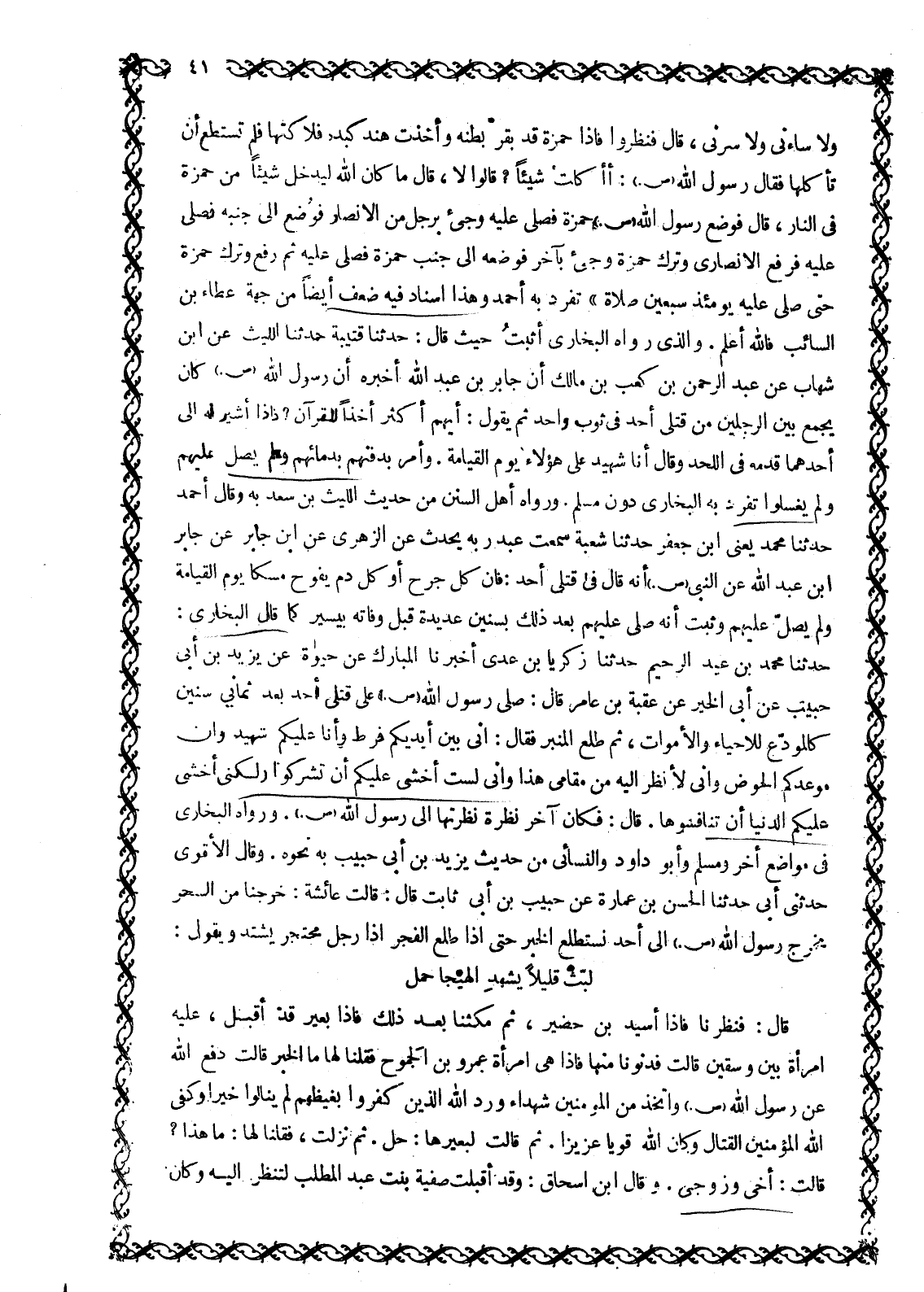 وَلَا سَاءَنِي وَلَا سَرَّنِي، قَالَ فَنَظَرُوا فَإِذَا حَمْزَةُ قَدْ بُقِرَ بَطْنُهُ وَأَخَذَتْ هِنْدُ كَبِدَهُ فَلَاكَتْهَا فَلَمْ تَسْتَطِعْ أَنْ تَأْكُلَهَا فَقَالَ رَسُولُ اللَّهِ صَلَّى اللَّهُ عَلَيْهِ وَسَلَّمَ: أأكلت شَيْئًا؟ قَالُوا لَا، قَالَ مَا كَانَ اللَّهُ لِيُدْخِلَ شَيْئًا مِنْ حَمْزَةَ فِي النَّارِ، قَالَ فَوَضَعَ رَسُولُ اللَّهِ صَلَّى اللَّهُ عَلَيْهِ وَسَلَّمَ حَمْزَةَ فَصَلَّى عَلَيْهِ وَجِيءَ بِرَجُلٍ مِنَ الْأَنْصَارِ فَوُضِعَ إِلَى جَنْبِهِ فَصَلَّى عَلَيْهِ فَرُفِعَ الْأَنْصَارِيُّ وترك حمزة وجيء بِآخِرَ فَوَضَعَهُ إِلَى جَنْبِ حَمْزَةَ فَصَلَّى عَلَيْهِ ثُمَّ رُفِعَ وَتُرِكَ حَمْزَةُ حَتَّى صَلَّى عَلَيْهِ يَوْمَئِذٍ سَبْعِينَ صَلَاةً» تَفَرَّدَ بِهِ أَحْمَدُ وَهَذَا إِسْنَادٌ فِيهِ ضَعْفٌ أَيْضًا مِنْ جِهَةِ عَطَاءِ بْنِ السَّائِبِ فاللَّه أَعْلَمُ. وَالَّذِي رَوَاهُ الْبُخَارِيُّ أَثْبَتَ حَيْثُ قَالَ: حَدَّثَنَا قُتَيْبَةُ حَدَّثَنَا اللَّيْثُ عَنِ ابْنِ شِهَابٍ عَنْ عَبْدِ الرَّحْمَنِ بْنِ كَعْبِ بْنِ مَالِكٍ أَنَّ جَابِرَ بْنَ عَبْدِ اللَّهِ أَخْبَرَهُ أَنَّ رَسُولَ اللَّهِ صَلَّى اللَّهُ عَلَيْهِ وَسَلَّمَ كَانَ يَجْمَعُ بَيْنَ الرَّجُلَيْنِ مِنْ قَتْلَى أُحُدٍ فِي ثَوْبٍ وَاحِدٍ ثُمَّ يَقُولُ: أيهم أكثر أخذا لقرآن؟ فإذا أشير له الى أحدهما قَدَّمَهُ فِي اللَّحْدِ وَقَالَ أَنَا شَهِيدٌ عَلَى هَؤُلَاءِ يَوْمَ الْقِيَامَةِ. وَأَمَرَ بِدَفْنِهِمْ بِدِمَائِهِمْ وَلَمْ يُصَلِّ عَلَيْهِمْ وَلَمْ يُغَسَّلُوا تَفَرَّدَ بِهِ الْبُخَارِيُّ دُونَ مُسْلِمٍ. وَرَوَاهُ أَهْلُ السُّنَنِ مِنْ حَدِيثِ اللَّيْثِ بْنِ سَعْدٍ بِهِ وَقَالَ أَحْمَدُ حَدَّثَنَا مُحَمَّدُ يَعْنِي ابْنَ جَعْفَرٍ حَدَّثَنَا شُعْبَةُ سَمِعْتُ عَبْدَ رَبِّهِ يُحَدِّثُ عَنِ الزُّهْرِيِّ عَنِ ابْنِ جابر عن جابر ابن عَبْدِ اللَّهِ عَنِ النَّبِيِّ صَلَّى اللَّهُ عَلَيْهِ وَسَلَّمَ أَنَّهُ قَالَ فِي قَتْلَى أُحُدٍ: فَإِنَّ كُلَّ جُرْحٍ أَوْ كُلَّ دَمٍ يَفُوحُ مِسْكًا يَوْمَ الْقِيَامَةِ وَلَمْ يُصَلِّ عَلَيْهِمْ وَثَبَتَ أَنَّهُ صَلَّى عَلَيْهِمْ بَعْدَ ذَلِكَ بِسِنِينَ عَدِيدَةٍ قَبْلَ وَفَاتِهِ بِيَسِيرٍ كَمَا قَالَ الْبُخَارِيُّ: