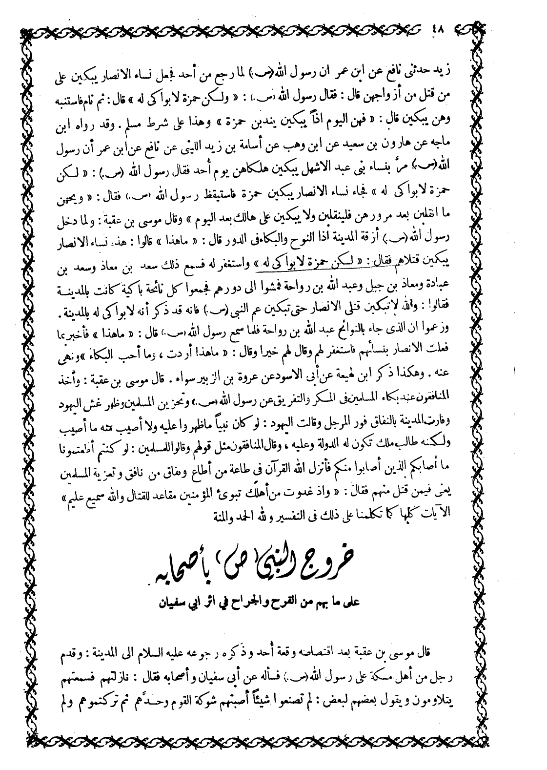 زَيْدٍ حَدَّثَنِي نَافِعٍ عَنِ ابْنِ عُمَرَ أَنَّ رَسُولَ اللَّهِ صَلَّى اللَّهُ عَلَيْهِ وَسَلَّمَ لما رَجَعَ مِنْ أُحُدٍ فَجَعَلَ نِسَاءُ الْأَنْصَارِ يَبْكِينَ عَلَى مَنْ قُتِلَ مِنْ أَزْوَاجِهِنَّ قَالَ: فَقَالَ رَسُولُ اللَّهِ صَلَّى اللَّهُ عَلَيْهِ وَسَلَّمَ: «وَلَكِنَّ حَمْزَةَ لَا بِوَاكِيَ لَهُ» قَالَ: ثُمَّ نَامَ فَاسْتَنْبَهَ وَهُنَّ يَبْكِينَ قَالَ: «فَهُنَّ الْيَوْمَ إِذًا يَبْكِينَ يَنْدُبْنَ حَمْزَةَ» وَهَذَا عَلَى شَرْطِ مُسْلِمٍ. وَقَدْ رَوَاهُ ابْنُ مَاجَهْ عَنْ هَارُونَ بْنِ سَعِيدٍ عَنِ ابْنِ وَهْبٍ عَنْ أُسَامَةَ بْنِ زَيْدٍ اللَّيْثِيِّ عَنْ نَافِعٍ عَنِ ابْنِ عُمَرَ أَنَّ رَسُولَ اللَّهِ صَلَّى اللَّهُ عَلَيْهِ وَسَلَّمَ مَرَّ بِنِسَاءِ بَنِي عَبْدِ الْأَشْهَلِ يَبْكِينَ هَلْكَاهُنَّ يَوْمَ أُحُدٍ فَقَالَ رَسُولُ اللَّهِ صَلَّى اللَّهُ عَلَيْهِ وَسَلَّمَ: «لَكِنَّ حَمْزَةَ لَا بِوَاكِيَ لَهُ» فَجَاءَ نِسَاءُ الْأَنْصَارِ يَبْكِينَ حَمْزَةَ فَاسْتَيْقَظَ رَسُولُ اللَّهِ صَلَّى اللَّهُ عَلَيْهِ وَسَلَّمَ فَقَالَ: «وَيْحَهُنَّ ما انقابن بعد مرورهن فلينقلين وَلَا يَبْكِينَ عَلَى هَالِكٍ بَعْدَ الْيَوْمِ» وَقَالَ مُوسَى بْنُ عُقْبَةَ: وَلَمَّا دَخَلَ رَسُولُ اللَّهِ صَلَّى اللَّهُ عَلَيْهِ وَسَلَّمَ أَزِقَّةَ الْمَدِينَةِ إِذَا النَّوْحُ وَالْبُكَاءُ فِي الدُّورِ قَالَ: «مَا هَذَا» قَالُوا: هَذِهِ نِسَاءُ الْأَنْصَارِ يَبْكِينَ قَتْلَاهُمْ فَقَالَ: «لَكِنَّ حَمْزَةَ لَا بِوَاكِيَ لَهُ» وَاسْتَغْفَرَ لَهُ فَسَمِعَ ذَلِكَ سَعْدُ بْنُ مُعَاذٍ وَسَعْدُ بْنُ عُبَادَةَ وَمُعَاذُ بْنُ جَبَلٍ وَعَبْدُ اللَّهِ بْنُ رَوَاحَةَ فَمَشَوْا إِلَى دُورِهِمْ فَجَمَعُوا كُلَّ نَائِحَةٍ بَاكِيَةٍ كَانَتْ بِالْمَدِينَةِ فَقَالُوا: وَاللَّهِ لَا تَبْكِينَ قَتْلَى الْأَنْصَارِ حَتَّى تَبْكِينَ عَمَّ النَّبِيِّ صَلَّى اللَّهُ عَلَيْهِ وَسَلَّمَ فَإِنَّهُ قَدْ ذَكَرَ أَنَّهُ لَا بِوَاكِيَ لَهُ بِالْمَدِينَةِ.