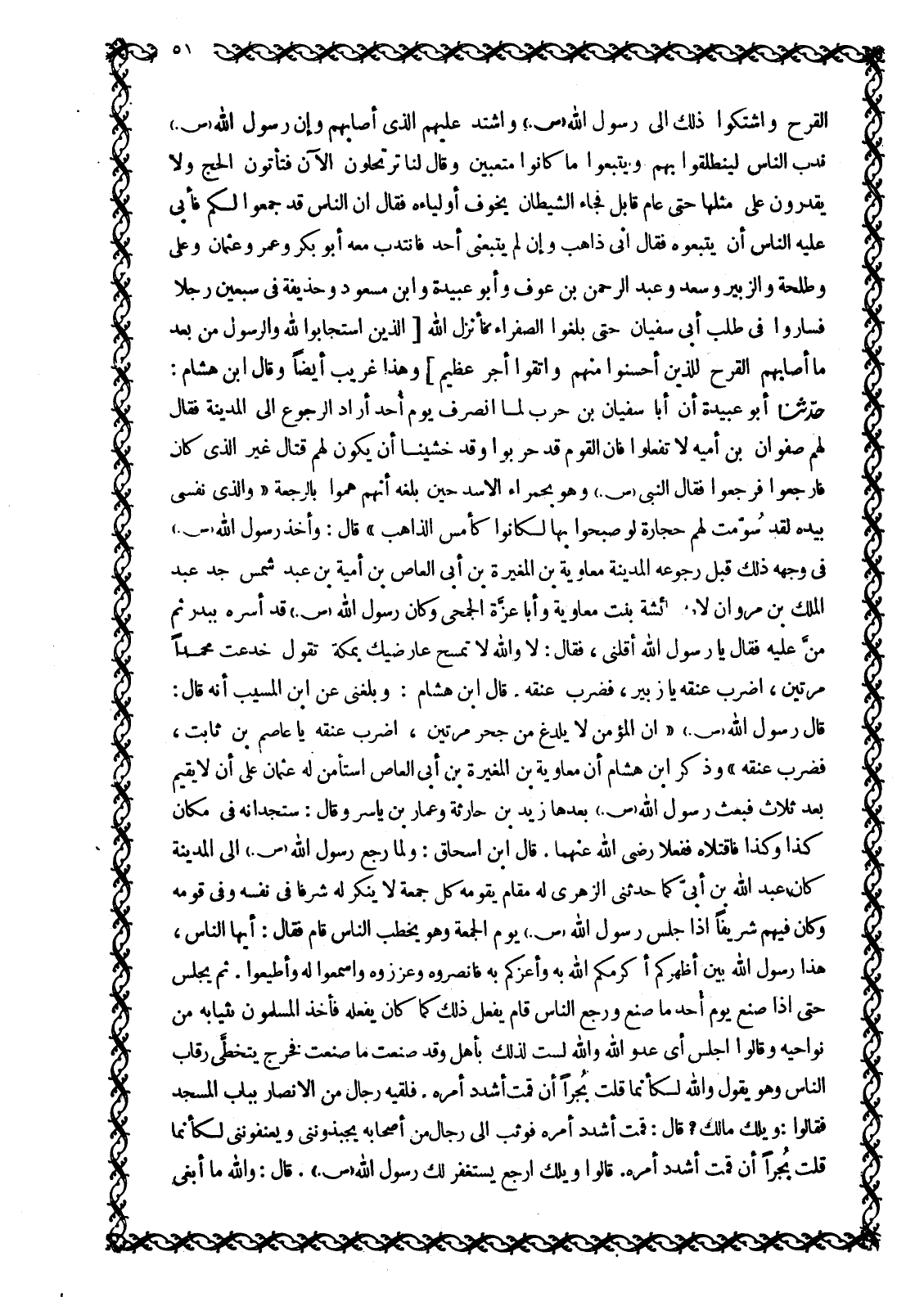 حَدَّثَنَا أَبُو عُبَيْدَةَ أَنَّ أَبَا سُفْيَانَ بْنَ حَرْبٍ لَمَّا انْصَرَفَ يَوْمَ أُحُدٍ أَرَادَ الرُّجُوعَ إِلَى الْمَدِينَةِ فَقَالَ لَهُمْ صَفْوَانُ بْنُ أُمَيَّةَ لَا تَفْعَلُوا فَإِنَّ الْقَوْمَ قَدْ حَرِبُوا وَقَدْ خَشِينَا أَنْ يَكُونَ لَهُمْ قِتَالٌ غَيْرَ الَّذِي كَانَ فَارْجِعُوا فَرَجَعُوا فَقَالَ النَّبِيُّ صَلَّى اللَّهُ عَلَيْهِ وَسَلَّمَ وَهُوَ بِحَمْرَاءِ الْأَسَدِ حِينَ بَلَغَهُ أَنَّهُمْ هَمُّوا بِالرَّجْعَةِ «وَالَّذِي نَفْسِي بِيَدِهِ لَقَدْ سُوِّمَتْ لَهُمْ حِجَارَةٌ لَوْ صُبِّحُوا بِهَا لَكَانُوا كَأَمْسِ الذَّاهِبِ» قَالَ: وَأَخَذَ رَسُولُ اللَّهِ صَلَّى اللَّهُ عَلَيْهِ وَسَلَّمَ فِي وَجْهِهِ ذَلِكَ قَبْلَ رُجُوعِهِ الْمَدِينَةِ مُعَاوِيَةَ بْنَ الْمُغِيرَةِ بْنِ أَبِي الْعَاصِ بْنِ أُمَيَّةَ بْنِ عَبْدِ شَمْسٍ جَدَّ عَبْدِ الْمَلِكِ بْنِ مَرْوَانَ لِأُمِّهِ عَائِشَةَ بِنْتِ مُعَاوِيَةَ وَأَبَا عَزَّةَ الْجُمَحِيَّ وَكَانَ رَسُولُ اللَّهِ صَلَّى اللَّهُ عَلَيْهِ وَسَلَّمَ قَدْ أَسَرَهُ بِبَدْرٍ ثُمَّ مَنَّ عَلَيْهِ فَقَالَ يَا رَسُولَ اللَّهِ أَقِلْنِي، فَقَالَ: لَا وَاللَّهِ لَا تَمْسَحُ عَارِضَيْكَ بِمَكَّةَ تَقُولُ خَدَعْتُ مُحَمَّدًا مَرَّتَيْنِ، اضْرِبْ عُنُقَهُ يَا زُبَيْرُ، فَضَرَبَ عُنُقَهُ. قَالَ ابْنُ هِشَامٍ: وَبَلَغَنِي عَنِ ابْنِ الْمُسَيَّبِ أَنَّهُ قَالَ: