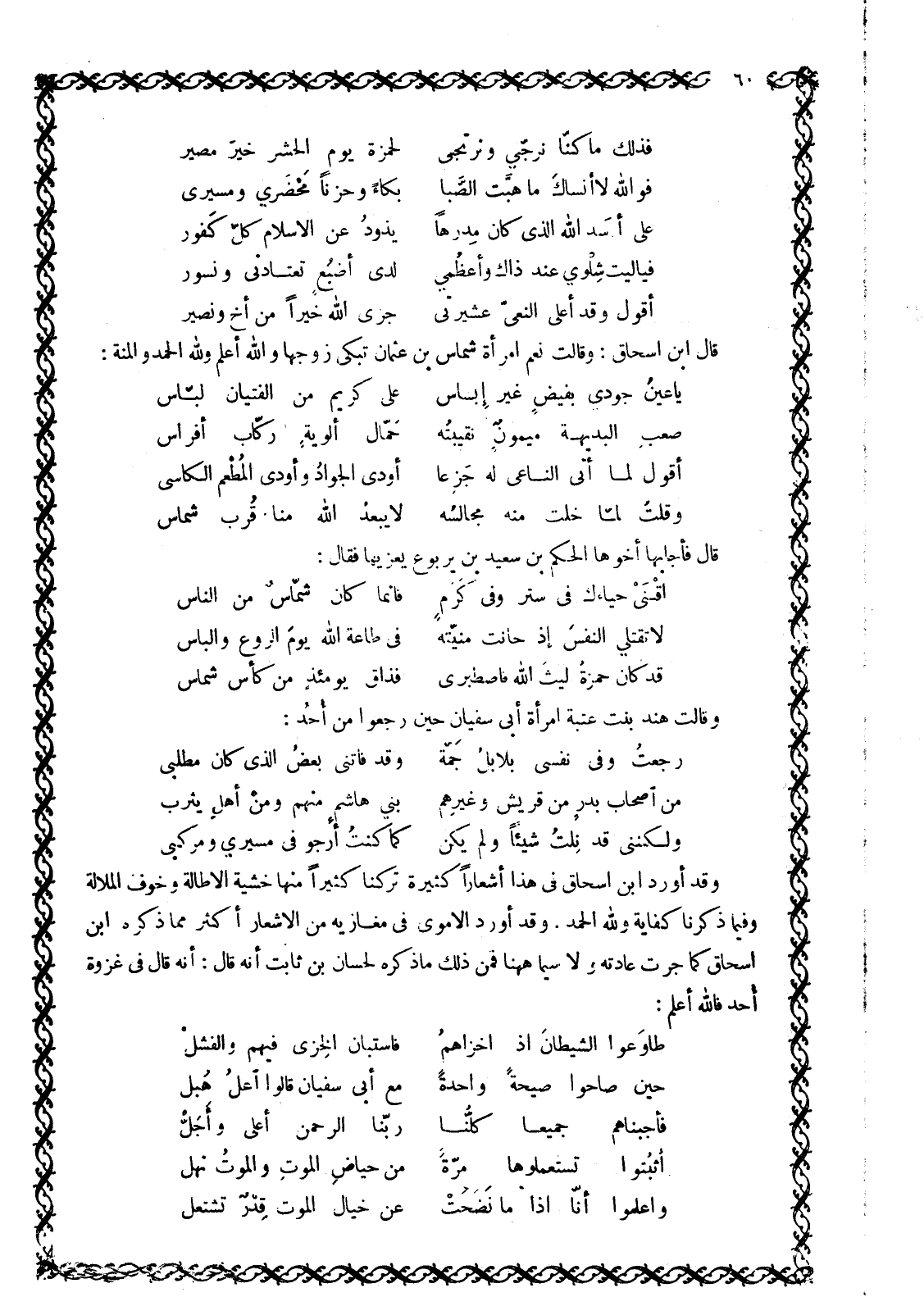 وَقَدْ أَوْرَدَ ابْنُ إِسْحَاقَ فِي هَذَا أَشْعَارًا كَثِيرَةً تَرَكْنَا كَثِيرًا مِنْهَا خَشْيَةَ الْإِطَالَةِ وَخَوْفَ الْمَلَالَةِ وَفِيمَا ذَكَرْنَا كِفَايَةٌ وللَّه الْحَمْدُ. وَقَدْ أَوْرَدَ الْأَمَوِيُّ فِي مَغَازِيهِ مِنَ الْأَشْعَارِ أَكْثَرَ مِمَّا ذَكَرَهُ ابْنُ إِسْحَاقَ كَمَا جَرَتْ عَادَتُهُ وَلَا سِيَّمَا هَاهُنَا فَمِنْ ذَلِكَ مَا ذَكَرَهُ لِحَسَّانَ بْنِ ثَابِتٍ أَنَّهُ قَالَ: أَنَّهُ قَالَ فِي غَزْوَةِ أُحُدٍ فاللَّه أَعْلَمُ:
