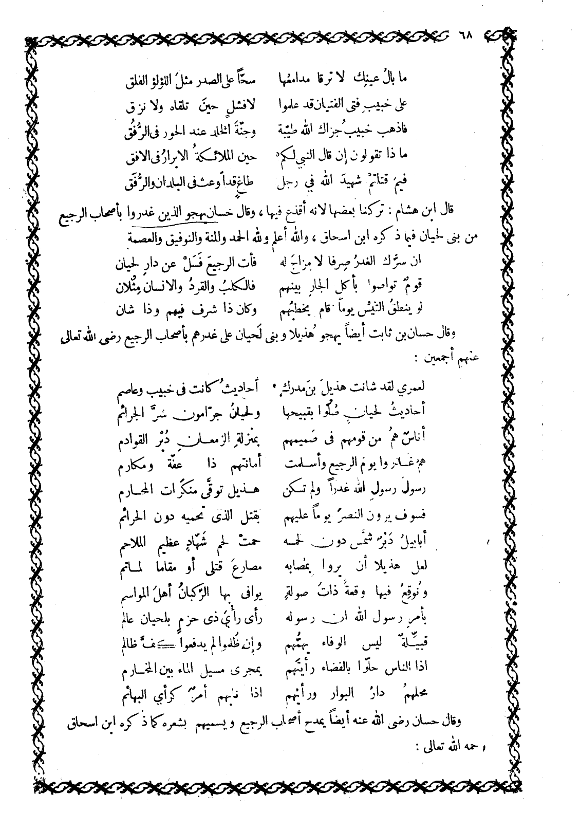 وَقَالَ حَسَّانُ رَضِيَ اللَّهُ عَنْهُ أَيْضًا يَمْدَحُ أَصْحَابَ الرَّجِيعِ ويسميهم بشعره كَمَا ذَكَرَهُ ابْنُ إِسْحَاقَ رَحِمَهُ اللَّهُ تَعَالَى: