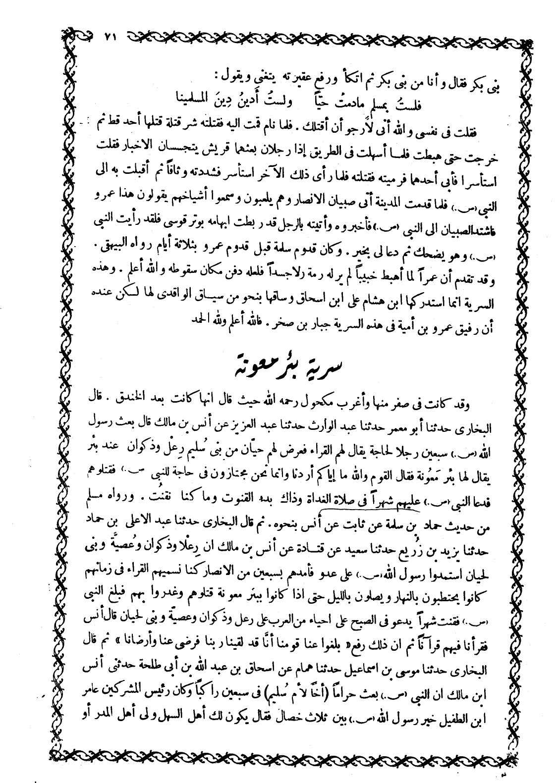وَقَدْ كَانَتْ فِي صَفَرٍ مِنْهَا وَأَغْرَبَ مَكْحُولٌ رَحِمَهُ اللَّهُ حَيْثُ قَالَ إِنَّهَا كَانَتْ بَعْدَ الْخَنْدَقِ. قَالَ الْبُخَارِيُّ حَدَّثَنَا أَبُو مَعْمَرٍ حَدَّثَنَا عَبْدُ الْوَارِثِ حَدَّثَنَا عَبْدُ الْعَزِيزِ عَنْ أَنَسِ بْنِ مَالِكٍ قَالَ بَعَثَ رَسُولُ اللَّهِ صَلَّى اللَّهُ عَلَيْهِ وَسَلَّمَ سَبْعِينَ رَجُلًا لِحَاجَةٍ يُقَالُ لَهُمُ الْقُرَّاءُ فَعَرَضَ لَهُمْ حَيَّانِ مِنْ بَنِي سُلَيْمٍ رِعْلٌ وَذَكْوَانَ عِنْدَ بِئْرٍ يُقَالُ لَهَا بِئْرُ مَعُونَةَ فَقَالَ الْقَوْمُ وَاللَّهِ مَا إِيَّاكُمْ أَرَدْنَا وَإِنَّمَا نَحْنُ مُجْتَازُونَ فِي حَاجَةٍ لِلنَّبِيِّ صَلَّى اللَّهُ عَلَيْهِ وَسَلَّمَ فَقَتَلُوهُمْ فَدَعَا النَّبِيُّ صَلَّى اللَّهُ عَلَيْهِ وَسَلَّمَ عَلَيْهِمْ شَهْرًا فِي صَلَاةِ الْغَدَاةِ وَذَاكَ بَدْءُ الْقُنُوتِ وَمَا كُنَّا نَقْنُتُ. وَرَوَاهُ مُسْلِمٌ مِنْ حَدِيثِ حَمَّادِ بْنِ سَلَمَةَ عَنْ ثَابِتٍ عَنْ أَنَسٍ بِنَحْوِهِ. ثُمَّ قَالَ الْبُخَارِيُّ حَدَّثَنَا عَبْدُ الْأَعْلَى بْنُ حَمَّادٍ حَدَّثَنَا يَزِيدُ بْنُ زُرَيْعٍ حَدَّثَنَا سَعِيدٌ عَنْ قَتَادَةَ عَنْ أَنَسِ بْنِ مَالِكٍ أَنَّ رِعْلًا وَذَكْوَانَ وَعُصَيَّةَ وَبَنِي لِحْيَانَ اسْتَمَدُّوا رَسُولَ اللَّهِ صَلَّى اللَّهُ عَلَيْهِ وَسَلَّمَ عَلَى عَدُوٍّ فَأَمَدَّهُمْ بِسَبْعِينَ مِنَ الْأَنْصَارِ كُنَّا نُسَمِّيهِمُ الْقُرَّاءَ فِي زَمَانِهِمْ كَانُوا يَحْتَطِبُونَ بِالنَّهَارِ وَيُصَلُّونَ بِاللَّيْلِ حَتَّى إِذَا كَانُوا بِبِئْرِ مَعُونَةَ قَتَلُوهُمْ وَغَدَرُوا بِهِمْ فَبَلَغَ النَّبِيَّ صَلَّى اللَّهُ عَلَيْهِ وَسَلَّمَ فَقَنَتَ شَهْرًا يَدْعُو فِي الصُّبْحِ عَلَى أَحْيَاءٍ مِنَ الْعَرَبِ عَلَى رِعْلٍ وَذَكْوَانَ وَعُصَيَّةَ وَبَنِي لِحْيَانَ قَالَ أَنَسٌ فَقَرَأْنَا فِيهِمْ قُرْآنًا ثُمَّ إِنَّ ذَلِكَ رُفِعَ «بَلِّغُوا عَنَّا قَوْمَنَا إِنَّا قَدْ لَقِينَا رَبَّنَا فَرَضِيَ عَنَّا وَأَرْضَانَا» ثُمَّ قَالَ الْبُخَارِيُّ حَدَّثَنَا مُوسَى بْنُ إِسْمَاعِيلَ حَدَّثَنَا هَمَّامٌ عَنْ إِسْحَاقَ بْنِ عَبْدِ اللَّهِ بْنِ أَبِي طلحة حدثني أنس ابن مَالِكٍ أَنَّ النَّبِيَّ صَلَّى اللَّهُ عَلَيْهِ وَسَلَّمَ بَعَثَ حراما (أَخًا لِأُمِّ سُلَيْمٍ) فِي سَبْعِينَ رَاكِبًا وَكَانَ رئيس المشركين عامر ابن الطُّفَيْلِ خَيَّرَ رَسُولُ اللَّهِ صَلَّى اللَّهُ عَلَيْهِ وَسَلَّمَ بَيْنَ ثَلَاثِ خِصَالٍ فَقَالَ يَكُونُ لَكَ أَهْلُ السَّهْلِ وَلِي أَهْلُ الْمَدَرِ أَوْ