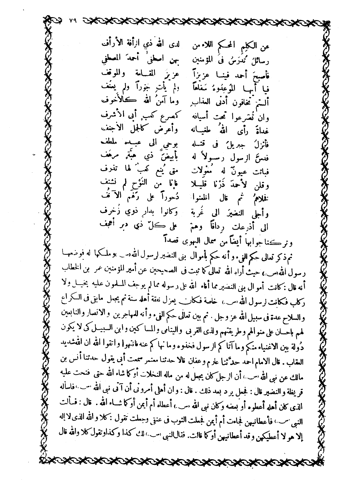 وتركنا جوابها أيضا من سمال اليهوى قَصْدًا ثُمَّ ذَكَرَ تَعَالَى حُكْمَ الْفَيْءِ وَأَنَّهُ حَكَمَ بِأَمْوَالِ بَنِي النَّضِيرِ لِرَسُولِ اللَّهِ صَلَّى اللَّهُ عَلَيْهِ وَسَلَّمَ وَمَلَّكَهَا لَهُ فَوَضَعَهَا رَسُولُ اللَّهِ صَلَّى اللَّهُ عَلَيْهِ وَسَلَّمَ حَيْثُ أَرَاهُ اللَّهُ تَعَالَى كَمَا ثَبَتَ فِي الصَّحِيحَيْنِ عَنْ أَمِيرِ الْمُؤْمِنِينَ عُمَرَ بْنِ الْخَطَّابِ أَنَّهُ قَالَ: كَانَتْ أَمْوَالُ بَنِي النَّضِيرِ مِمَّا أَفَاءَ اللَّهُ على رسوله مما لم يوجف المسلمون عليه بخيل ولا رِكَابٍ فَكَانَتْ لِرَسُولِ اللَّهِ صَلَّى اللَّهُ عَلَيْهِ وَسَلَّمَ خَاصَّةً فَكَانَ يَعْزِلُ نَفَقَةَ أَهْلِهِ سَنَةً ثُمَّ يَجْعَلُ مَا بَقِيَ فِي الْكُرَاعِ وَالسِّلَاحِ عُدَّةً فِي سَبِيلِ اللَّهِ عَزَّ وَجَلَّ. ثُمَّ بَيَّنَ تَعَالَى حُكْمَ الْفَيْءِ وَأَنَّهُ لِلْمُهَاجِرِينَ وَالْأَنْصَارِ وَالتَّابِعِينَ لَهُمْ بِإِحْسَانٍ عَلَى مِنْوَالِهِمْ وَطَرِيقَتِهِمْ ولِذِي الْقُرْبى وَالْيَتامى وَالْمَساكِينِ وَابْنِ السَّبِيلِ كَيْ لَا يَكُونَ دُولَةً بَيْنَ الْأَغْنِياءِ مِنْكُمْ وَما آتاكُمُ الرَّسُولُ فَخُذُوهُ وَما نَهاكُمْ عَنْهُ فَانْتَهُوا وَاتَّقُوا الله إِنَّ الله شَدِيدُ الْعِقابِ 59: 7. قَالَ الْإِمَامُ أَحْمَدُ حَدَّثَنَا عَارِمٌ وَعَفَّانُ قَالَا حَدَّثَنَا مُعْتَمِرٌ سَمِعْتُ أَبِي يَقُولُ حَدَّثَنَا أَنَسُ بْنُ مَالِكٍ عَنْ نَبِيِّ اللَّهِ صَلَّى اللَّهُ عَلَيْهِ وَسَلَّمَ أَنَّ الرَّجُلَ كَانَ يَجْعَلُ لَهُ مِنْ مَالِهِ النَّخْلَاتِ أَوْ كَمَا شَاءَ اللَّهُ حَتَّى فُتِحَتْ عَلَيْهِ قُرَيْظَةُ وَالنَّضِيرُ قَالَ: فَجَعَلَ يَرُدُّ بَعْدَ ذَلِكَ. قَالَ: وَإِنَّ أَهْلِي أَمَرُونِي أن آتى نبي الله صَلَّى اللَّهُ عَلَيْهِ وَسَلَّمَ فَأَسْأَلَهُ الَّذِي كَانَ أَهْلُهُ أَعْطُوهُ أَوْ بَعْضَهُ وَكَانَ نَبِيُّ اللَّهِ صَلَّى اللَّهُ عَلَيْهِ وَسَلَّمَ أَعْطَاهُ أُمَّ أَيْمَنَ أَوْ كَمَا شَاءَ اللَّهُ. قَالَ: فَسَأَلَتِ النَّبِيَّ صَلَّى اللَّهُ عَلَيْهِ وَسَلَّمَ فَأَعْطَانِيهِنَّ فَجَاءَتْ أُمُّ أَيْمَنَ فَجَعَلَتِ الثَّوْبَ فِي عُنُقِي وَجَعَلَتْ تَقُولُ: كَلَّا وَاللَّهِ الَّذِي لَا إِلَهَ إِلَّا هُوَ لا أعطيكهن وَقَدْ أَعْطَانِيهِنَّ أَوْ كَمَا قَالَتْ. فَقَالَ النَّبِيُّ صَلَّى اللَّهُ عَلَيْهِ وَسَلَّمَ لَكِ كَذَا وَكَذَا وَتَقُولُ كَلَّا وَاللَّهِ قَالَ