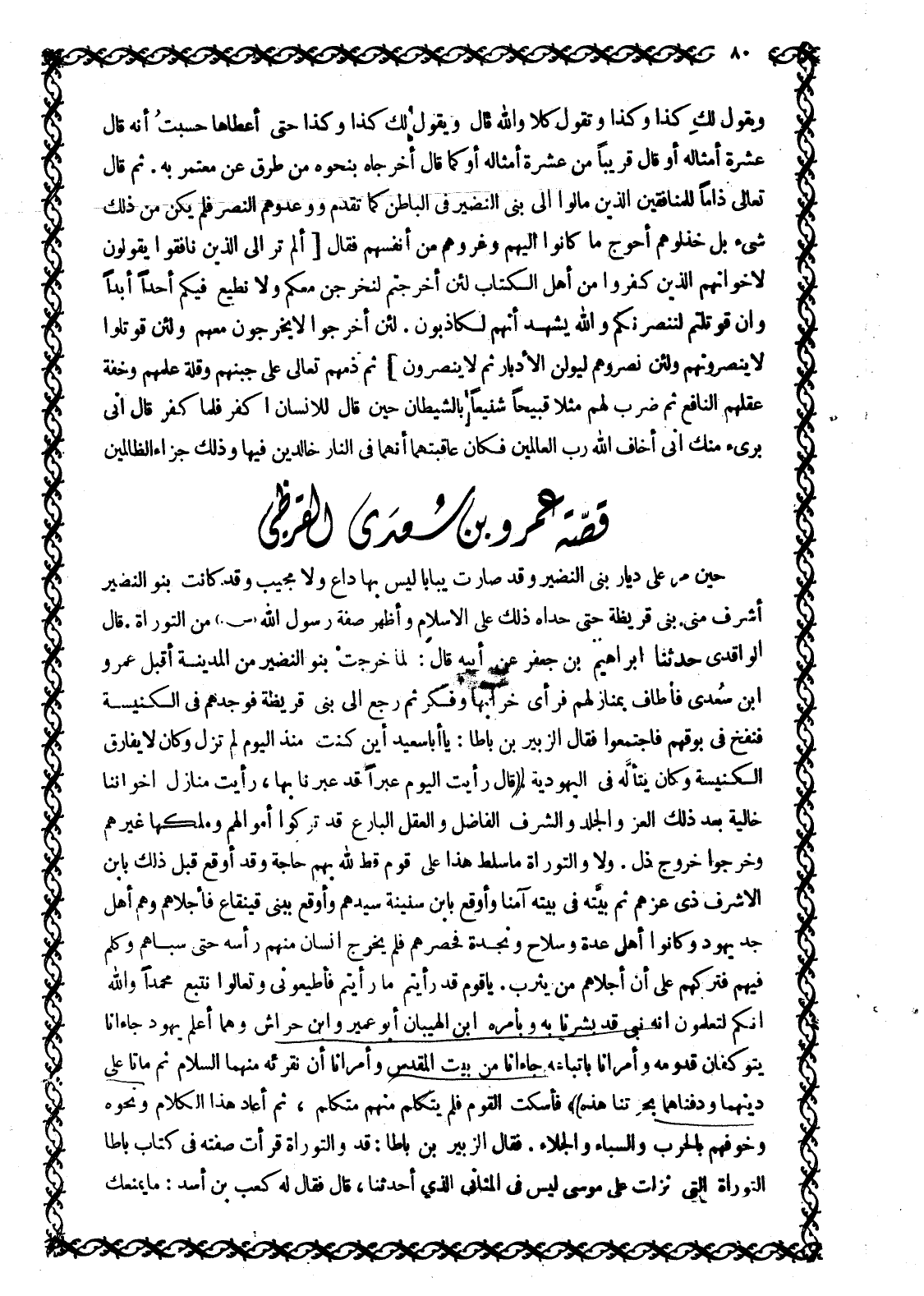 حِينَ مَرَّ عَلَى دِيَارِ بَنِي النَّضِيرِ وَقَدْ صَارَتْ يَبَابًا لَيْسَ بِهَا دَاعٍ وَلَا مُجِيبٍ وَقَدْ كَانَتْ بنو النضير أشرف منى بَنِي قُرَيْظَةَ حَتَّى حَدَاهُ ذَلِكَ عَلَى الْإِسْلَامِ وَأَظْهَرَ صِفَةَ رَسُولِ اللَّهِ صَلَّى اللَّهُ عَلَيْهِ وَسَلَّمَ مِنَ التَّوْرَاةِ. قَالَ الْوَاقِدِيُّ حَدَّثَنَا إِبْرَاهِيمُ بْنُ جَعْفَرٍ عَنْ أَبِيهِ قَالَ: لَمَّا خَرَجَتْ بنو النضير من المدينة أقبل عمرو ابن سُعْدَى فَأَطَافَ بِمَنَازِلِهِمْ فَرَأَى خَرَابَهَا وَفَكَّرَ ثُمَّ رَجَعَ إِلَى بَنِي قُرَيْظَةَ فَوَجَدَهُمْ فِي الْكَنِيسَةِ فَنَفَخَ فِي بُوقِهِمْ فَاجْتَمَعُوا فَقَالَ الزُّبَيْرُ بْنُ بَاطَا: يَا أَبَا سَعِيدٍ أَيْنَ كُنْتَ مُنْذُ اليوم لم تزل وَكَانَ لَا يُفَارِقُ الْكَنِيسَةَ وَكَانَ يَتَأَلَّهُ فِي الْيَهُودِيَّةِ. قَالَ رَأَيْتُ الْيَوْمَ عِبَرًا قَدْ عُبِّرْنَا بِهَا، رَأَيْتُ مَنَازِلَ إِخْوَانِنَا خَالِيَةً بَعْدَ ذَلِكَ الْعِزِّ وَالْجَلَدِ وَالشَّرَفِ الْفَاضِلِ وَالْعَقْلِ الْبَارِعِ قَدْ تَرَكُوا أَمْوَالَهُمْ وَمَلَكَهَا غَيْرُهُمْ وَخَرَجُوا خُرُوجَ ذُلٍّ. وَلَا وَالتَّوْرَاةِ مَا سُلِّطَ هَذَا عَلَى قَوْمٍ قَطُّ للَّه بِهِمْ حَاجَةٌ وَقَدْ أَوْقَعَ قَبْلَ ذَلِكَ بِابْنِ الْأَشْرَفِ ذِي عِزِّهِمْ ثُمَّ بَيَّتَهُ فِي بَيْتِهِ آمِنًا وَأَوْقَعَ بِابْنِ سُنَيْنَةَ سَيِّدِهِمْ وَأَوْقَعَ بِبَنِي قَيْنُقَاعَ فَأَجْلَاهُمْ وَهُمْ أَهْلُ جَدِّ يَهُودَ وَكَانُوا أَهْلَ عُدَّةٍ وَسِلَاحٍ وَنَجْدَةٍ فَحَصَرَهُمْ فَلَمْ يُخْرِجْ إِنْسَانٌ مِنْهُمْ رَأْسَهُ حَتَّى سَبَاهُمْ وَكُلِّمَ فِيهِمْ فَتَرَكَهُمْ عَلَى أَنْ أَجْلَاهُمْ مِنْ يَثْرِبَ. يَا قَوْمِ قَدْ رَأَيْتُمْ مَا رَأَيْتُمْ فأطيعوني وتعالوا نتبع محمدا والله إِنَّكُمْ لَتَعْلَمُونَ أَنَّهُ نَبِيٌّ قَدْ بَشَّرَنَا بِهِ وَبِأَمْرِهِ ابْنُ الْهَيْبَانِ أَبُو عُمَيْرٍ وَابْنُ حِرَاشٍ وَهُمَا أَعْلَمُ يَهُودَ جَاءَانَا يَتَوَكَّفَانِ قُدُومَهُ وَأَمَرَانَا بِاتِّبَاعِهِ جَاءَانَا مِنْ بَيْتِ الْمَقْدِسِ وَأَمَرَانَا أَنْ نُقْرِئَهُ مِنْهُمَا السَّلَامَ ثُمَّ مَاتَا عَلَى دِينِهِمَا وَدَفَنَّاهُمَا بِحَرَّتِنَا هَذِهِ، فَأَسْكَتَ الْقَوْمُ فَلَمْ يَتَكَلَّمْ مِنْهُمْ مُتَكَلِّمٌ، ثُمَّ أَعَادَ هَذَا الْكَلَامَ وَنَحْوَهُ وَخَوَّفَهُمْ بِالْحَرْبِ وَالسِّبَاءِ وَالْجَلَاءِ. فَقَالَ الزُّبَيْرُ بْنُ بَاطَا: قَدْ وَالتَّوْرَاةِ قَرَأْتُ صِفَتَهُ فِي كِتَابِ بَاطَا التَّوْرَاةِ الَّتِي نَزَلَتْ عَلَى مُوسَى لَيْسَ فِي الْمَثَانِي الَّذِي أَحْدَثْنَا، قَالَ فَقَالَ لَهُ كَعْبُ بْنُ أَسَدٍ: مَا يَمْنَعُكَ