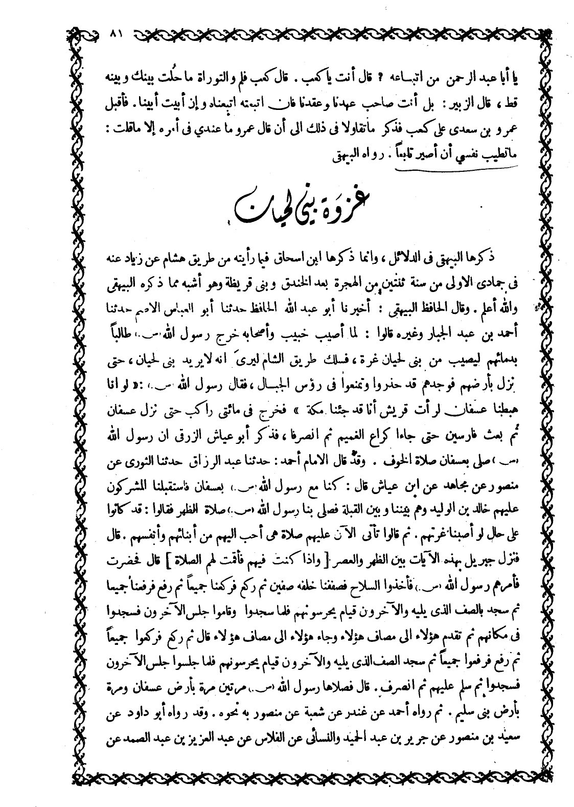 الَّتِي صَلَّى فِيهَا صَلَاةَ الخوف بعسفان ذَكَرَهَا الْبَيْهَقِيُّ فِي الدَّلَائِلِ، وَإِنَّمَا ذَكَرَهَا ابْنُ إسحاق فيما رأيته من طريق هِشَامٍ عَنْ زِيَادٍ عَنْهُ فِي جُمَادَى الْأُولَى من سنة ثنتين مِنَ الْهِجْرَةِ بَعْدَ الْخَنْدَقِ وَبَنِي قُرَيْظَةَ وَهُوَ أَشْبَهُ مِمَّا ذَكَرَهُ الْبَيْهَقِيُّ وَاللَّهُ أَعْلَمُ. وَقَالَ الْحَافِظُ الْبَيْهَقِيُّ: أَخْبَرَنَا أَبُو عَبْدِ اللَّهِ الْحَافِظُ حَدَّثَنَا أَبُو الْعَبَّاسِ الْأَصَمُّ حَدَّثَنَا أَحْمَدُ بْنُ عَبْدِ الجبار وَغَيْرُهُ قَالُوا: لَمَّا أُصِيبَ خُبَيْبٌ وَأَصْحَابُهُ خَرَجَ رَسُولُ اللَّهِ صَلَّى اللَّهُ عَلَيْهِ وَسَلَّمَ طَالِبًا بِدِمَائِهِمْ لِيُصِيبَ مِنْ بَنِي لِحْيَانَ غِرَّةً، فَسَلَكَ طَرِيقَ الشَّامِ لِيُرَيَ أَنَّهُ لَا يُرِيدُ بَنِي لِحْيَانَ، حَتَّى نَزَلَ بِأَرْضِهِمْ فَوَجَدَهُمْ قَدْ حَذِرُوا وَتَمَنَّعُوا فِي رُءُوسِ الْجِبَالِ، فَقَالَ رَسُولُ اللَّهِ صَلَّى اللَّهُ عَلَيْهِ وَسَلَّمَ: «لَوْ أَنَّا هَبَطْنَا عُسْفَانَ لَرَأَتْ قُرَيْشٍ أَنَّا قَدْ جِئْنَا مَكَّةَ» فَخَرَجَ فِي مِائَتَيْ رَاكِبٍ حَتَّى نَزَلَ عُسْفَانَ ثُمَّ بَعَثَ فَارِسَيْنِ حَتَّى جَاءَا كُرَاعَ الْغَمِيمِ ثُمَّ انْصَرَفَا، فَذَكَرَ أَبُو عَيَّاشٍ الزُّرَّقِيُّ أَنَّ رَسُولَ اللَّهِ صَلَّى اللَّهُ عَلَيْهِ وَسَلَّمَ صَلَّى بِعُسْفَانَ صَلَاةَ الْخَوْفِ. وَقَدْ قَالَ الْإِمَامُ أَحْمَدُ: حَدَّثَنَا عَبْدُ الرَّزَّاقِ حَدَّثَنَا الثَّوْرِيُّ عَنْ مَنْصُورٍ عن مجاهد عن ابن عَيَّاشٍ قَالَ: كُنَّا مَعَ رَسُولِ اللَّهِ صَلَّى اللَّهُ عَلَيْهِ وَسَلَّمَ بِعُسْفَانَ فَاسْتَقْبَلَنَا الْمُشْرِكُونَ عَلَيْهِمْ خَالِدُ بْنُ الْوَلِيدِ وَهُمْ بَيْنَنَا وَبَيْنَ الْقِبْلَةِ فَصَلَّى بِنَا رَسُولُ اللَّهِ صَلَّى اللَّهُ عَلَيْهِ وَسَلَّمَ صَلَاةَ الظهر فقالوا: قد كانوا على حالي لو أصبنا غرتهم. ثم قالوا تأتى الآن عليهم صَلَاةٌ هِيَ أَحَبُّ إِلَيْهِمْ مِنْ أَبْنَائِهِمْ وَأَنْفُسِهِمْ. قَالَ فَنَزَلَ جِبْرِيلُ بِهَذِهِ الْآيَاتِ بَيْنَ الظَّهْرِ وَالْعَصْرِ وَإِذا كُنْتَ فِيهِمْ فَأَقَمْتَ لَهُمُ الصَّلاةَ 4: 102 قَالَ فَحَضَرَتْ فَأَمَرَهُمْ رَسُولُ اللَّهِ صَلَّى اللَّهُ عَلَيْهِ وَسَلَّمَ فَأَخَذُوا السِّلَاحَ فَصَفَفْنَا خَلْفَهُ صَفَّيْنِ ثُمَّ رَكَعَ فَرَكَعْنَا جَمِيعًا ثُمَّ رَفَعَ فَرَفَعْنَا جَمِيعًا ثُمَّ سَجَدَ بِالصَّفِّ الَّذِي يَلِيهِ وَالْآخَرُونَ قِيَامٌ يَحْرُسُونَهُمْ فَلَمَّا سَجَدُوا وَقَامُوا جَلَسَ الْآخَرُونَ فَسَجَدُوا فِي مَكَانِهِمْ ثُمَّ تَقَدَّمَ هَؤُلَاءِ إِلَى مَصَافِّ هَؤُلَاءِ وَجَاءَ هَؤُلَاءِ إِلَى مَصَافِّ هَؤُلَاءِ قَالَ ثُمَّ رَكَعَ فَرَكَعُوا جَمِيعًا ثُمَّ رَفَعَ فرفعوا جميعا ثم سجد الصف الَّذِي يَلِيهِ وَالْآخَرُونَ قِيَامٌ يَحْرُسُونَهُمْ فَلَمَّا جَلَسُوا جَلَسَ الْآخَرُونَ فَسَجَدُوا ثُمَّ سَلَّمَ عَلَيْهِمْ ثُمَّ انْصَرَفَ. قَالَ فَصَلَّاهَا رَسُولُ اللَّهِ صَلَّى اللَّهُ عَلَيْهِ وَسَلَّمَ مَرَّتَيْنِ مرة بأرض عسفان وَمَرَّةً بِأَرْضِ بَنِي سُلَيْمٍ. ثُمَّ رَوَاهُ أَحْمَدُ عَنْ غُنْدَرٍ عَنْ شُعْبَةَ عَنْ مَنْصُورٍ بِهِ نَحْوَهُ. وَقَدْ رَوَاهُ أَبُو دَاوُدَ عَنْ سَعِيدِ بْنِ مَنْصُورٍ عَنْ جَرِيرِ بْنِ عَبْدِ الْحَمِيدِ وَالنَّسَائِيُّ عَنِ الْفَلَّاسِ عَنْ عَبْدِ الْعَزِيزِ بْنِ عَبْدِ الصَّمَدِ عَنْ