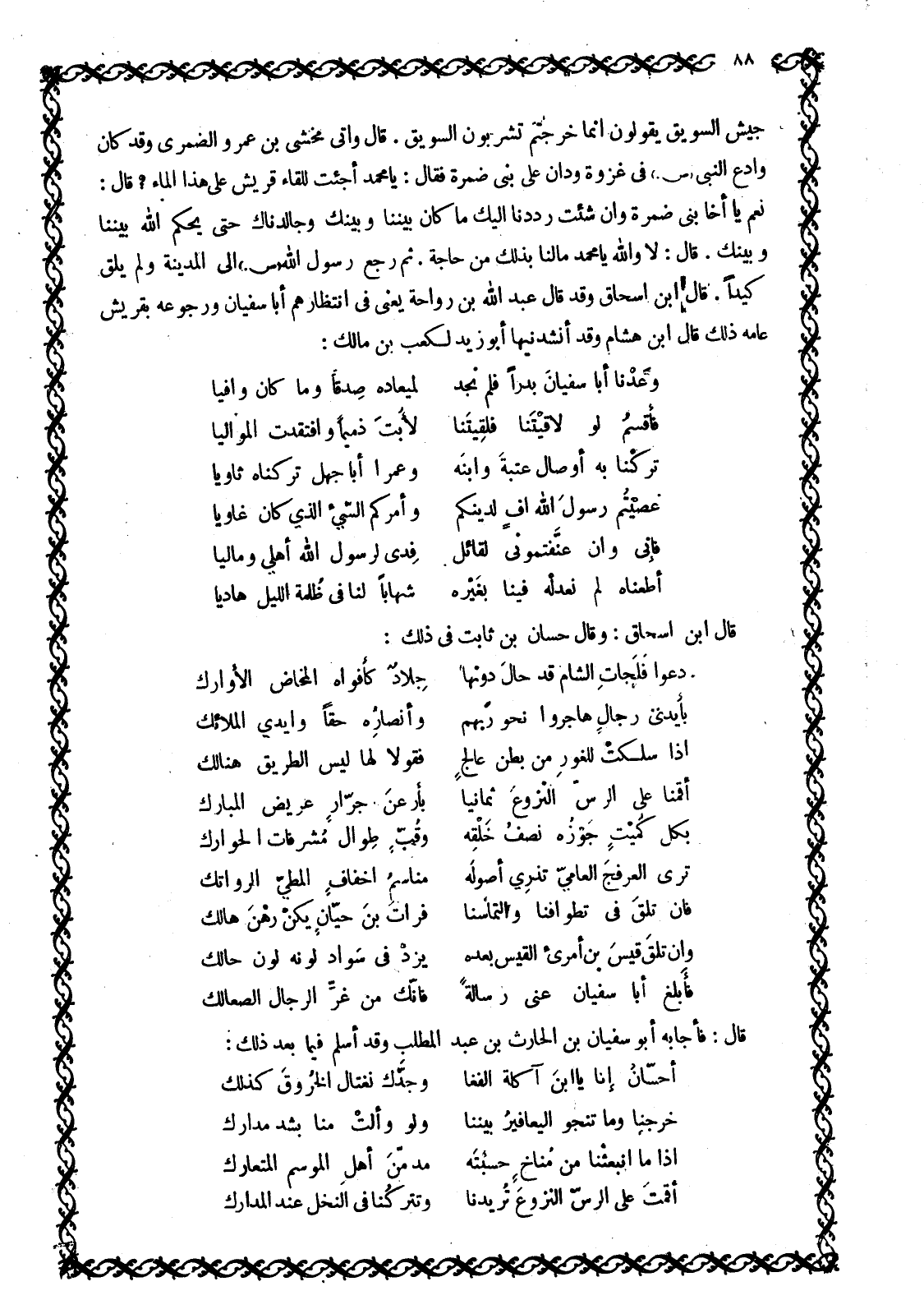 نَعَمْ يَا أَخَا بَنِي ضَمْرَةَ وَإِنْ شِئْتَ رَدَدْنَا إِلَيْكَ مَا كَانَ بَيْنَنَا وَبَيْنَكَ وَجَالَدْنَاكَ حَتَّى يَحْكُمَ اللَّهُ بَيْنَنَا وَبَيْنَكَ. قَالَ: لَا وَاللَّهِ يَا مُحَمَّدُ مَا لَنَا بِذَلِكَ مِنْ حَاجَةٍ. ثُمَّ رَجَعَ رَسُولُ اللَّهِ صَلَّى اللَّهُ عَلَيْهِ وَسَلَّمَ إِلَى الْمَدِينَةِ وَلَمْ يَلْقَ كَيْدًا. قَالَ ابْنُ إِسْحَاقَ وَقَدْ قَالَ عَبْدُ اللَّهِ بْنُ رَوَاحَةَ يَعْنِي فِي انْتِظَارِهِمْ أَبَا سُفْيَانَ وَرُجُوعِهِ بِقُرَيْشٍ عَامَهُ ذَلِكَ قَالَ ابْنُ هِشَامٍ وَقَدْ أَنْشَدَنِيهَا أَبُو زَيْدٍ لِكَعْبِ بْنِ مَالِكٍ: