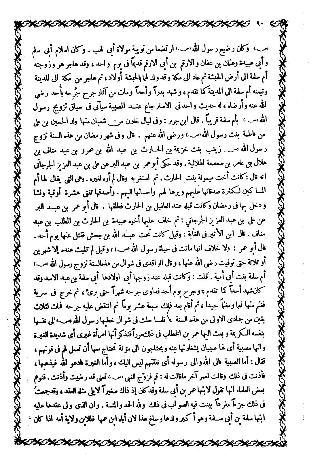 صَلَّى اللَّهُ عَلَيْهِ وَسَلَّمَ وَكَانَ رَضِيعَ رَسُولِ اللَّهِ صَلَّى اللَّهُ عَلَيْهِ وَسَلَّمَ ارْتَضَعَا مِنْ ثُوَيْبَةَ مَوْلَاةِ أَبِي لَهَبٍ. وَكَانَ إِسْلَامُ أَبِي سلّم وَأَبِي عُبَيْدَةَ وَعُثْمَانَ بْنِ عَفَّانَ وَالْأَرْقَمِ بْنِ أَبِي الْأَرْقَمِ قَدِيمًا فِي يَوْمٍ وَاحِدٍ، وَقَدْ هَاجَرَ هُوَ وَزَوْجَتُهُ أُمُّ سَلَمَةَ إِلَى أَرْضِ الْحَبَشَةِ ثُمَّ عَادَ إِلَى مَكَّةَ وَقَدْ وُلِدَ لَهُمَا بِالْحَبَشَةِ أَوْلَادٌ، ثُمَّ هَاجَرَ مِنْ مَكَّةَ إِلَى الْمَدِينَةِ وَتَبِعَتْهُ أُمُّ سَلَمَةَ إِلَى الْمَدِينَةِ كَمَا تَقَدَّمَ، وَشَهِدَ بَدْرًا وَأُحُدًا وَمَاتَ مِنْ آثَارِ جُرْحٍ جُرِحَهُ بِأُحُدٍ رَضِيَ اللَّهُ عَنْهُ وَأَرْضَاهُ، لَهُ حَدِيثٌ وَاحِدٌ فِي الِاسْتِرْجَاعِ عِنْدَ الْمُصِيبَةِ سَيَأْتِي فِي سِيَاقِ تَزْوِيجِ رَسُولِ اللَّهِ صَلَّى اللَّهُ عَلَيْهِ وَسَلَّمَ بِأُمِّ سَلَمَةَ قَرِيبًا. قَالَ ابْنُ جَرِيرٍ: وَفِي لَيَالٍ خَلَوْنَ مِنْ شَعْبَانَ مِنْهَا وُلِدَ الْحُسَيْنُ بْنُ عَلِيٍّ مِنْ فَاطِمَةُ بِنْتُ رَسُولِ اللَّهِ صَلَّى اللَّهُ عَلَيْهِ وَسَلَّمَ وَرَضِيَ اللَّهُ عَنْهُمْ. قَالَ وَفِي شَهْرِ رَمَضَانَ مِنْ هَذِهِ السَّنَةِ تَزَوَّجَ رَسُولُ اللَّهِ صَلَّى اللَّهُ عَلَيْهِ وَسَلَّمَ زَيْنَبَ بِنْتَ خُزَيْمَةَ بْنِ الْحَارِثِ بْنِ عَبْدِ اللَّهِ بْنِ عَمْرِو بْنِ عَبْدِ مَنَافِ بْنِ هِلَالِ بْنِ عَامِرِ بْنِ صَعْصَعَةَ الْهِلَالِيَّةَ. وَقَدْ حَكَى أَبُو عُمَرَ بْنُ عَبْدِ الْبَرِّ عَنْ عَلِيِّ بْنِ عَبْدِ الْعَزِيزِ الْجُرْجَانِيِّ أَنَّهُ قَالَ: كَانَتْ أُخْتَ مَيْمُونَةَ بِنْتِ الْحَارِثِ. ثُمَّ اسْتَغْرَبَهُ وَقَالَ لَمْ أَرَهُ لِغَيْرِهِ. وَهِيَ الَّتِي يُقَالُ لَهَا أُمُّ الْمَسَاكِينِ لِكَثْرَةِ صَدَقَاتِهَا عَلَيْهِمْ وَبِرِّهَا لَهُمْ وَإِحْسَانِهَا إِلَيْهِمْ. وَأَصْدَقَهَا ثِنْتَيْ عَشْرَةَ أُوقِيَّةً وَنَشًّا وَدَخَلَ بِهَا فِي رَمَضَانَ وَكَانَتْ قَبْلَهُ عِنْدَ الطُّفَيْلِ بْنِ الْحَارِثِ فَطَلَّقَهَا. قَالَ أَبُو عُمَرَ بْنُ عَبْدِ الْبَرِّ عَنْ عَلِيِّ بْنِ عَبْدِ الْعَزِيزِ الْجُرْجَانِيِّ: ثُمَّ خَلَّفَ عَلَيْهَا أَخُوهُ عُبَيْدَةَ بْنَ الْحَارِثِ بْنِ الْمُطَّلِبِ بْنِ عَبْدِ مَنَافٍ. قَالَ ابْنُ الْأَثِيرِ فِي الْغَابَةِ: وَقِيلَ كَانَتْ تَحْتَ عَبْدِ اللَّهِ بْنِ جَحْشٍ فَقُتِلَ عَنْهَا يَوْمَ أُحُدٍ.