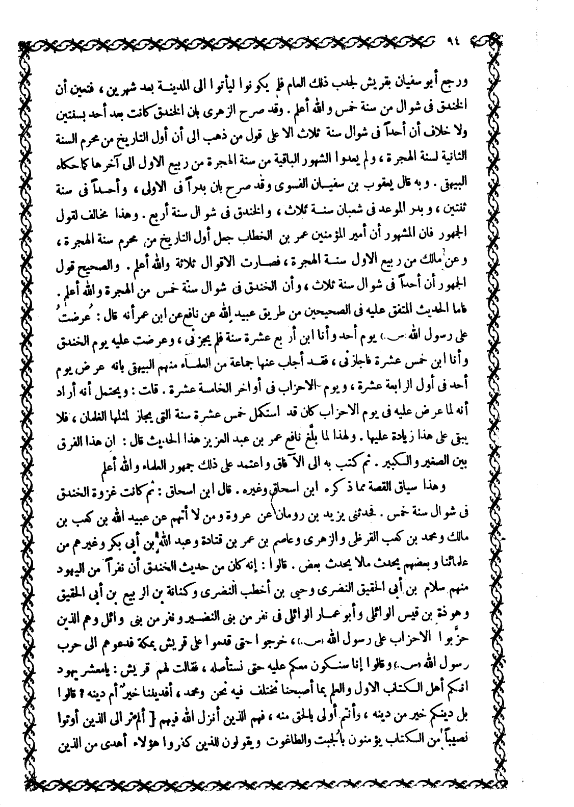 فَأَمَّا الْحَدِيثُ الْمُتَّفَقُ عَلَيْهِ فِي الصَّحِيحَيْنِ مِنْ طَرِيقِ عُبَيْدِ اللَّهِ عَنْ نَافِعٍ عَنِ ابْنِ عُمَرَ أَنَّهُ قَالَ: عُرِضْتُ عَلَى رَسُولِ اللَّهِ صَلَّى اللَّهُ عَلَيْهِ وَسَلَّمَ يَوْمَ أُحُدٍ وَأَنَا ابْنُ أَرْبَعَ عَشْرَةَ سَنَةً فَلَمْ يُجِزْنِي، وَعُرِضْتُ عَلَيْهِ يَوْمَ الْخَنْدَقِ وَأَنَا ابْنُ خَمْسَ عَشْرَةَ فَأَجَازَنِي، فَقَدْ أَجَابَ عَنْهَا جَمَاعَةٌ مِنَ الْعُلَمَاءِ مِنْهُمُ الْبَيْهَقِيُّ بِأَنَّهُ عُرِضَ يَوْمَ أُحُدٍ فِي أَوَّلِ الرَّابِعَةَ عَشْرَةَ، وَيَوْمَ الْأَحْزَابِ فِي أَوَاخِرِ الْخَامِسَةَ عَشْرَةَ. قُلْتُ: وَيَحْتَمِلُ أَنَّهُ أَرَادَ أَنَّهُ لَمَّا عُرِضَ عَلَيْهِ في يَوْمَ الْأَحْزَابِ كَانَ قَدِ اسْتَكْمَلَ خَمْسَ عَشْرَةَ سَنَةَ الَّتِي يُجَازُ لِمِثْلِهَا الْغِلْمَانُ، فَلَا يَبْقَى عَلَى هَذَا زِيَادَةٌ عَلَيْهَا. وَلِهَذَا لَمَّا بَلَّغَ نَافِعٌ عُمَرَ بْنَ عَبْدِ الْعَزِيزِ هَذَا الْحَدِيثَ قال: ان هذا الفرق بَيْنَ الصَّغِيرِ وَالْكَبِيرِ. ثُمَّ كَتَبَ بِهِ إِلَى الْآفَاقِ وَاعْتَمَدَ عَلَى ذَلِكَ جُمْهُورُ الْعُلَمَاءِ وَاللَّهُ أَعْلَمُ وَهَذَا سِيَاقُ الْقِصَّةِ مِمَّا ذَكَرَهُ ابْنُ إِسْحَاقَ وَغَيْرُهُ. قَالَ ابْنُ إِسْحَاقَ: ثُمَّ كَانَتْ غَزْوَةُ الْخَنْدَقِ فِي شَوَّالٍ سَنَةَ خَمْسٍ. فَحَدَّثَنِي يَزِيدُ بْنُ رُومَانَ عَنْ عُرْوَةَ وَمَنْ لَا أتهم عن عبيد اللَّهِ بْنِ كَعْبِ بْنِ مَالِكٍ وَمُحَمَّدُ بْنُ كَعْبٍ الْقُرَظِيُّ وَالزُّهْرِيُّ وَعَاصِمُ بْنُ عُمَرَ بْنِ قَتَادَةَ وَعَبْدُ اللَّهِ بْنُ أَبِي بَكْرٍ وَغَيْرُهُمْ مِنْ عُلَمَائِنَا وَبَعْضُهُمْ يُحَدِّثُ مَا لَا يُحَدِّثُ بَعْضٌ. قَالُوا: إِنَّهُ كَانَ مِنْ حَدِيثِ الْخَنْدَقِ أن نفرا من اليهود منهم إسلام بْنُ أَبِي الْحَقِيقِ النَّضَرِيُّ وَحُيَيُّ بْنُ أَخْطَبَ النَّضَرِيُّ وَكِنَانَةُ بْنُ الرَّبِيعِ بْنِ أَبِي الْحَقِيقِ وَهَوْذَةُ بْنُ قَيْسٍ الْوَائِلِيُّ وَأَبُو عَمَّارٍ الْوَائِلِيُّ فِي نَفَرٍ مِنَ بَنِي النَّضِيرِ وَنَفَرٍ مِنْ بَنِي وَائِلٍ وَهُمُ الَّذِينَ حَزَّبُوا الْأَحْزَابَ عَلَى رَسُولِ اللَّهِ صَلَّى اللَّهُ عَلَيْهِ وَسَلَّمَ، خَرَجُوا حتى قدموا على قريش بمكة فَدَعَوْهُمْ إِلَى حَرْبِ رَسُولِ اللَّهِ صَلَّى اللَّهُ عَلَيْهِ وَسَلَّمَ وَقَالُوا إِنَّا سَنَكُونُ مَعَكُمْ عَلَيْهِ حَتَّى نَسْتَأْصِلَهُ، فَقَالَتْ لَهُمْ قُرَيْشٌ: يَا مَعْشَرَ يَهُودَ إِنَّكُمْ أَهْلُ الْكِتَابِ الْأَوَّلِ وَالْعِلْمِ بِمَا أَصْبَحْنَا نَخْتَلِفُ فِيهِ نَحْنُ وَمُحَمَّدٌ، أَفَدِينُنَا خَيْرٌ أَمْ دِينُهُ؟ قَالُوا بَلْ دِينُكُمْ خَيْرٌ مِنْ دِينِهِ، وَأَنْتُمْ أَوْلَى بِالْحَقِّ مِنْهُ، فَهُمُ الَّذِينَ أَنْزَلَ اللَّهُ فِيهِمْ أَلَمْ تَرَ إِلَى الَّذِينَ أُوتُوا نَصِيباً مِنَ الْكِتابِ يُؤْمِنُونَ بِالْجِبْتِ وَالطَّاغُوتِ وَيَقُولُونَ لِلَّذِينَ كَفَرُوا هؤُلاءِ أَهْدى مِنَ الَّذِينَ