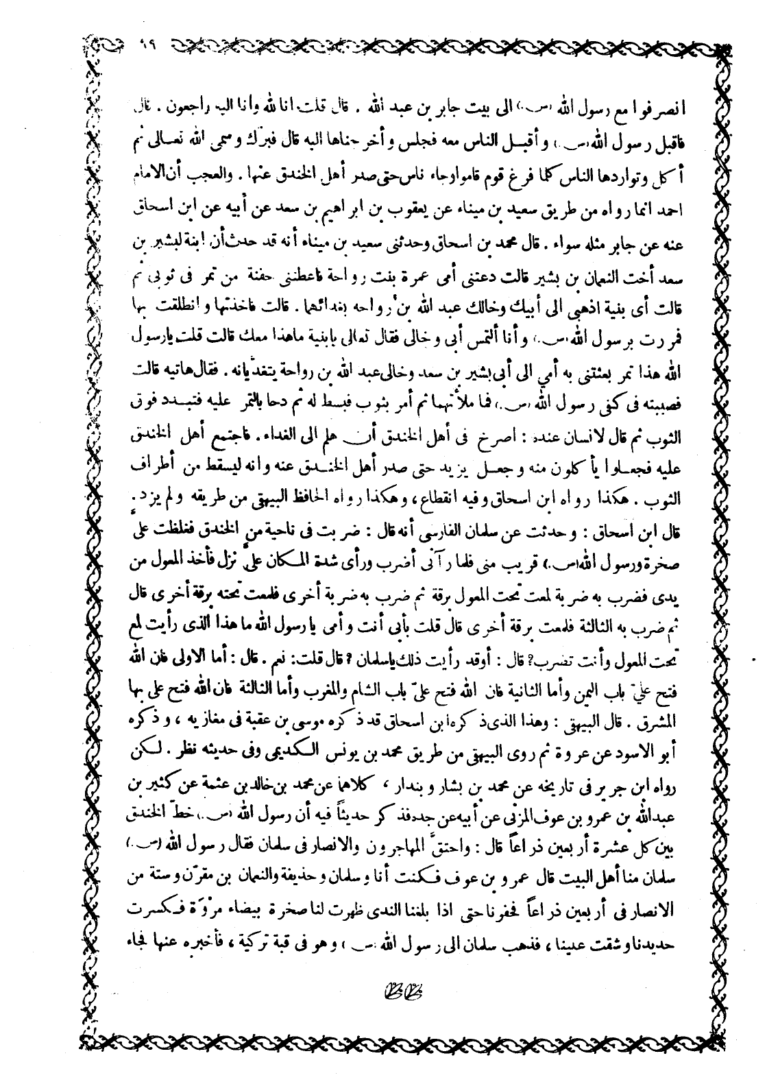 انْصَرَفُوا مَعَ رَسُولِ اللَّهِ صَلَّى اللَّهُ عَلَيْهِ وَسَلَّمَ إِلَى بَيْتِ جَابِرِ بْنِ عَبْدِ اللَّهِ. قَالَ قُلْتُ إِنَّا لِلَّهِ وَإِنَّا إِلَيْهِ راجِعُونَ 2: 156. قَالَ فَأَقْبَلَ رَسُولُ اللَّهِ صَلَّى اللَّهُ عَلَيْهِ وَسَلَّمَ وَأَقْبَلَ النَّاسُ مَعَهُ فَجَلَسَ وَأَخْرَجْنَاهَا إِلَيْهِ قَالَ فَبَرَّكَ وَسَمَّى اللَّهَ تَعَالَى ثُمَّ أَكَلَ وَتَوَارَدَهَا النَّاسُ كُلَّمَا فَرَغَ قَوْمٌ قَامُوا وَجَاءَ نَاسٌ حَتَّى صَدَرَ أَهْلُ الْخَنْدَقِ عَنْهَا. وَالْعَجَبُ أَنَّ الْإِمَامَ أَحْمَدَ إِنَّمَا رَوَاهُ مِنْ طَرِيقِ سَعِيدِ بْنِ مِينَاءَ عَنْ يَعْقُوبَ بْنِ إِبْرَاهِيمَ بْنِ سَعْدٍ عَنْ أَبِيهِ عَنِ ابْنِ إِسْحَاقَ عَنْهُ عَنْ جَابِرٍ مِثْلَهُ سَوَاءً. قَالَ مُحَمَّدُ بْنُ إِسْحَاقَ وَحَدَّثَنِي سَعِيدُ بْنُ مِينَاءَ أَنَّهُ قَدْ حُدِّثَ أَنَّ ابْنَةً لِبَشِيرِ بْنِ سَعْدٍ أُخْتِ النُّعْمَانِ بْنِ بَشِيرٍ قَالَتْ دَعَتْنِي أُمِّي عَمْرَةُ بِنْتُ رَوَاحَةَ فَأَعْطَتْنِي حَفْنَةً مِنْ تَمْرٍ فِي ثَوْبِي ثُمَّ قَالَتْ أَيْ بُنَيَّةُ اذْهَبِي إِلَى أَبِيكِ وَخَالِكِ عَبْدِ اللَّهِ بْنِ رَوَاحَةَ بِغَدَائِهِمَا. قَالَتْ فَأَخَذْتُهَا وَانْطَلَقْتُ بِهَا فَمَرَرْتُ بِرَسُولِ اللَّهِ صَلَّى اللَّهُ عَلَيْهِ وَسَلَّمَ وَأَنَا أَلْتَمِسُ أَبِي وَخَالِي فَقَالَ تَعَالَيْ يَا بُنَيَّةُ مَا هَذَا مَعَكِ قَالَتْ قُلْتُ يَا رَسُولَ اللَّهِ هَذَا تَمْرٌ بَعَثَتْنِي بِهِ أُمِّي إِلَى أَبِي بَشِيرِ بْنِ سَعْدٍ وَخَالِي عَبْدِ اللَّهِ بْنِ رَوَاحَةَ يَتَغَدَّيَانِهِ. فَقَالَ هَاتِيهِ قَالَتْ فَصَبَبْتُهُ فِي كَفَّيْ رَسُولُ اللَّهِ صَلَّى اللَّهُ عَلَيْهِ وَسَلَّمَ فَمَا مَلَأَتْهُمَا ثُمَّ أَمَرَ بِثَوْبٍ فَبُسِطَ لَهُ ثُمَّ دَحَا بِالتَّمْرِ عَلَيْهِ فَتَبَدَّدَ فَوْقَ الثَّوْبِ ثُمَّ قَالَ لِإِنْسَانٍ عِنْدَهُ: اصْرُخْ فِي أَهْلِ الْخَنْدَقِ أَنْ هَلُمَّ إِلَى الْغَدَاءِ. فَاجْتَمَعَ أَهْلُ الْخَنْدَقِ عَلَيْهِ فَجَعَلُوا يَأْكُلُونَ مِنْهُ وَجَعَلَ يَزِيدُ حَتَّى صَدَرَ أَهْلُ الْخَنْدَقِ عَنْهُ وَإِنَّهُ لَيَسْقُطُ مِنْ أَطْرَافِ الثَّوْبِ. هَكَذَا رَوَاهُ ابْنُ إِسْحَاقَ وَفِيهِ انْقِطَاعٌ، وَهَكَذَا رَوَاهُ الْحَافِظُ الْبَيْهَقِيُّ مِنْ طَرِيقِهِ وَلَمْ يَزِدْ. قَالَ ابْنُ إِسْحَاقَ: وَحُدِّثْتُ عَنْ سَلْمَانَ الْفَارِسِيِّ أَنَّهُ قَالَ: ضَرَبْتُ فِي نَاحِيَةٍ مِنَ الْخَنْدَقِ فَغَلُظَتْ عَلَيَّ صَخْرَةٌ وَرَسُولُ اللَّهِ صَلَّى اللَّهُ عَلَيْهِ وَسَلَّمَ قَرِيبٌ مِنِّي فَلَمَّا رَآنِي أَضْرِبُ وَرَأَى شِدَّةَ الْمَكَانِ عَلَيَّ نَزَلَ فَأَخَذَ الْمِعْوَلَ مِنْ يَدِي فَضَرَبَ بِهِ ضَرْبَةً لَمَعَتْ تَحْتَ الْمِعْوَلِ بُرْقَةٌ ثُمَّ ضَرَبَ بِهِ ضَرْبَةً أُخْرَى فَلَمَعَتْ تَحْتَهُ بُرْقَةٌ أُخْرَى قَالَ ثُمَّ ضَرَبَ بِهِ الثَّالِثَةَ فَلَمَعَتْ بُرْقَةٌ أُخْرَى قَالَ قُلْتُ بِأَبِي أَنْتَ وَأُمِّي يَا رَسُولَ اللَّهِ مَا هَذَا الَّذِي رَأَيْتُ لَمَعَ تحت المعول وأنت تضرب؟ قال: أوقد رَأَيْتَ ذَلِكَ يَا سَلْمَانُ؟ قَالَ قُلْتُ: نَعَمْ. قَالَ: أَمَّا الْأُولَى فَإِنَّ اللَّهَ فَتَحَ عَلَيَّ باب الْيَمَنَ وَأَمَّا الثَّانِيَةُ فَإِنَّ اللَّهَ فَتَحَ عَلَيَّ باب الشَّامَ وَالْمَغْرِبَ وَأَمَّا الثَّالِثَةُ فَإِنَّ اللَّهَ فَتَحَ عَلَيَّ بِهَا الْمَشْرِقَ. قَالَ الْبَيْهَقِيُّ: وَهَذَا الَّذِي ذَكَرَهُ ابْنُ إِسْحَاقَ قَدْ ذَكَرَهُ مُوسَى بْنُ عُقْبَةَ فِي مَغَازِيهِ، وَذَكَرَهُ أَبُو الْأَسْوَدِ عَنْ عُرْوَةَ ثُمَّ رَوَى الْبَيْهَقِيُّ مِنْ طَرِيقِ مُحَمَّدِ بْنِ يُونُسَ الْكُدَيْمِيِّ وَفِي حَدِيثِهِ نَظَرٌ. لَكِنْ رَوَاهُ ابْنُ جَرِيرٍ فِي تَارِيخِه