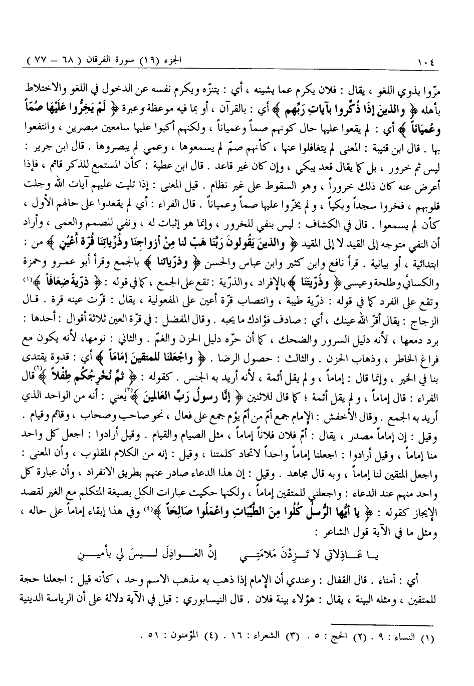 مَرُّوا بِذَوِي اللَّغْوِ، يُقَالُ: فُلَانٌ يُكْرَمُ عَمَّا يَشِينُهُ، أَيْ: يَتَنَزَّهُ وَيُكْرِمُ نَفْسَهُ عَنِ الدُّخُولِ فِي اللَّغْوِ وَالِاخْتِلَاطِ بِأَهْلِهِ وَالَّذِينَ إِذا ذُكِّرُوا بِآياتِ رَبِّهِمْ أَيْ: بِالْقُرْآنِ، أَوْ بِمَا فِيهِ مَوْعِظَةٌ وَعِبْرَةٌ لَمْ يَخِرُّوا عَلَيْها صُمًّا وَعُمْياناً أَيْ: لَمْ يَقَعُوا عَلَيْهَا حَالَ كَوْنِهِمْ صُمًّا وَعُمْيَانًا، وَلَكِنَّهُمْ أَكَبُّوا عَلَيْهَا سَامِعِينَ مُبْصِرِينَ، وَانْتَفَعُوا بِهَا. قَالَ ابْنُ قُتَيْبَةَ: الْمَعْنَى لَمْ يَتَغَافَلُوا عَنْهَا، كَأَنَّهُمْ صُمٌّ لَمْ يَسْمَعُوهَا، وَعُمْيٌ لَمْ يُبْصِرُوهَا. قَالَ ابْنُ جَرِيرٍ:
