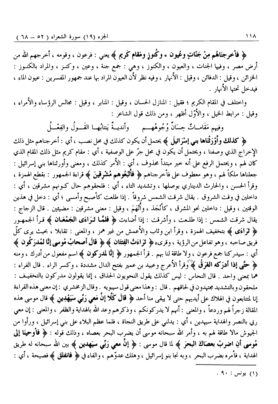 يُقَالُ شَرِقَتِ الشَّمْسُ: إِذَا طَلَعَتْ، وَأَشْرَقَتْ: إِذَا أَضَاءَتْ فَلَمَّا تَراءَا الْجَمْعانِ قرأ الجمهور تَراءَا بِتَخْفِيفِ الْهَمْزَةِ، وَقَرَأَ ابْنُ وَثَّابٍ وَالْأَعْمَشُ مِنْ غَيْرِ هَمْزٍ، وَالْمَعْنَى: تَقَابَلَا، بِحَيْثُ يَرَى كُلُّ فَرِيقٍ صَاحِبَهُ، وَهُوَ تَفَاعُلٌ مِنَ الرُّؤْيَةِ، وَقُرِئَ تَراءَتِ الْفِئَتانِ قالَ أَصْحابُ مُوسى إِنَّا لَمُدْرَكُونَ أَيْ: سَيُدْرِكُنَا جَمْعُ فِرْعَوْنَ، وَلَا طَاقَةَ لَنَا بِهِمْ. قَرَأَ الْجُمْهُورُ إِنَّا لَمُدْرَكُونَ اسْمُ مَفْعُولٍ مَنْ أَدْرَكَ، وَمِنْهُ حَتَّى إِذا أَدْرَكَهُ الْغَرَقُ «1» وَقَرَأَ الْأَعْرَجُ وَعُبَيْدُ بْنُ عُمَيْرٍ بِفَتْحِ الدَّالِ مُشَدَّدَةٍ وَكَسْرِ الرَّاءِ. قَالَ الْفَرَّاءُ: