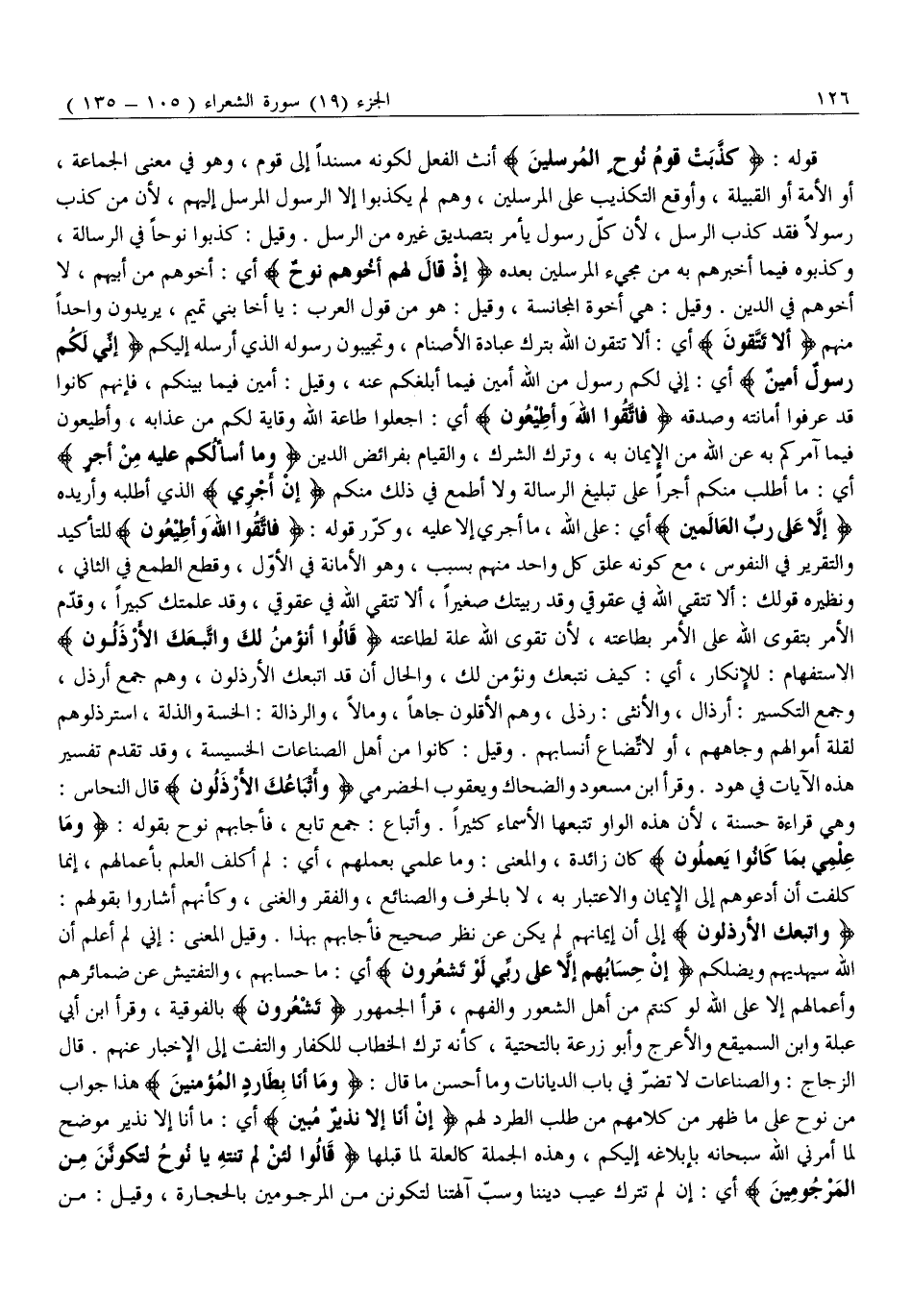 قَوْلُهُ: كَذَّبَتْ قَوْمُ نُوحٍ الْمُرْسَلِينَ أَنَّثَ الْفِعْلَ لِكَوْنِهِ مُسْنَدًا إِلَى قَوْمٍ، وَهُوَ فِي مَعْنَى الْجَمَاعَةِ، أَوِ الْأُمَّةِ أَوِ الْقَبِيلَةِ، وَأَوْقَعَ التَّكْذِيبَ عَلَى الْمُرْسَلِينَ، وَهُمْ لَمْ يُكَذِّبُوا إِلَّا الرَّسُولَ الْمُرْسَلَ إِلَيْهِمْ، لِأَنَّ مَنْ كَذَّبَ رَسُولًا فَقَدْ كَذَّبَ الرُّسُلَ، لِأَنَّ كُلَّ رَسُولٍ يَأْمُرُ بِتَصْدِيقِ غَيْرِهِ مِنَ الرُّسُلِ. وَقِيلَ: كَذَّبُوا نُوحًا فِي الرِّسَالَةِ، وَكَذَّبُوهُ فِيمَا أَخْبَرَهُمْ بِهِ مِنْ مَجِيءِ الْمُرْسَلِينَ بَعْدَهُ إِذْ قالَ لَهُمْ أَخُوهُمْ نُوحٌ أَيْ: أَخُوهُمْ مِنْ أَبِيهِمْ، لَا أَخُوهُمْ فِي الدِّينِ. وَقِيلَ: هِيَ أُخُوَّةُ الْمُجَانَسَةِ، وَقِيلَ: هُوَ مِنْ قَوْلِ الْعَرَبِ: يَا أَخَا بَنِي تَمِيمٍ، يُرِيدُونَ وَاحِدًا مِنْهُمْ أَلا تَتَّقُونَ أَيْ: أَلَا تَتَّقُونَ اللَّهَ بِتَرْكِ عِبَادَةِ الْأَصْنَامِ، وَتُجِيبُونَ رَسُولَهُ الَّذِي أَرْسَلَهُ إِلَيْكُمْ إِنِّي لَكُمْ رَسُولٌ أَمِينٌ أَيْ: إِنِّي لَكُمْ رَسُولٌ مِنَ اللَّهِ أَمِينٌ فِيمَا أُبَلِّغُكُمْ عَنْهُ، وَقِيلَ: أَمِينٌ فِيمَا بَيْنَكُمْ، فَإِنَّهُمْ كَانُوا قَدْ عَرَفُوا أَمَانَتَهُ وَصِدْقَهُ فَاتَّقُوا اللَّهَ وَأَطِيعُونِ أَيِ: اجْعَلُوا طَاعَةَ اللَّهِ وِقَايَةً لَكُمْ مِنْ عَذَابِهِ، وَأَطِيعُونِ فِيمَا آمُرُكُمْ بِهِ عَنِ اللَّهِ مِنَ الْإِيمَانِ بِهِ، وَتَرْكِ الشِّرْكِ، والقيام بفرائض الدين وَما أَسْئَلُكُمْ عَلَيْهِ مِنْ أَجْرٍ أَيْ: مَا أَطْلُبُ مِنْكُمْ أَجْرًا عَلَى تَبْلِيغِ الرِّسَالَةِ وَلَا أَطْمَعُ فِي ذَلِكَ مِنْكُمْ إِنْ أَجْرِيَ الَّذِي أَطْلُبُهُ وَأُرِيدُهُ إِلَّا عَلى رَبِّ الْعالَمِينَ أي: على الله، مَا أَجْرِي إِلَّا عَلَيْهِ، وَكَرَّرَ قَوْلُهُ: فَاتَّقُوا اللَّهَ وَأَطِيعُونِ لِلتَّأْكِيدِ وَالتَّقْرِيرِ فِي النُّفُوسِ، مَعَ كَوْنِهِ عَلَّقَ كُلَّ وَاحِدٍ مِنْهُمْ بِسَبَبٍ، وَهُوَ الْأَمَانَةُ فِي الْأَوَّلِ، وَقَطْعُ الطَّمَعِ فِي الثَّانِي، وَنَظِيرُهُ قَوْلُكَ: أَلَا تَتَّقِي اللَّهَ فِي عُقُوقِي وَقَدْ رَبَّيْتُكَ صَغِيرًا، أَلَا تَتَّقِي اللَّهَ فِي عقوقي، وقد علمتك كبيرا، وقدّم الْأَمْرُ بِتَقْوَى اللَّهِ عَلَى الْأَمْرِ بِطَاعَتِهِ، لِأَنَّ تَقْوَى اللَّهِ عِلَّةٌ لِطَاعَتِهِ قالُوا أَنُؤْمِنُ لَكَ وَاتَّبَعَكَ الْأَرْذَلُونَ الِاسْتِفْهَامُ: لِلْإِنْكَارِ، أَيْ: كَيْفَ نَتَّبِعُكَ وَنُؤْمِنُ لَكَ، وَالْحَالُ أَنَّ قَدِ اتَّبَعَكَ الْأَرْذَلُونَ، وَهُمْ جَمْعُ أَرْذَلَ، وَجَمْعُ التَّكْسِيرِ: أَرْذَالٌ، وَالْأُنْثَى: رُذْلَى، وَهُمُ الْأَقَلُّونَ جَاهًا، وَمَالًا، وَالرَّذَالَةُ: الْخِسَّةُ والذلة، استرذلوهم لقلة أموالهم وجاههم، أو لاتّضاع أَنْسَابُهُمْ. وَقِيلَ: كَانُوا مِنْ أَهْلِ الصِّنَاعَاتِ الْخَسِيسَةِ، وَقَدْ تَقَدَّمَ تَفْسِيرُ هَذِهِ الْآيَاتِ فِي هُودٍ. وقرأ ابن مسعود والضحاك ويعقوب الحضرمي «وأتباعك الْأَرْذَلُونَ» قَالَ النَّحَّاسُ: