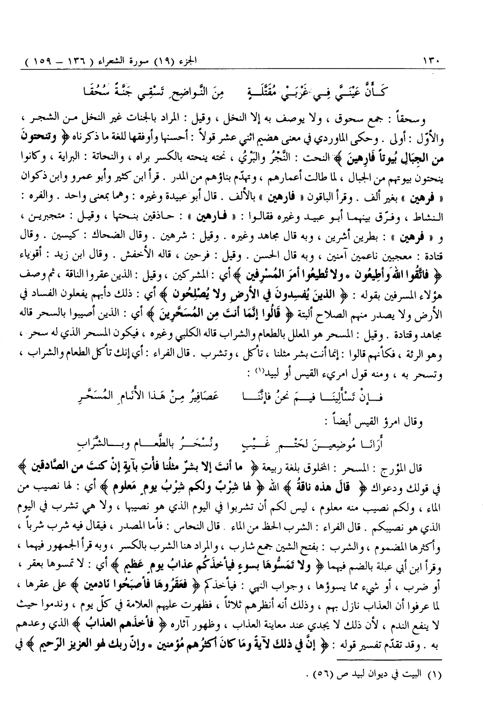 النَّشَاطُ، وَفَرَّقَ بَيْنَهُمَا أَبُو عُبَيْدٍ وَغَيْرُهُ فَقَالُوا: «فَارِهِينَ» : حَاذِقِينَ بِنَحْتِهَا، وَقِيلَ: مُتَجَبِّرِينَ، وَ «فَرِهِينَ» : بَطِرِينَ أَشِرِينَ، وَبِهِ قَالَ مُجَاهِدٌ وَغَيْرُهُ. وَقِيلَ: شَرِهِينَ. وَقَالَ الضَّحَّاكُ: كَيِّسِيِنَ. وَقَالَ قَتَادَةُ: مُعْجَبِينَ نَاعِمِينَ آمِنِينَ، وَبِهِ قَالَ الْحَسَنُ. وَقِيلَ: فَرِحِينَ، قَالَهُ الْأَخْفَشُ. وَقَالَ ابْنُ زَيْدٍ: أَقْوِيَاءُ فَاتَّقُوا اللَّهَ وَأَطِيعُونِ وَلا تُطِيعُوا أَمْرَ الْمُسْرِفِينَ أَيِ: الْمُشْرِكِينَ، وَقِيلَ: الَّذِينَ عَقَرُوا النَّاقَةَ، ثُمَّ وَصَفَ هَؤُلَاءِ الْمُسْرِفِينَ بِقَوْلِهِ: الَّذِينَ يُفْسِدُونَ فِي الْأَرْضِ وَلا يُصْلِحُونَ أَيْ: ذَلِكَ دَأْبُهُمْ يَفْعَلُونَ الْفَسَادَ فِي الْأَرْضِ وَلَا يَصْدُرُ مِنْهُمُ الصَّلَاحُ الْبَتَّةَ قالُوا إِنَّما أَنْتَ مِنَ الْمُسَحَّرِينَ أَيِ: الَّذِينَ أُصِيبُوا بِالسِّحْرِ قَالَهُ مُجَاهِدٌ وَقَتَادَةُ. وَقِيلَ: الْمُسَحَّرُ هُوَ الْمُعَلَّلُ بِالطَّعَامِ وَالشَّرَابِ قَالَهُ الْكَلْبِيُّ وَغَيْرُهُ، فَيَكُونُ الْمُسَحَّرُ الَّذِي لَهُ سَحْرٌ، وَهُوَ الرِّئَةُ، فَكَأَنَّهُمْ قَالُوا: إِنَّمَا أَنْتَ بَشَرٌ مِثْلُنَا، تَأْكُلُ، وَتَشْرَبُ. قَالَ الْفَرَّاءُ: أَيْ إِنَّكَ تَأْكُلُ الطَّعَامَ وَالشَّرَابَ، وَتُسَحَّرُ بِهِ، وَمِنْهُ قَوْلُ امْرِئِ الْقَيْسِ أَوْ لَبِيَدٍ «1» :