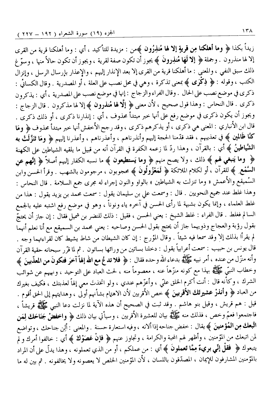 زِيدًا بِكَذَا وَما أَهْلَكْنا مِنْ قَرْيَةٍ إِلَّا لَها مُنْذِرُونَ مِنْ: مَزِيدَةٌ لِلتَّأْكِيدِ، أَيْ: وَمَا أَهْلَكْنَا قَرْيَةً مِنَ الْقُرَى إِلَّا لَهَا مُنْذِرُونَ. وَجُمْلَةُ إِلَّا لَها مُنْذِرُونَ يَجُوزُ أَنْ تَكُونَ صِفَةً لِقَرْيَةٍ، وَيَجُوزُ أَنْ تَكُونَ حَالًا مِنْهَا، وَسَوَّغَ ذَلِكَ سَبْقُ النَّفْيِ، وَالْمَعْنَى: مَا أَهْلَكْنَا قَرْيَةً مِنَ الْقُرَى إِلَّا بَعْدَ الْإِنْذَارِ إِلَيْهِمْ، وَالْإِعْذَارِ بِإِرْسَالِ الرُّسُلِ، وَإِنْزَالِ الْكُتُبِ، وَقَوْلُهُ: ذِكْرى بِمَعْنَى تَذْكِرَةٍ، وَهِيَ فِي مَحَلِّ نَصْبٍ عَلَى الْعِلَّةِ، أَوِ الْمَصْدَرِيَّةِ. وَقَالَ الْكِسَائِيُّ: