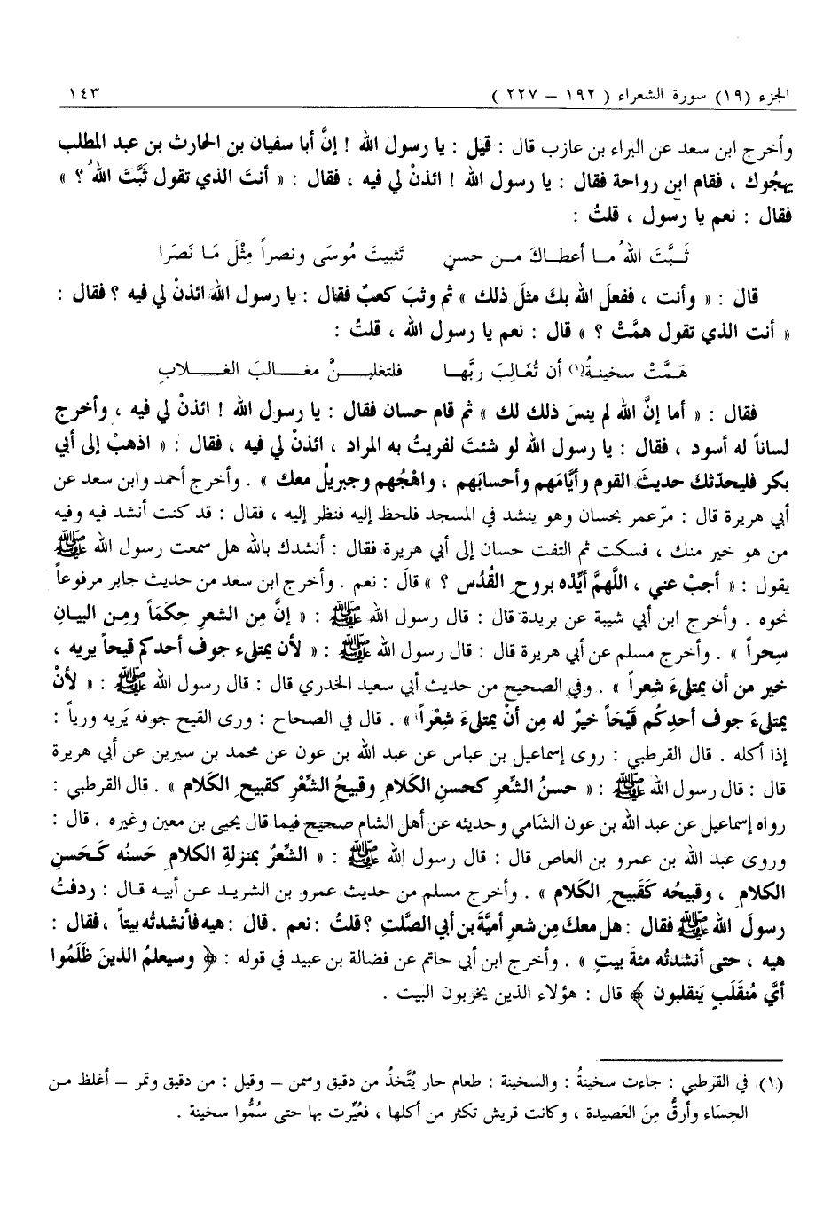 فَقَالَ: «أَمَا إِنَّ اللَّهَ لَمْ يَنْسَ ذَلِكَ لَكَ» ثُمَّ قَامَ حَسَّانُ فَقَالَ: يَا رَسُولَ اللَّهِ! ائْذَنْ لِي فِيهِ، وَأَخْرَجَ لِسَانًا لَهُ أَسْوَدَ، فَقَالَ: يَا رَسُولَ اللَّهِ لَوْ شِئْتَ لَفَرَيْتُ بِهِ الْمُرَادَ، ائْذَنْ لِي فِيهِ، فَقَالَ: «اذْهَبْ إِلَى أَبِي بَكْرٍ فَلْيُحَدِّثْكَ حَدِيثَ الْقَوْمِ وَأَيَّامَهُمْ وَأَحْسَابَهُمْ، وَاهْجُهُمْ وَجِبْرِيلُ مَعَكَ» . وَأَخْرَجَ أَحْمَدُ وَابْنُ سَعْدٍ عَنْ أَبِي هُرَيْرَةَ قَالَ: مَرَّ عُمَرُ بِحَسَّانَ وَهُوَ يُنْشِدُ فِي الْمَسْجِدِ فَلَحَظَ إِلَيْهِ فَنَظَرَ إِلَيْهِ، فَقَالَ: قَدْ كُنْتُ أُنْشِدُ فِيهِ وَفِيهِ مَنْ هُوَ خَيْرٌ مِنْكَ، فَسَكَتَ ثُمَّ الْتَفَتَ حَسَّانُ إِلَى أَبِي هُرَيْرَةَ فَقَالَ: أُنْشِدُكَ بِاللَّهِ هَلْ سَمِعَتْ رَسُولَ اللَّهِ صَلَّى اللَّهُ عَلَيْهِ وَسَلَّمَ يَقُولُ: «أَجِبْ عَنِّي، اللَّهُمَّ أَيِّدْهُ بِرُوحِ الْقُدُسِ؟» قَالَ: نَعَمْ. وَأَخْرَجَ ابْنُ سَعْدٍ مِنْ حَدِيثِ جَابِرٍ مَرْفُوعًا نَحْوَهُ. وَأَخْرَجَ ابْنُ أَبِي شَيْبَةَ عَنْ بُرَيْدَةَ قَالَ: قَالَ رَسُولُ اللَّهِ صَلَّى اللَّهُ عَلَيْهِ وَسَلَّمَ: «إِنَّ مِنَ الشِّعْرِ حِكَمًا وَمِنَ الْبَيَانِ سحرا» . وَأَخْرَجَ مُسْلِمٍ عَنْ أَبِي هُرَيْرَةَ قَالَ: قَالَ رَسُولُ اللَّهِ صلّى الله عليه وَسَلَّمَ: «لِأَنْ يَمْتَلِئَ جَوْفُ أَحَدِكُمْ قَيْحًا يَرِيهِ، خَيْرٌ مِنْ أَنْ يَمْتَلِئَ شِعْرًا» . وَفِي الصَّحِيحِ مِنْ حَدِيثِ أَبِي سَعِيدٍ الْخُدْرِيِّ قَالَ: قَالَ رَسُولُ اللَّهِ صَلَّى اللَّهُ عَلَيْهِ وَسَلَّمَ: «لِأَنْ يَمْتَلِئَ جَوْفُ أَحَدِكُمْ قَيْحًا خَيْرٌ لَهُ مِنْ أَنْ يَمْتَلِئَ شِعْرًا» . قَالَ فِي الصحاح: ورى الْقَيْحُ جَوْفَهُ يَرِيهِ وَرَيًّا: