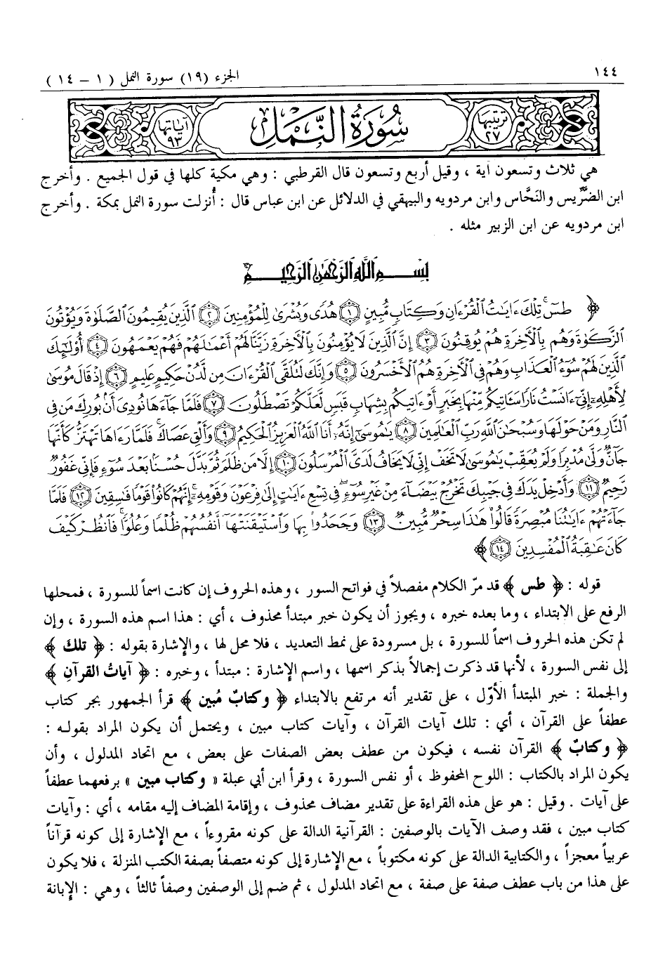 قَوْلُهُ: طس قَدْ مَرَّ الْكَلَامُ مُفَصَّلًا فِي فَوَاتِحِ السُّوَرِ، وَهَذِهِ الْحُرُوفُ إِنْ كَانَتِ اسْمًا لِلسُّورَةِ، فَمَحَلُّهَا الرَّفْعُ عَلَى الِابْتِدَاءِ، وَمَا بَعْدَهُ خَبَرُهُ، وَيَجُوزُ أَنْ يَكُونَ خَبَرَ مُبْتَدَأٍ مَحْذُوفٍ، أَيْ: هَذَا اسْمُ هَذِهِ السُّورَةِ، وَإِنْ لَمْ تَكُنْ هَذِهِ الْحُرُوفُ اسْمًا لِلسُّورَةِ، بَلْ مَسْرُودَةً عَلَى نَمَطِ التَّعْدِيدِ، فَلَا مَحَلَّ لَهَا، وَالْإِشَارَةُ بِقَوْلِهِ: تِلْكَ إِلَى نَفْسِ السُّورَةِ، لِأَنَّهَا قَدْ ذُكِرَتْ إِجْمَالًا بِذِكْرِ اسْمِهَا، وَاسْمُ الْإِشَارَةِ: مُبْتَدَأٌ، وَخَبَرُهُ: آياتُ الْقُرْآنِ وَالْجُمْلَةُ: خَبَرُ الْمُبْتَدَأِ الْأَوَّلِ، عَلَى تَقْدِيرِ أَنَّهُ مُرْتَفِعٌ بِالِابْتِدَاءِ وَكِتابٍ مُبِينٍ قَرَأَ الْجُمْهُورُ بِجَرِّ كِتَابٍ عَطْفًا عَلَى الْقُرْآنِ، أَيْ: تِلْكَ آيَاتُ الْقُرْآنِ، وَآيَاتُ كِتَابٍ مُبِينٍ، وَيُحْتَمَلُ أَنْ يَكُونَ الْمُرَادُ بِقَوْلِهِ: