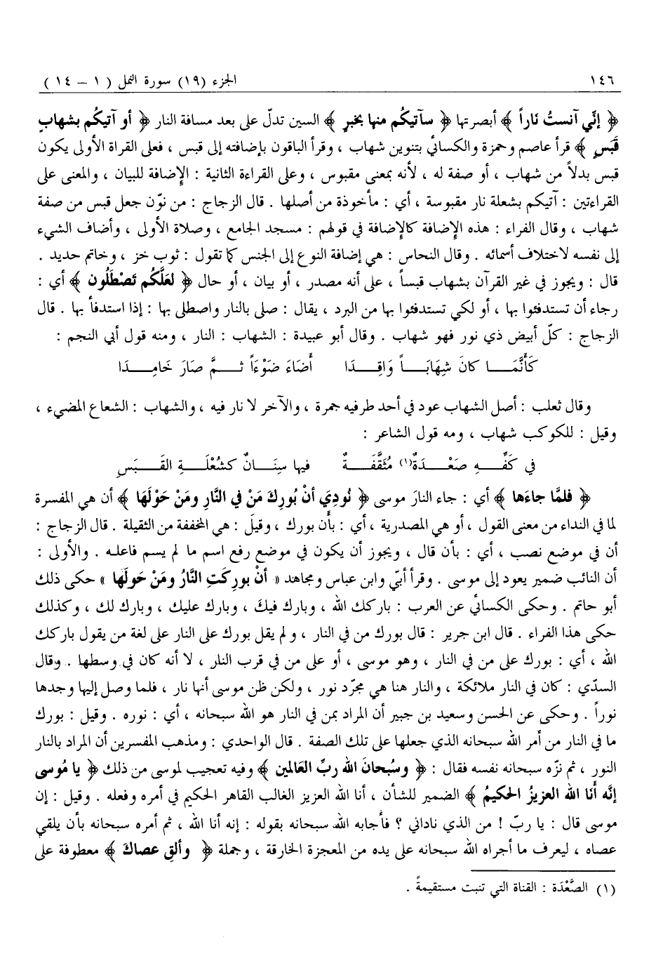 إِنِّي آنَسْتُ نَارًا أَبْصَرْتُهَا سَآتِيكُمْ مِنْها بِخَبَرٍ السِّينُ تَدُلُّ عَلَى بُعْدِ مَسَافَةِ النَّارِ أَوْ آتِيكُمْ بِشِهابٍ قَبَسٍ قَرَأَ عَاصِمٌ وَحَمْزَةُ وَالْكِسَائِيُّ بِتَنْوِينِ شِهَابٍ، وَقَرَأَ الْبَاقُونَ بِإِضَافَتِهِ إِلَى قَبَسٍ، فَعَلَى الْقِرَاءَةِ الْأُولَى يَكُونُ قَبَسٌ بَدَلًا مِنْ شِهَابٍ، أَوْ صِفَةً لَهُ، لِأَنَّهُ بِمَعْنَى مَقْبُوسٍ، وعلى الْقِرَاءَةِ الثَّانِيَةِ: الْإِضَافَةُ لِلْبَيَانِ، وَالْمَعْنَى عَلَى الْقِرَاءَتَيْنِ: آتِيكُمْ بِشُعْلَةِ نَارٍ مَقْبُوسَةٍ، أَيْ: مَأْخُوذَةٍ مِنْ أَصْلِهَا. قَالَ الزَّجَّاجُ: مَنْ نَوَّنَ جَعَلَ قَبَسٍ مِنْ صِفَةِ شِهَابٍ، وَقَالَ الْفَرَّاءُ: هَذِهِ الْإِضَافَةُ كَالْإِضَافَةِ فِي قَوْلِهِمْ: مَسْجِدُ الْجَامِعِ، وَصَلَاةُ الْأُولَى، وأضاف الشَّيْءَ إِلَى نَفْسِهِ لِاخْتِلَافِ أَسْمَائِهِ. وَقَالَ النَّحَّاسُ: هِيَ إِضَافَةُ النَّوْعِ إِلَى الْجِنْسِ كَمَا تَقُولُ: ثَوْبُ خَزٍّ، وَخَاتَمُ حَدِيدٍ.
